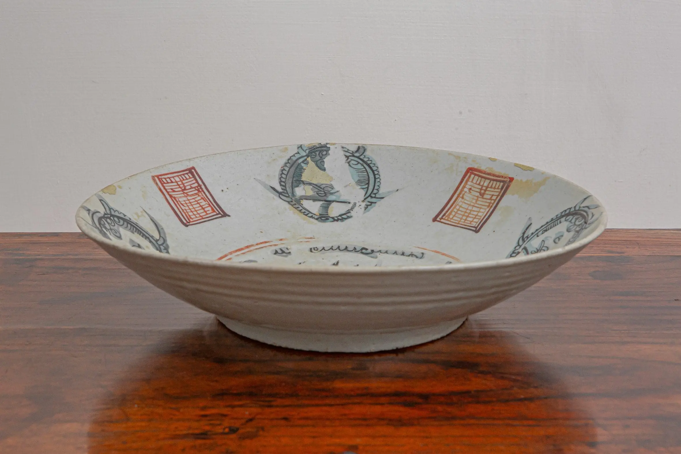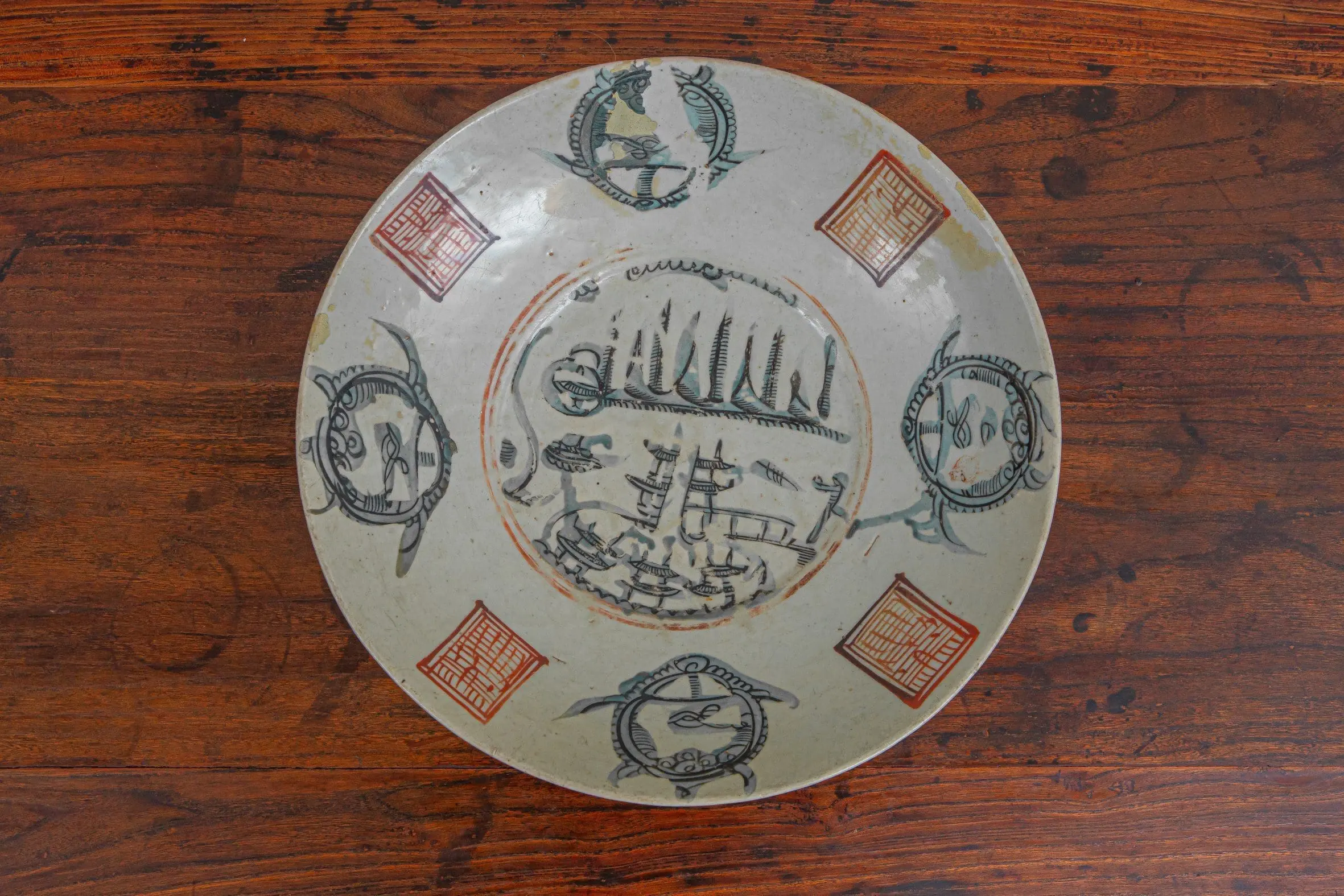 | Description | Large swatow plate with slightly worn polychrome green and orange abstract painting, with circles and squares in overglaze enamel, loosely painted over in semi-translucent enamel. |