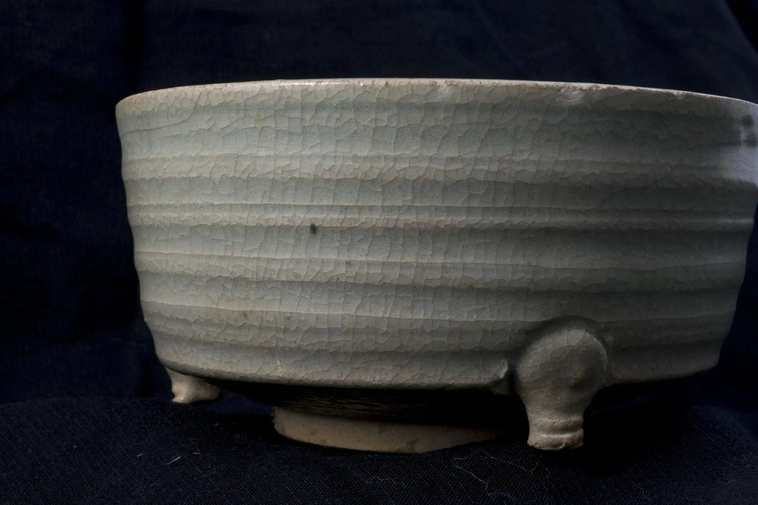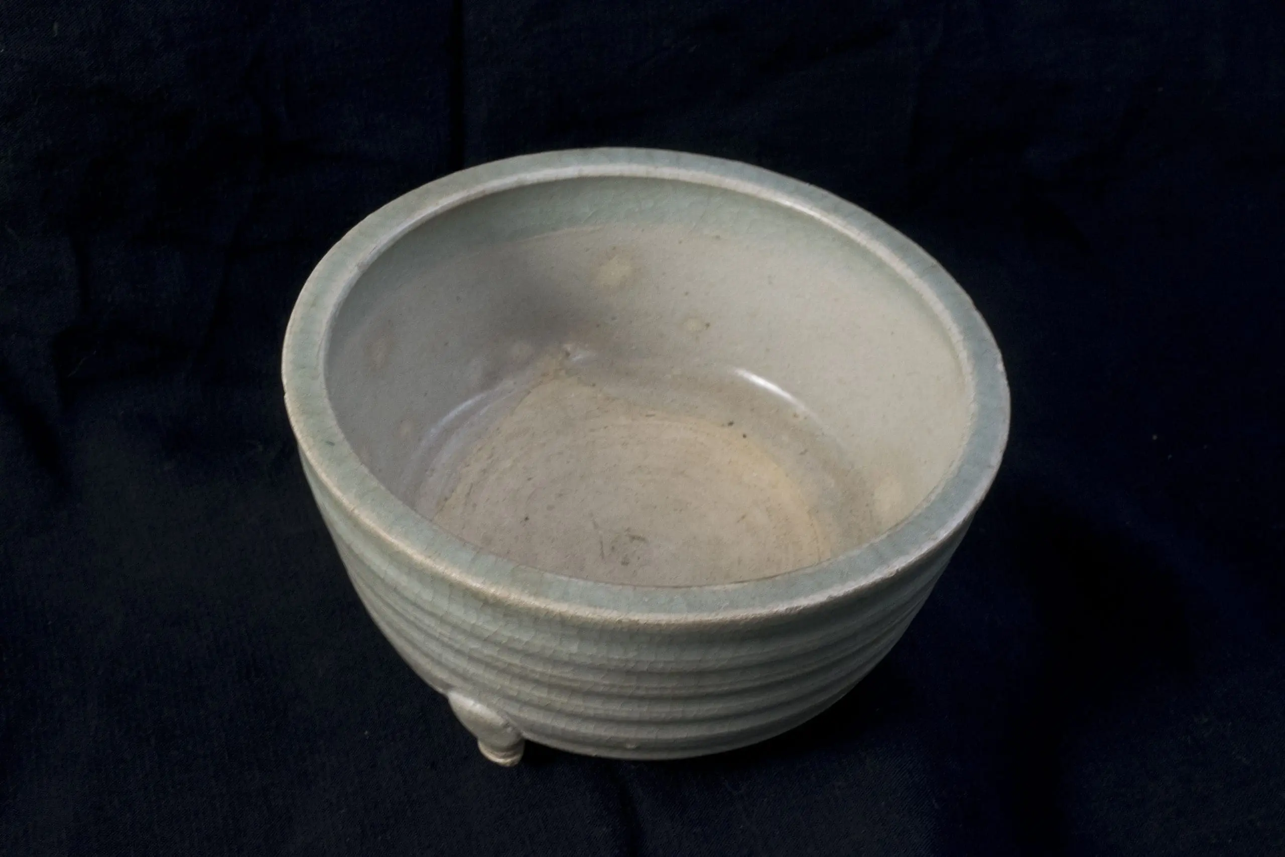 | Description | Song period tripod bowl with a finely potted white body, encircled by carved horizontal lines along the sides. Covered in a translucent light celadon glaze with subtle crackle, the vessel rests on three small supports. |