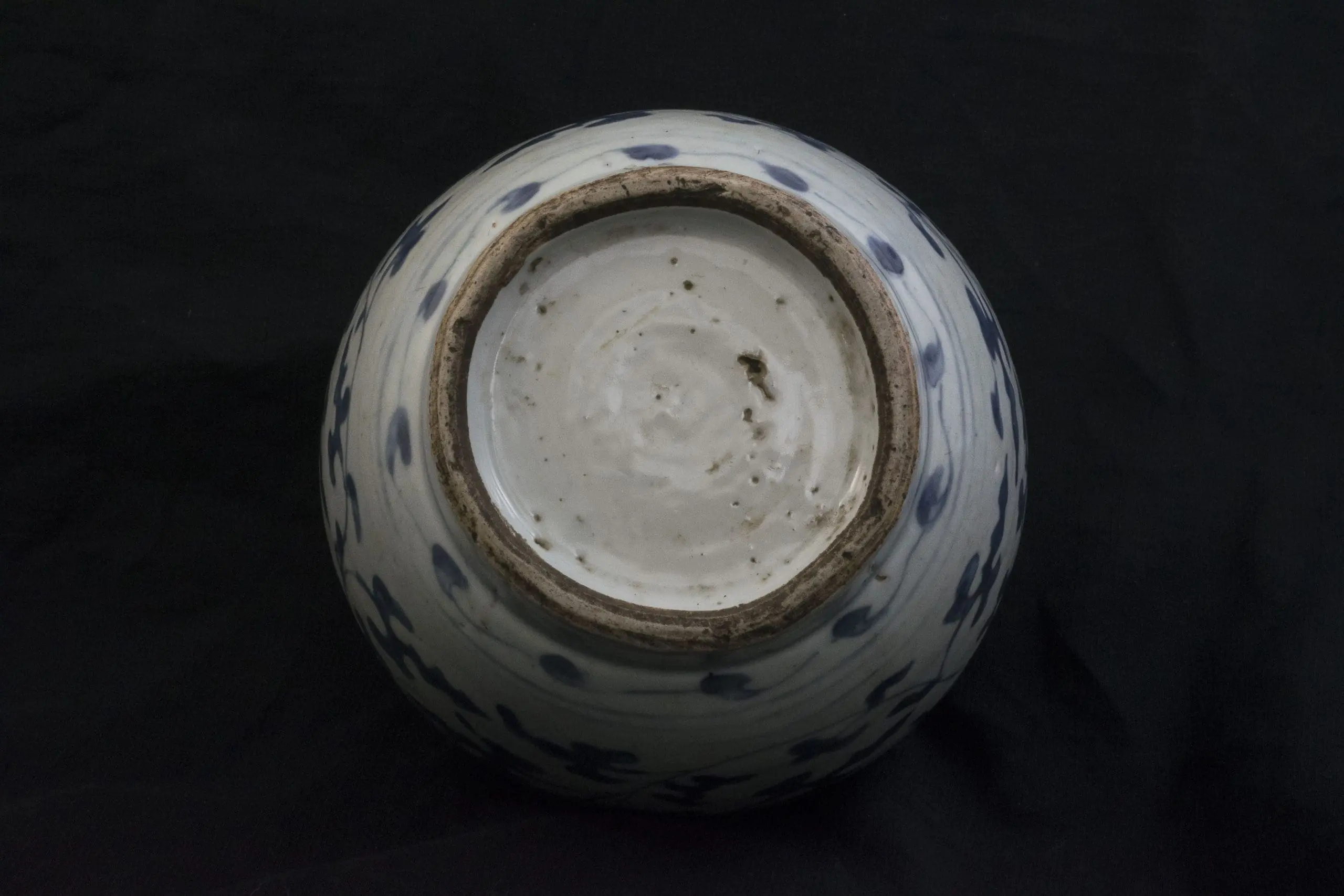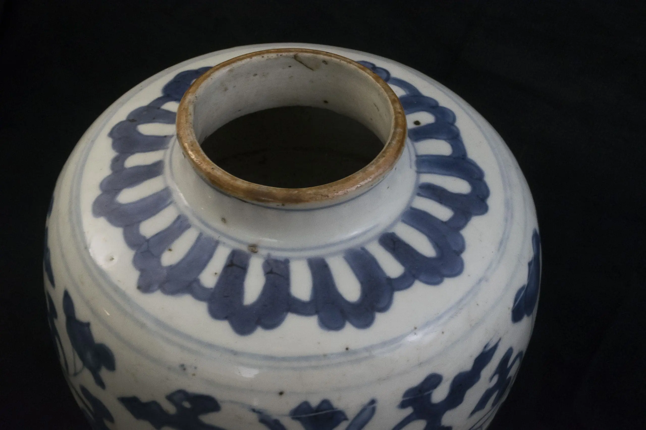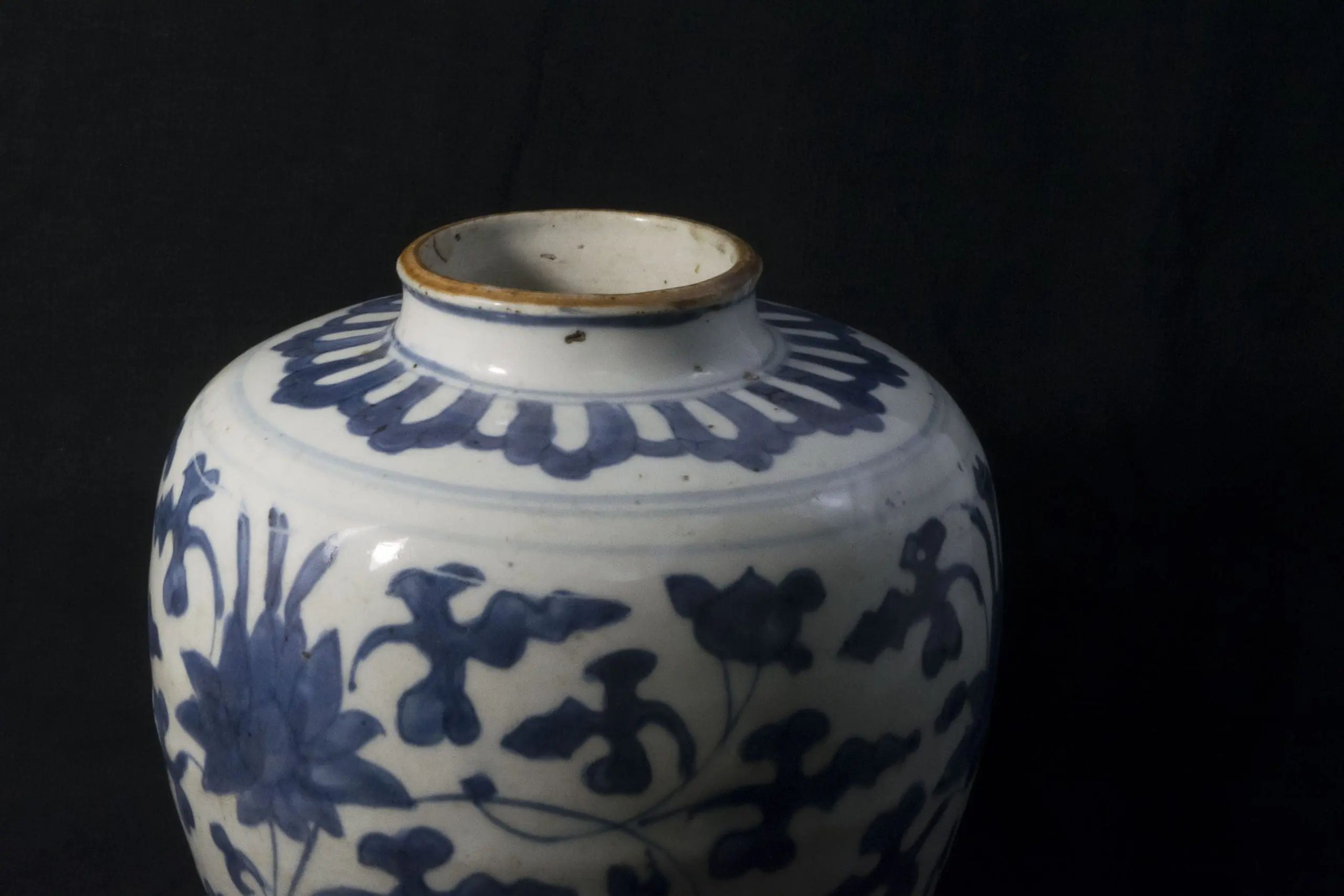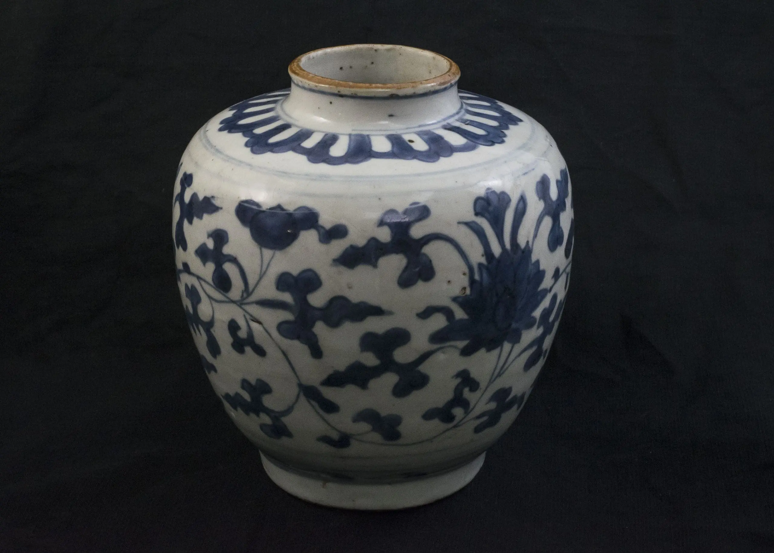 | Description | Early Qing jarlet with a slightly flared lip, decorated in underglaze cobalt blue. Flowing lotus flowers and scrolling foliage encircle the rounded body, with petal motifs accenting the shoulder. |