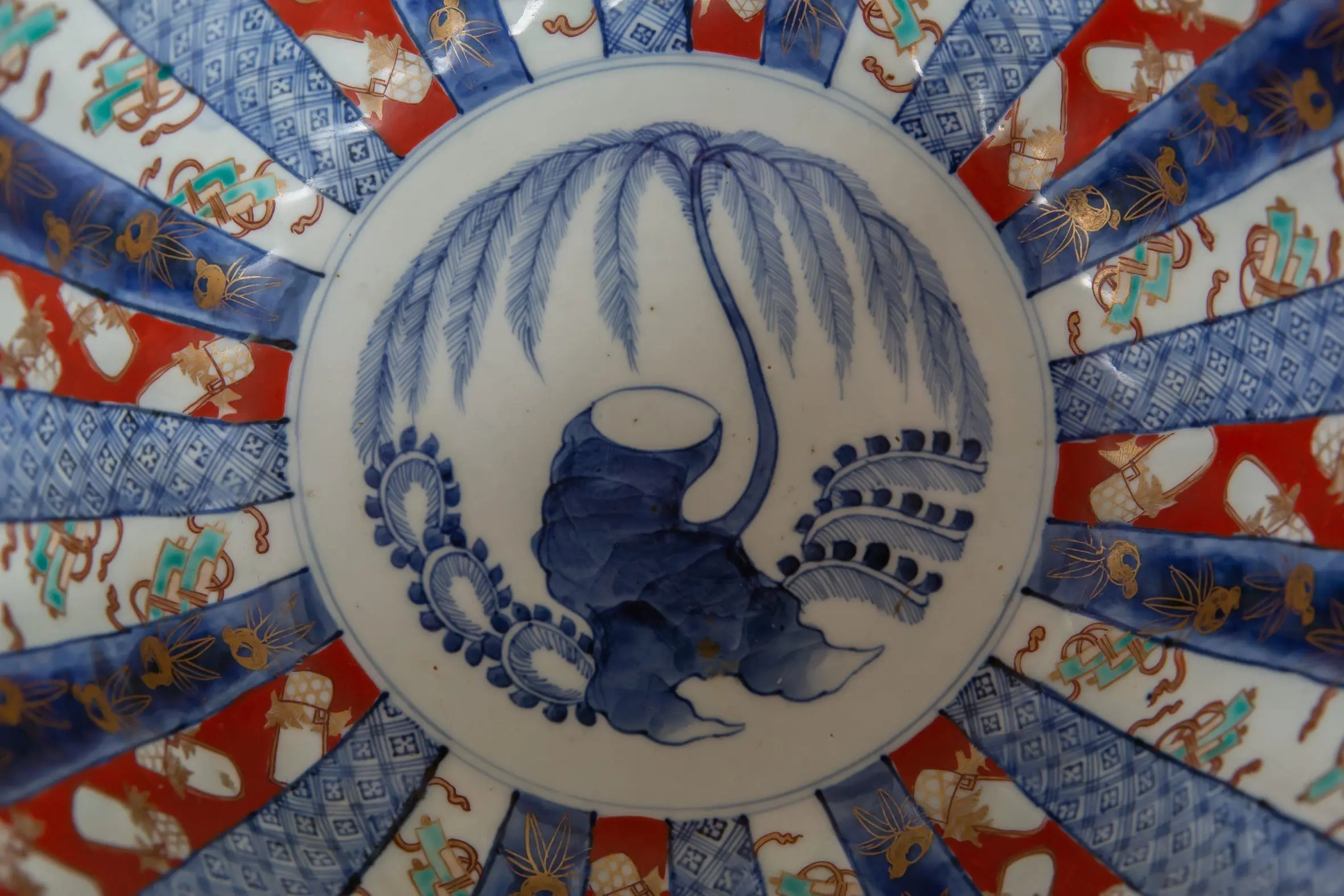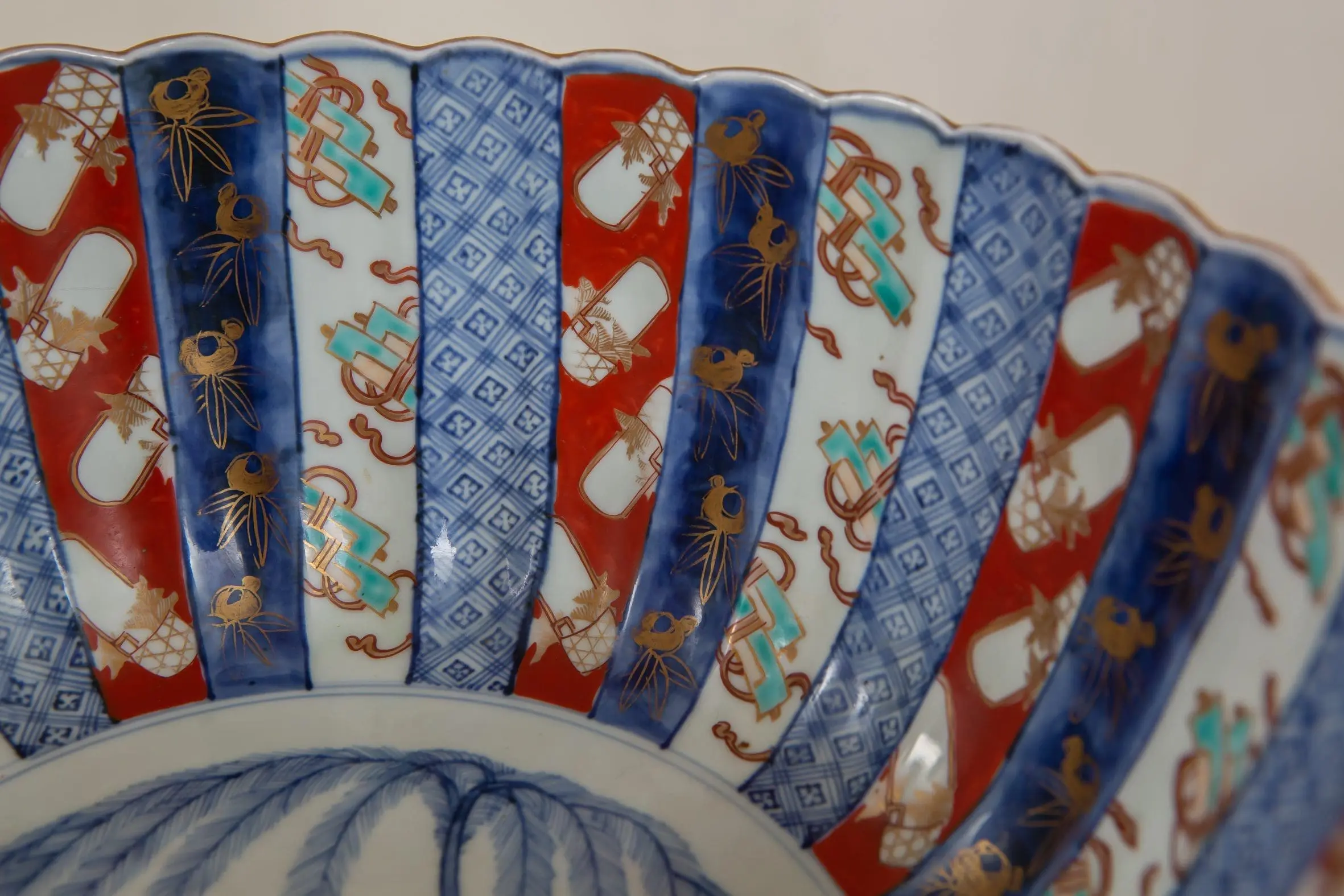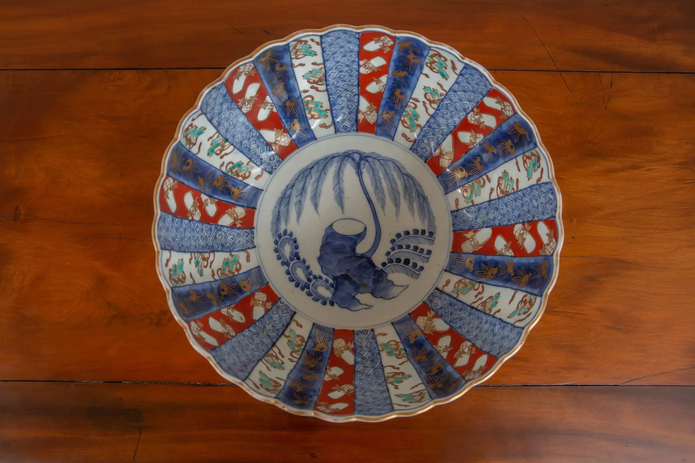 | Description | Large Japanese Imari bowl, mid-1800s, with tall ribbed sides and scalloped rim. Decorated in bold panels of red, blue, and green with gilded floral and geometric motifs. |