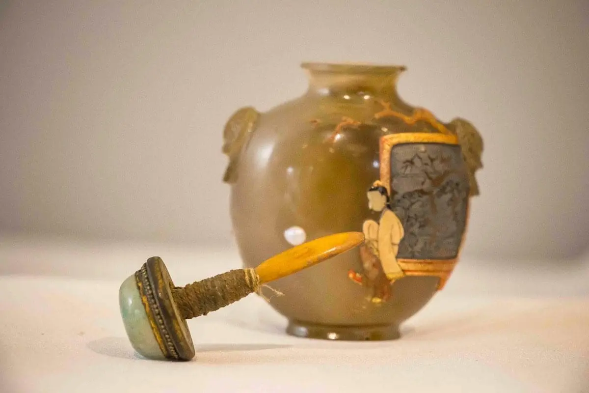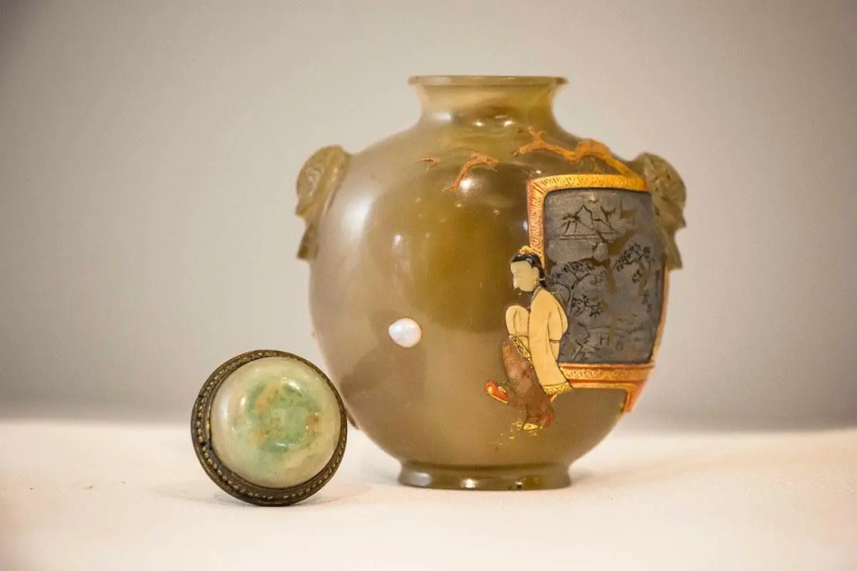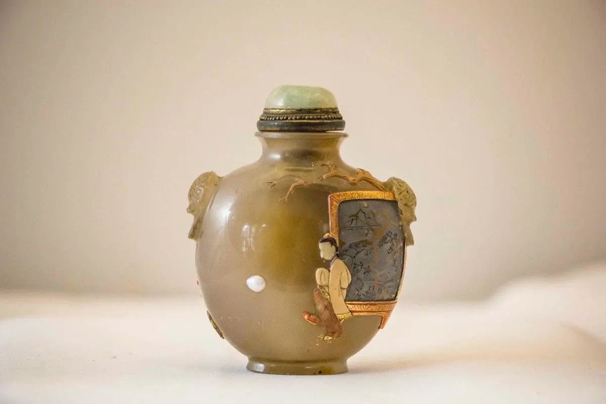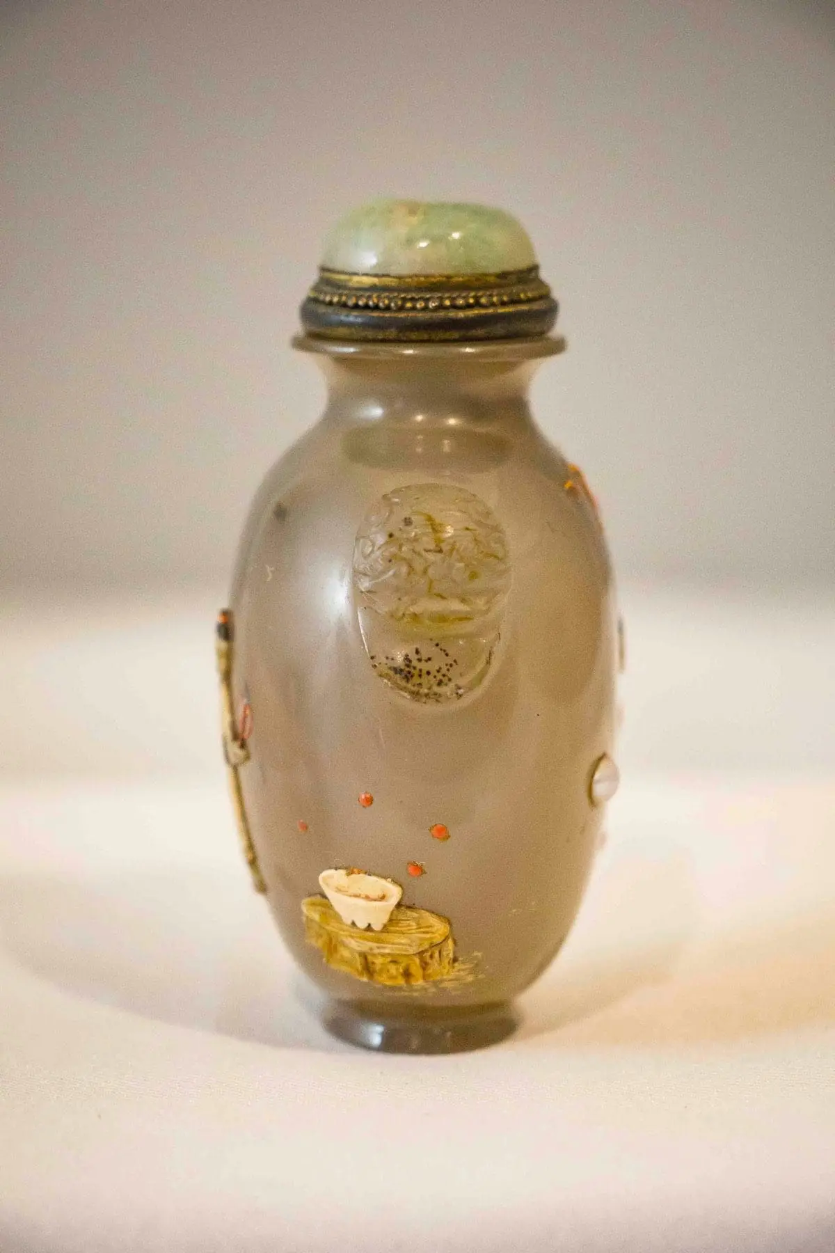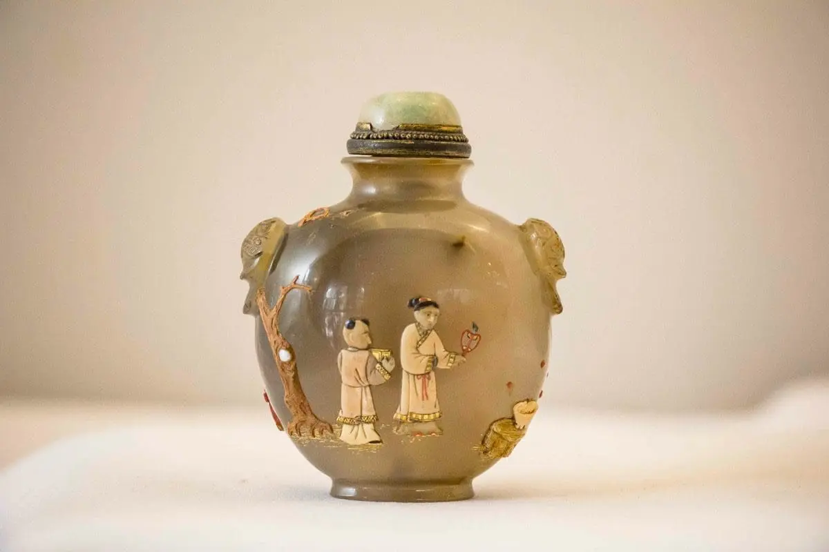 | Description | An agate enamel snuff bottle of women and children with applied enamel decoration and jade stopper |