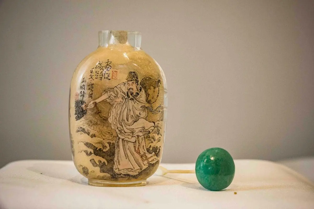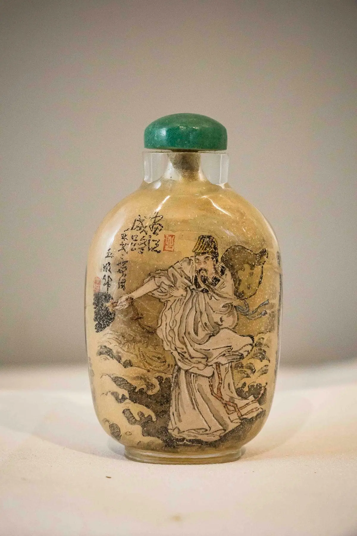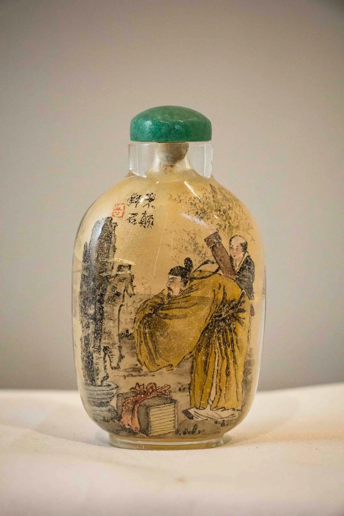 | Description | Inside-painted glass snuff bottle depicting scholarly figures in dynamic landscape scenes, enhanced with calligraphy and seal marks in literati style. Soft ochre background gives depth to the ink and watercolor interior brushwork. Completed with a green jade stopper. |