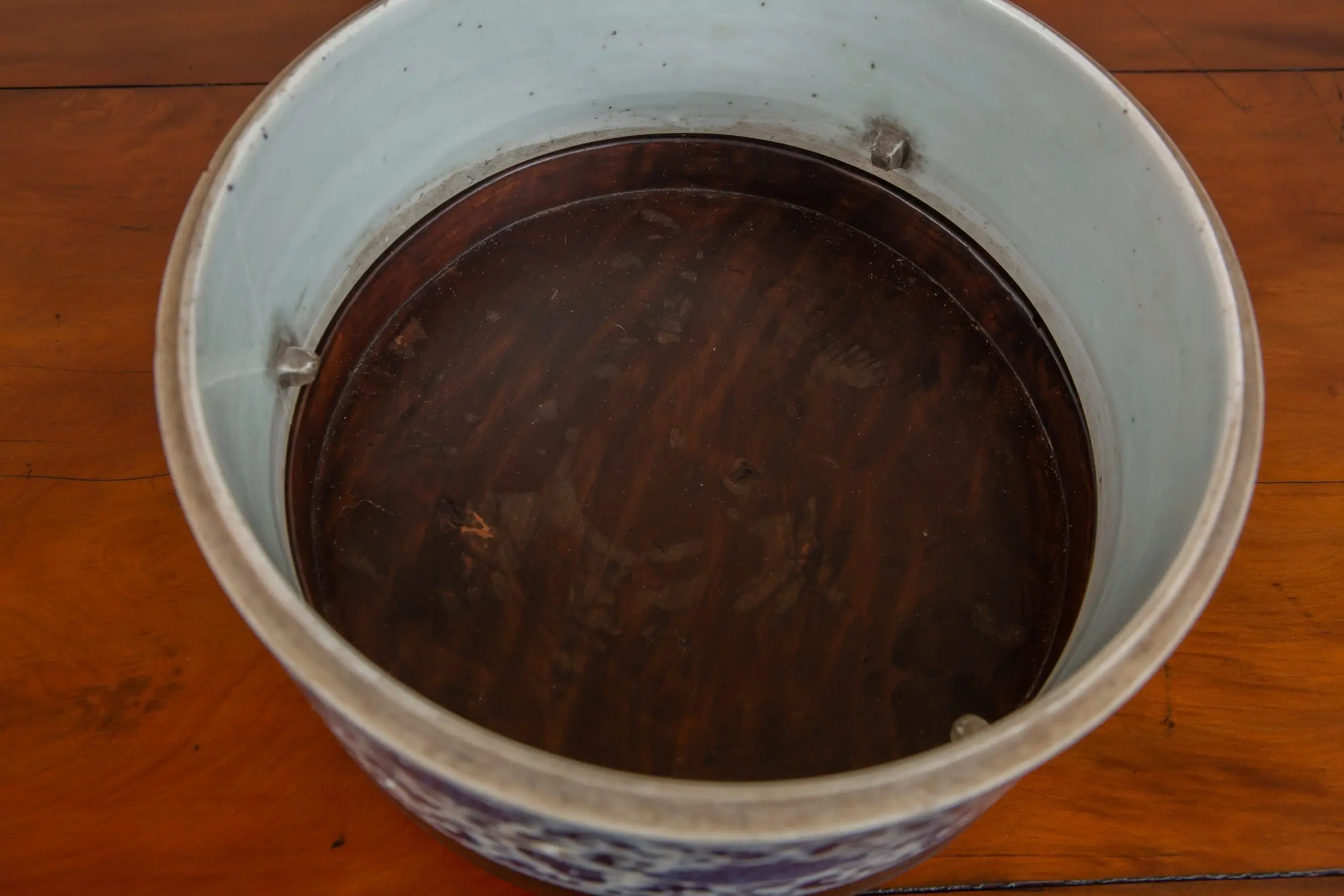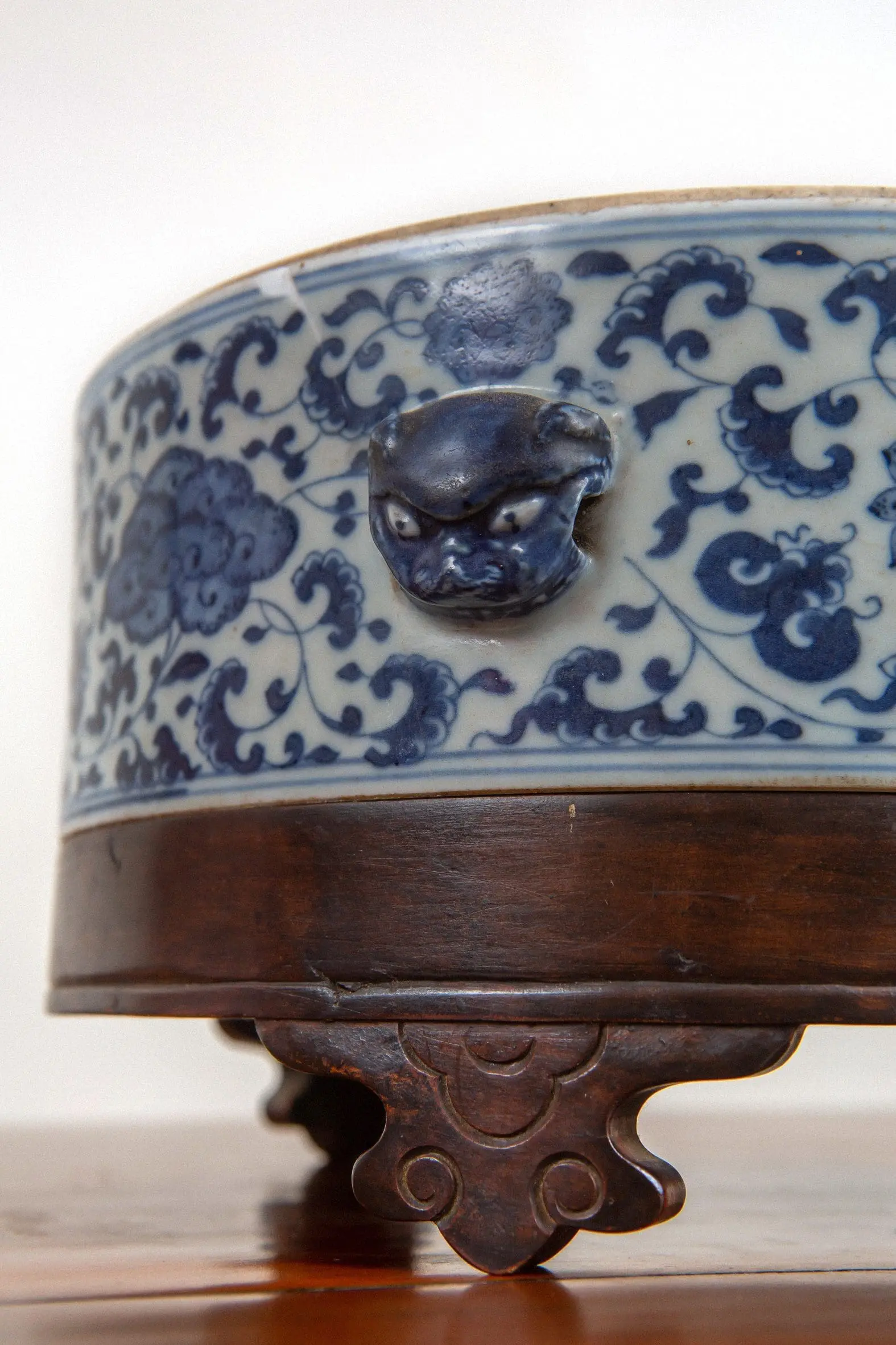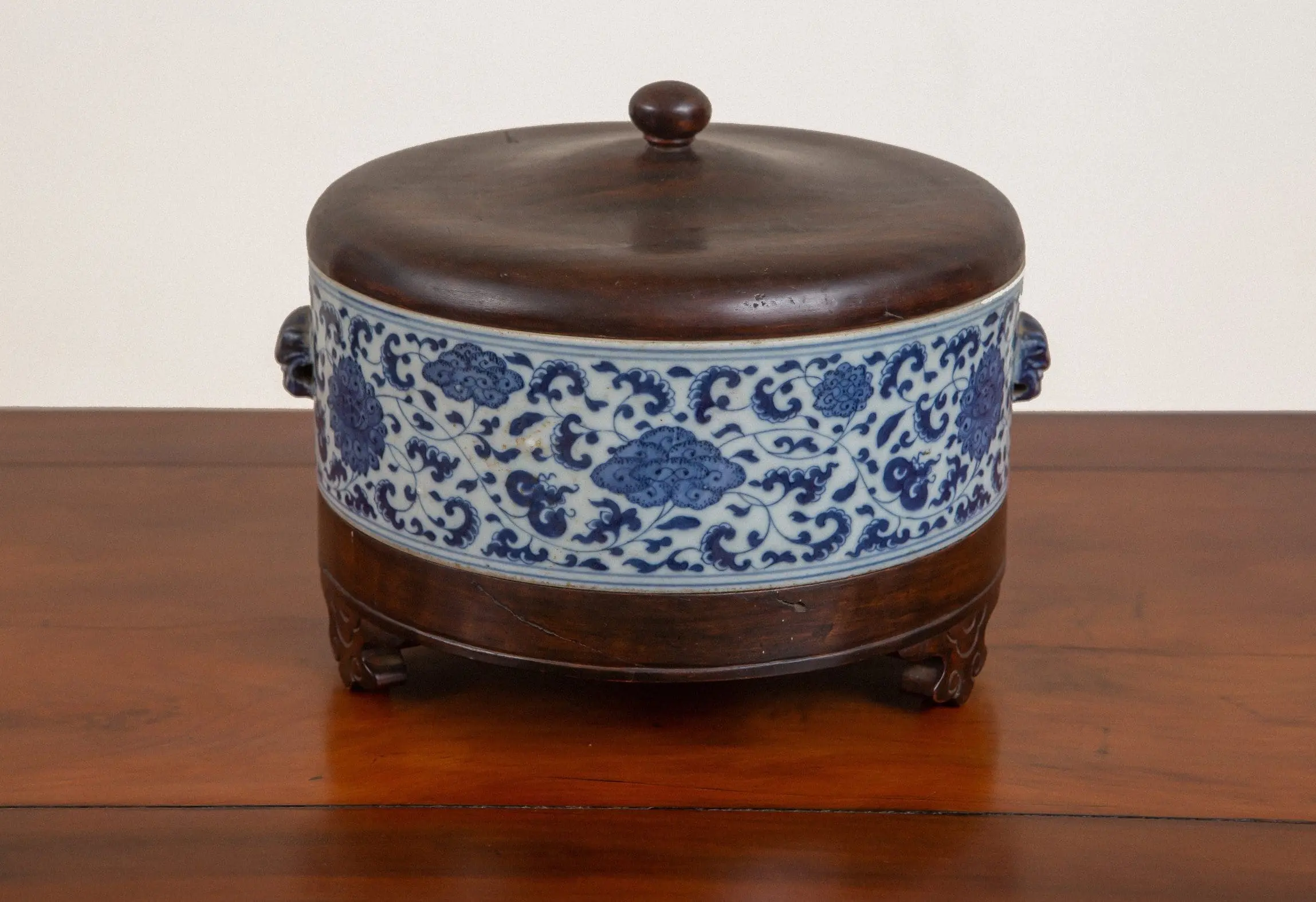 | Description | Blue and white porcelain box with porcelain ring with underglaze lotus paintings, Blackwood base and lid. The lotus is significant in Chinese culture because it rises from the mud and blooms in exquisite beauty. It symbolizes perfection and purity of both the heart and mind. It also represents long life and honor. Slight crack on lip |