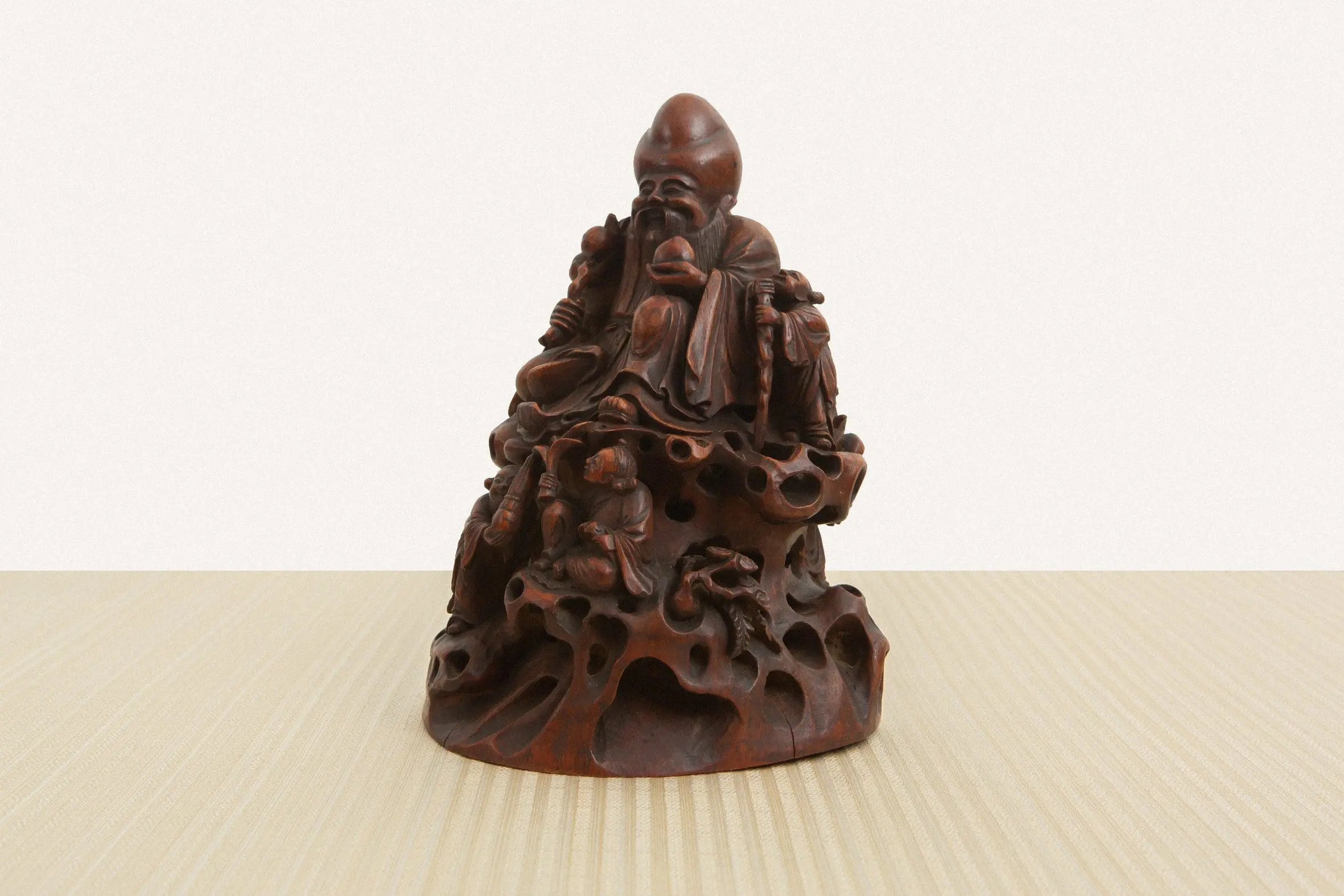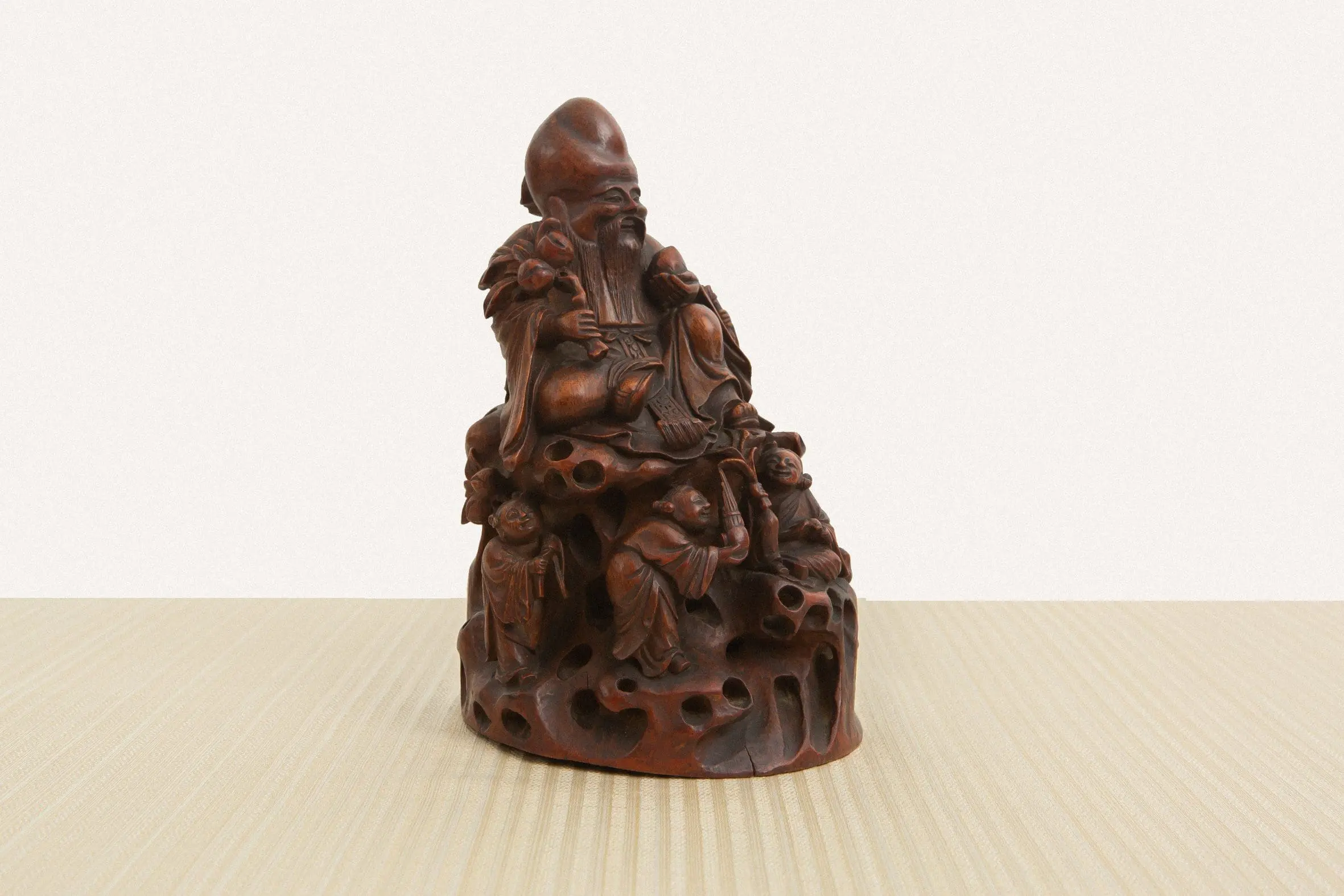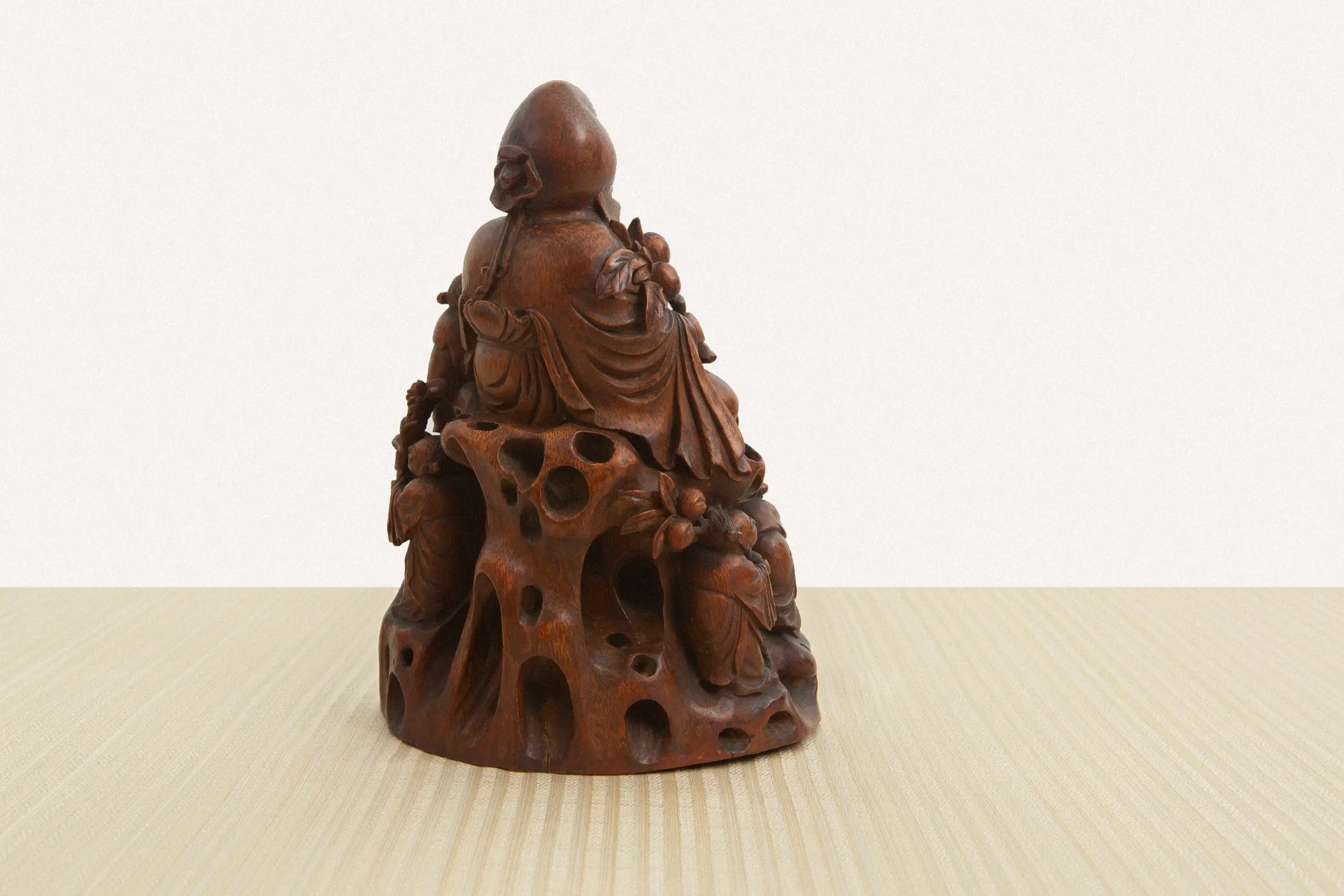| Description | A very detailed carving of Shou Shang, the God of Prosperity, seated on what appears to be a tree, surrounded by children, and holding a flower in one hand, peach in another. In very good condition. |