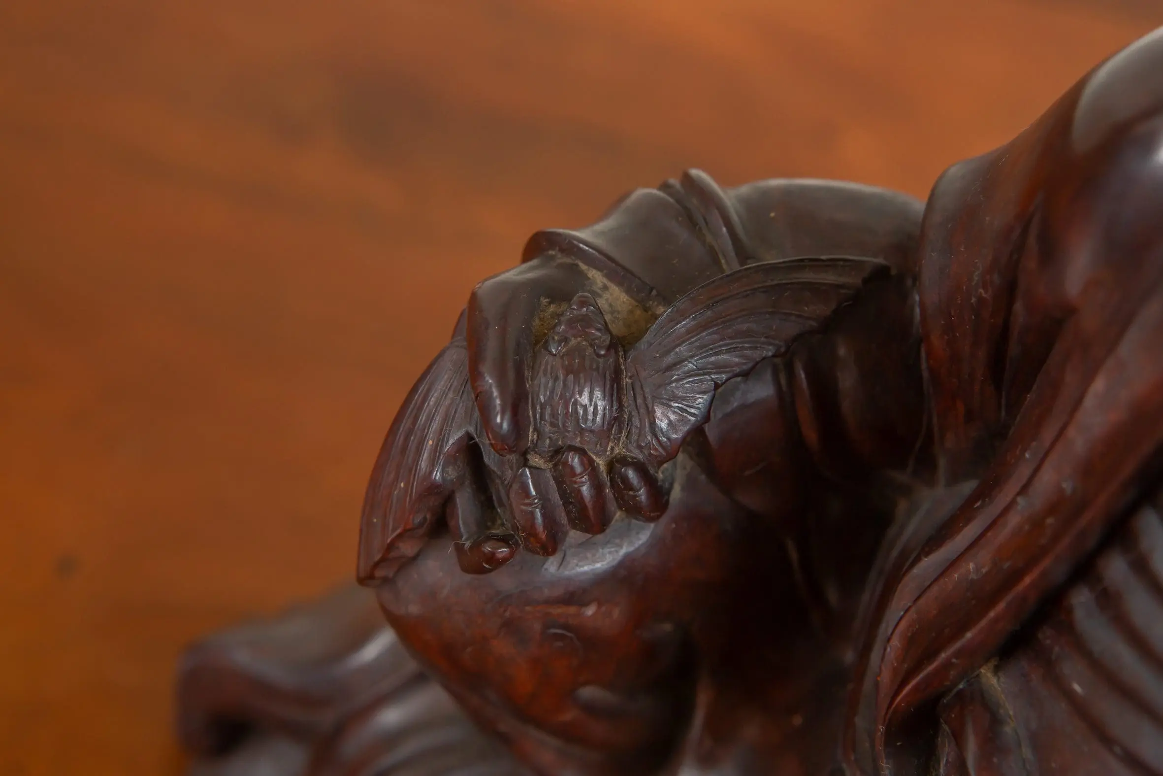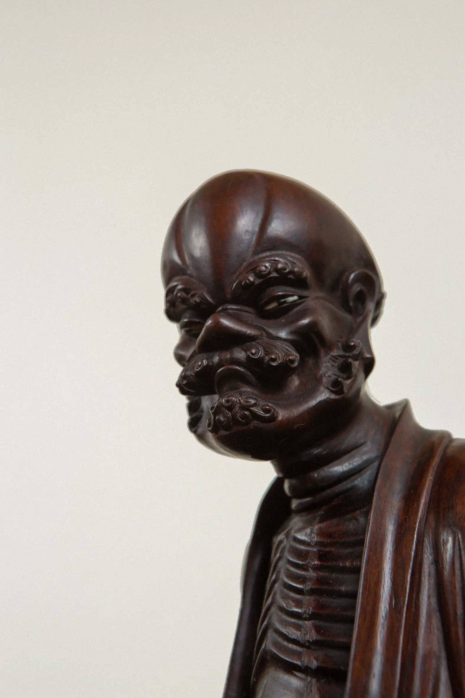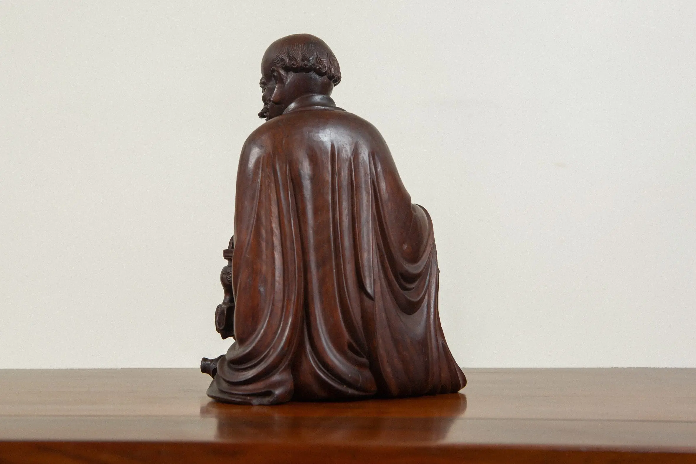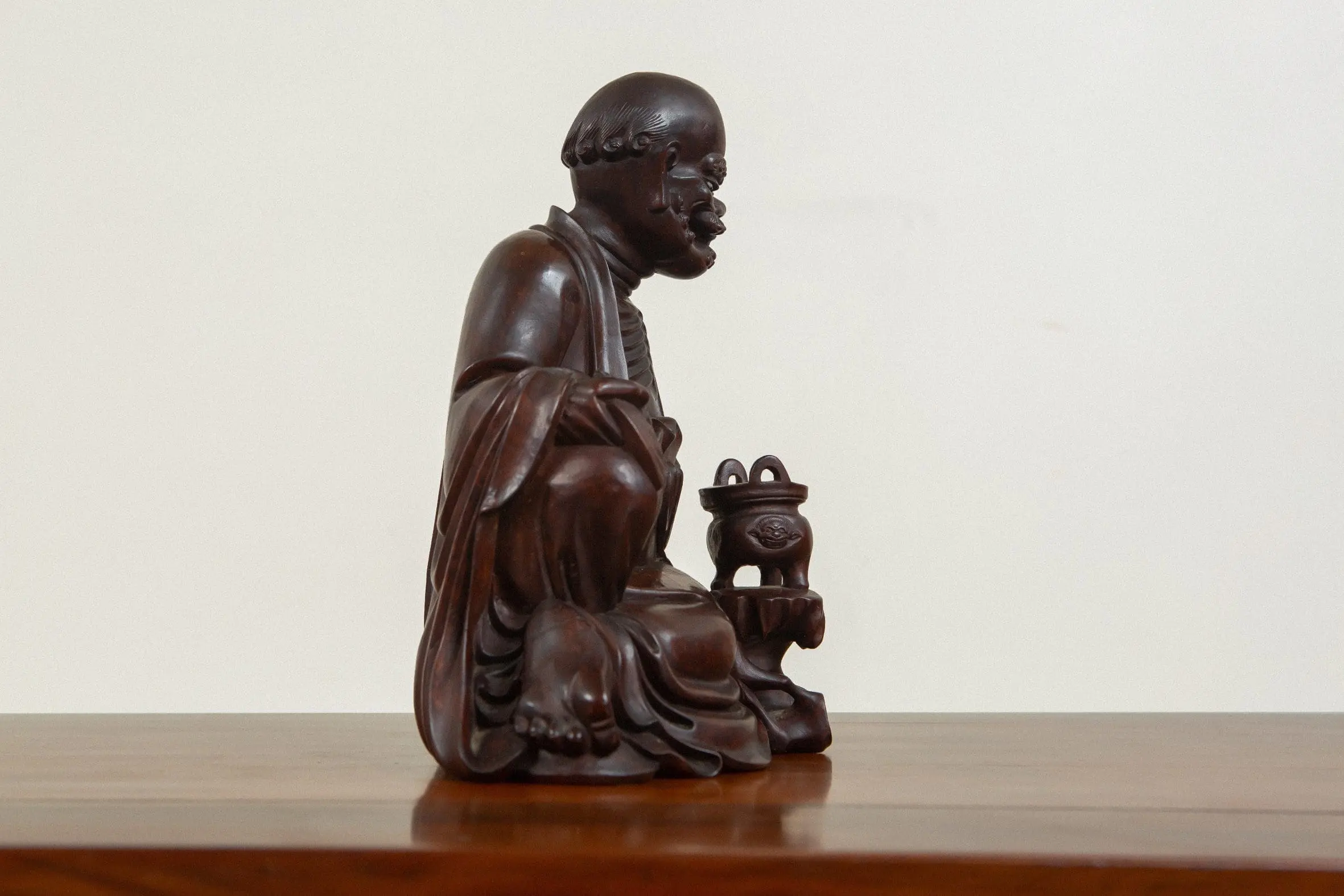 | Description | A finely carved zitan Lohān seated before a censer on rockwork, his ribs exposed in ascetic manner and draped in deeply pleated robes. |