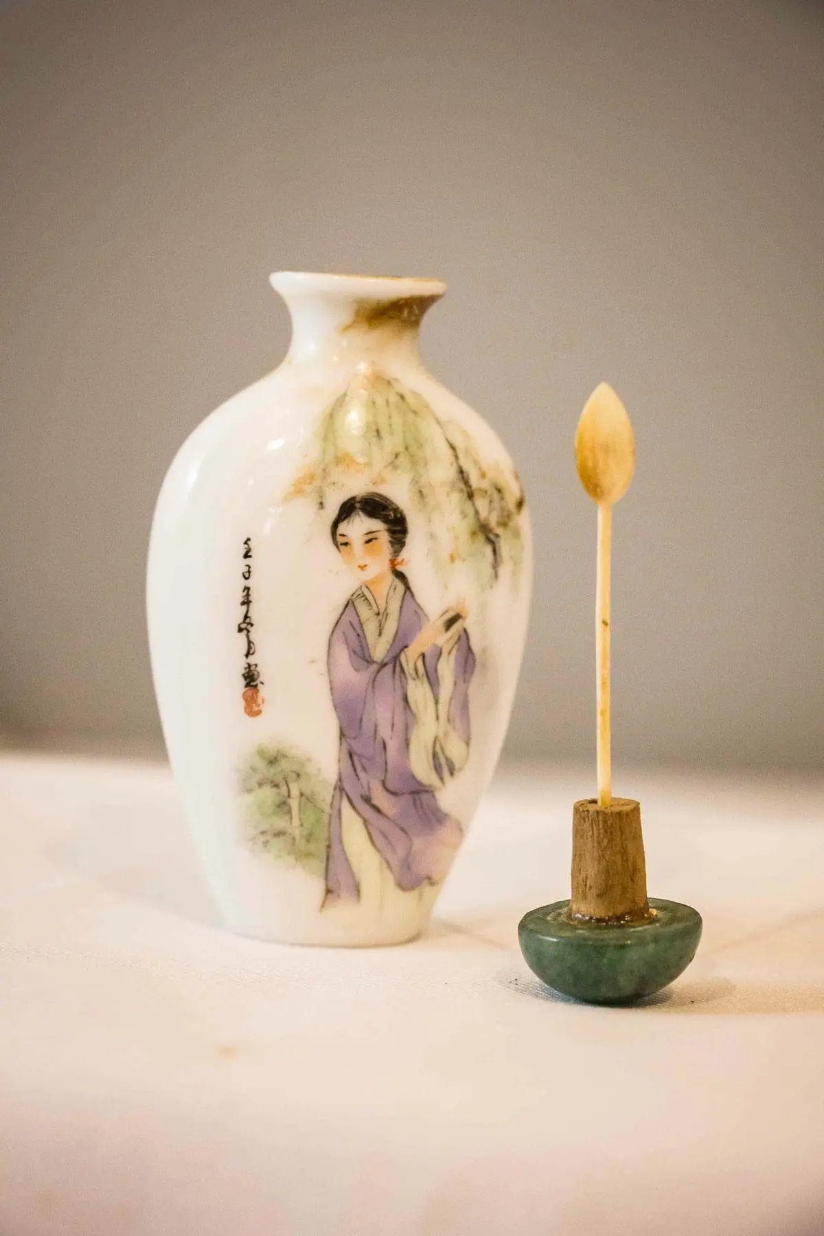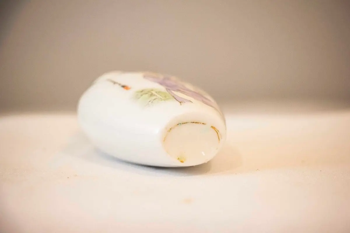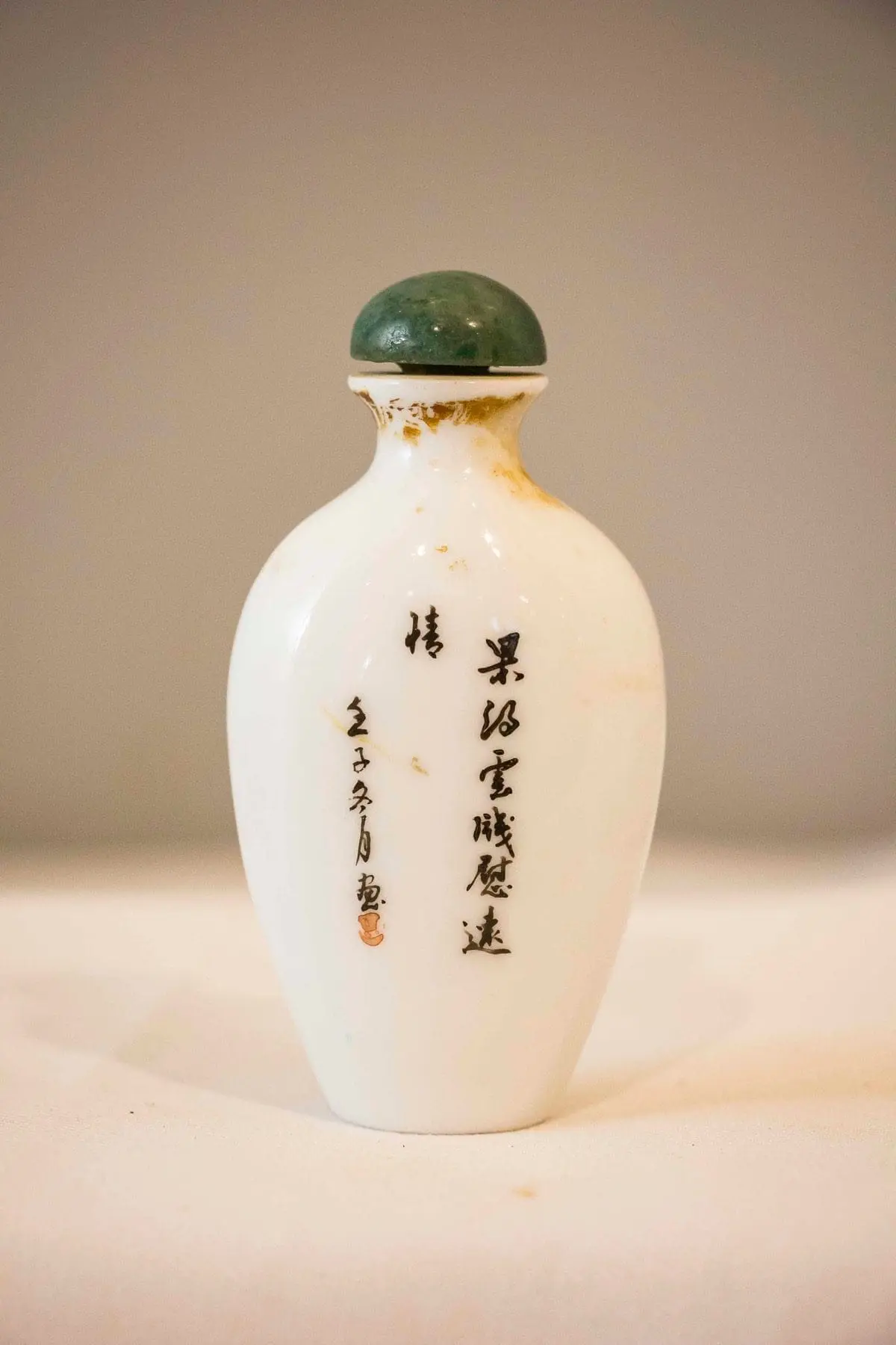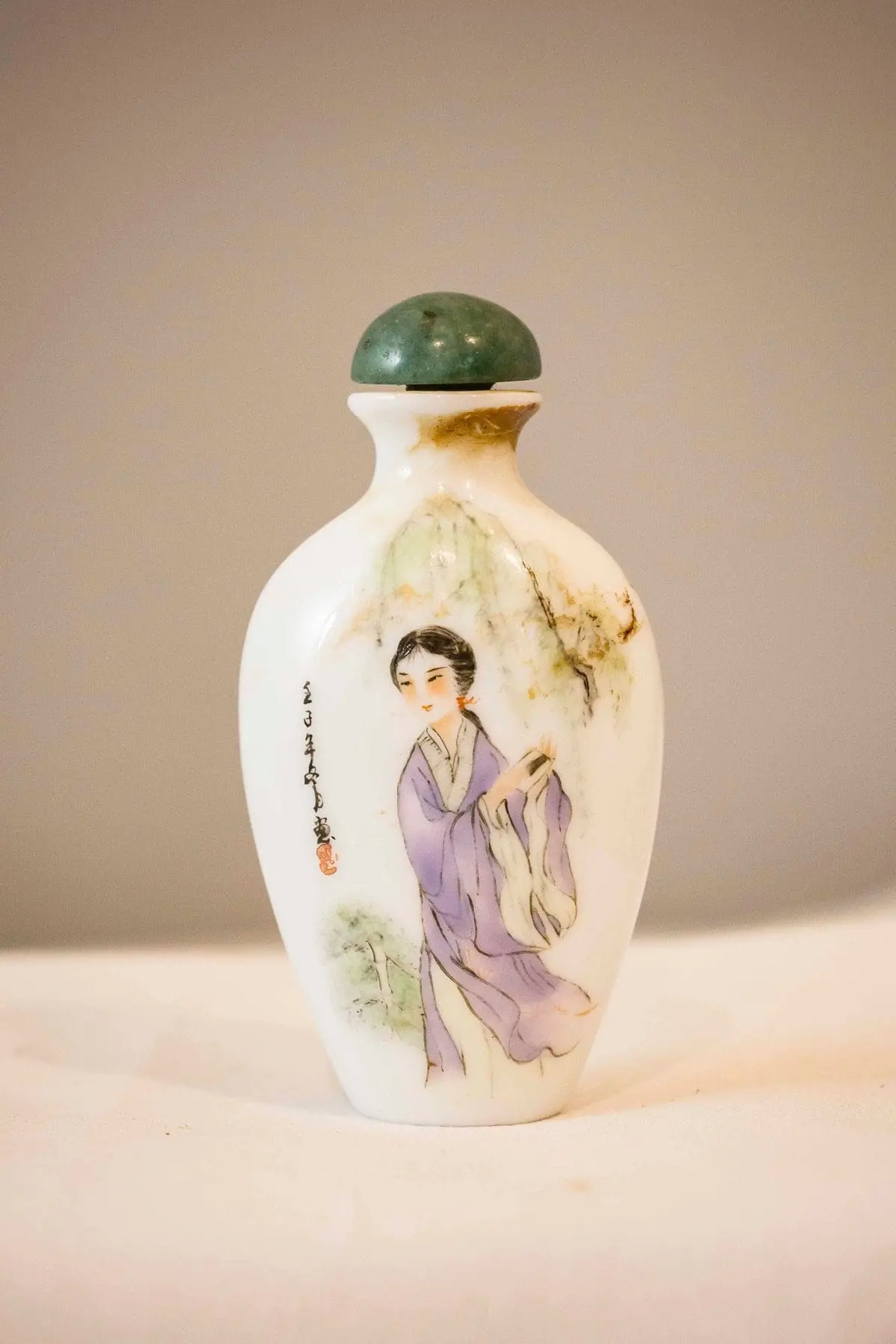 | Description | Late Qing famille-rose porcelain snuff bottle, painted with a court beauty in lavender robe beneath willow trees, with reverse calligraphy and seal. Literati-style inscription dated jisi winter. Jadeite stopper with bone spoon. Jingdezhen civilian kiln, Guangxu period, circa 1885–1905. |