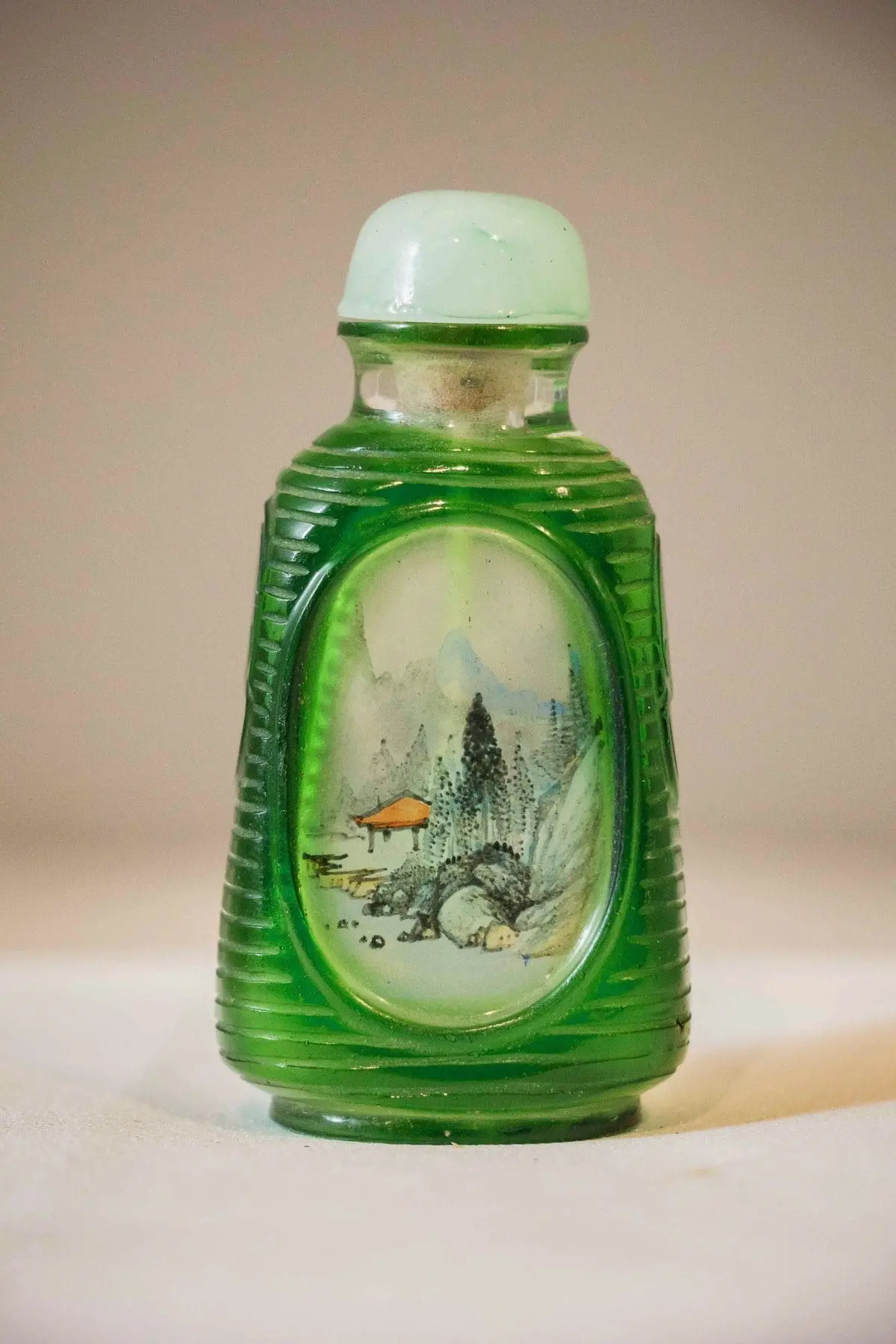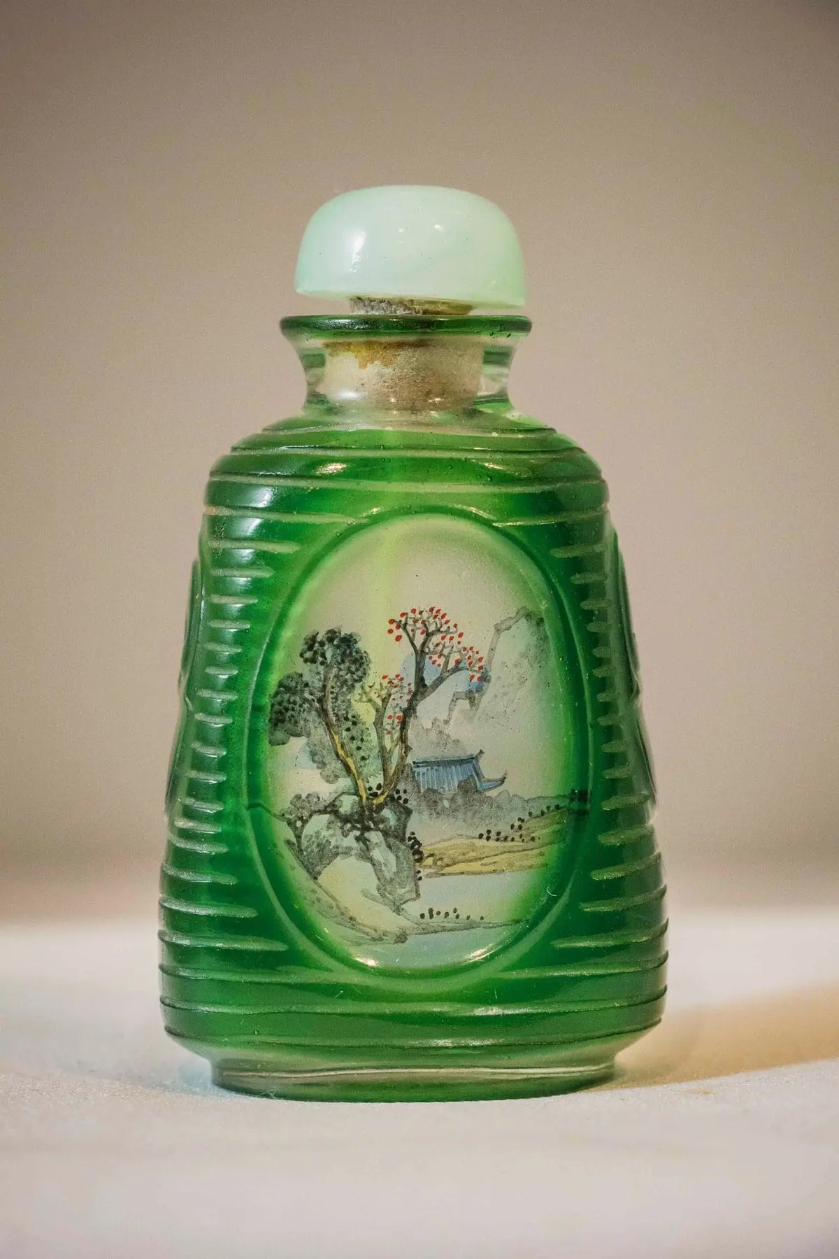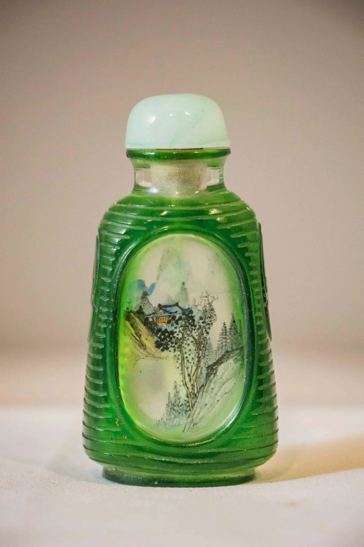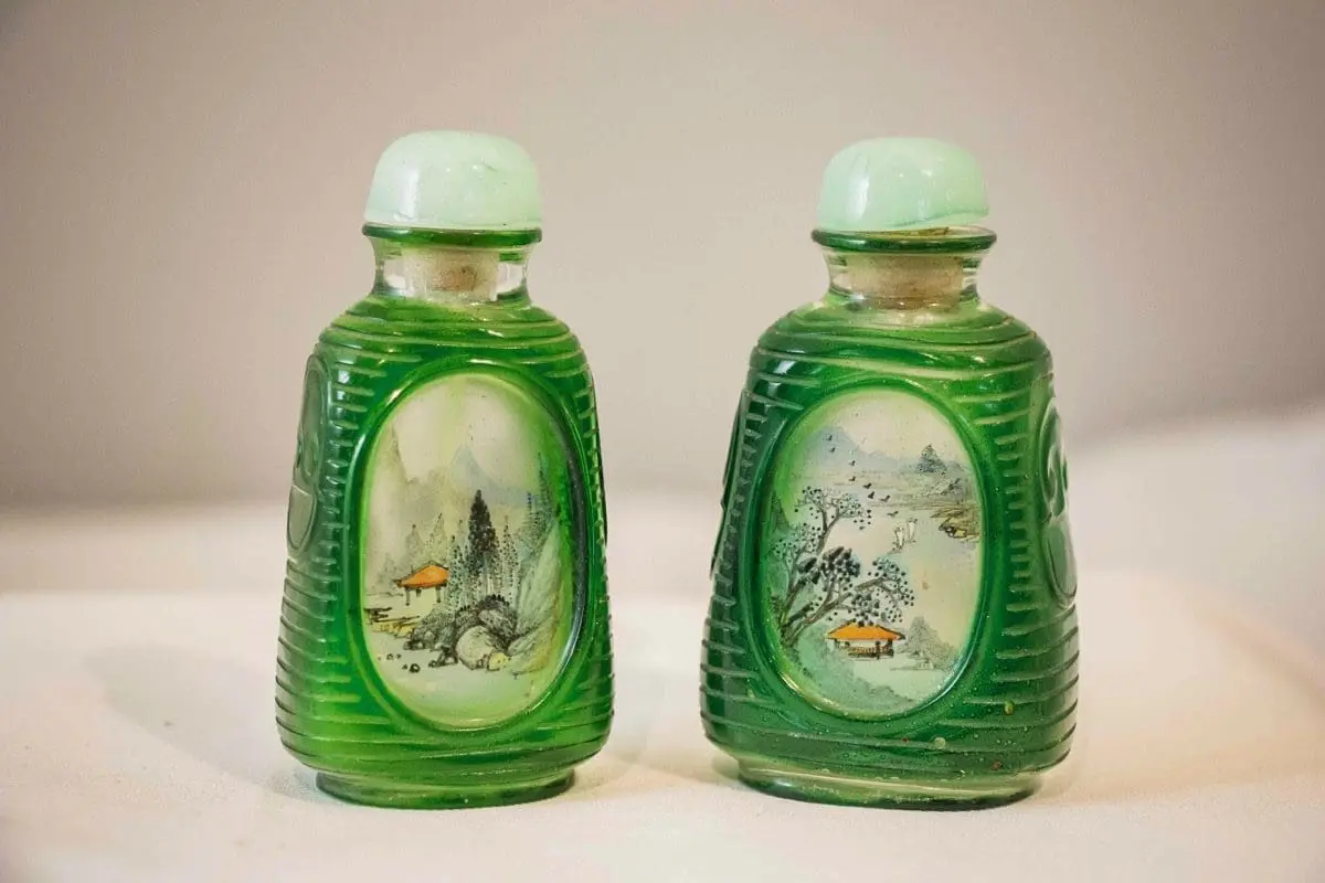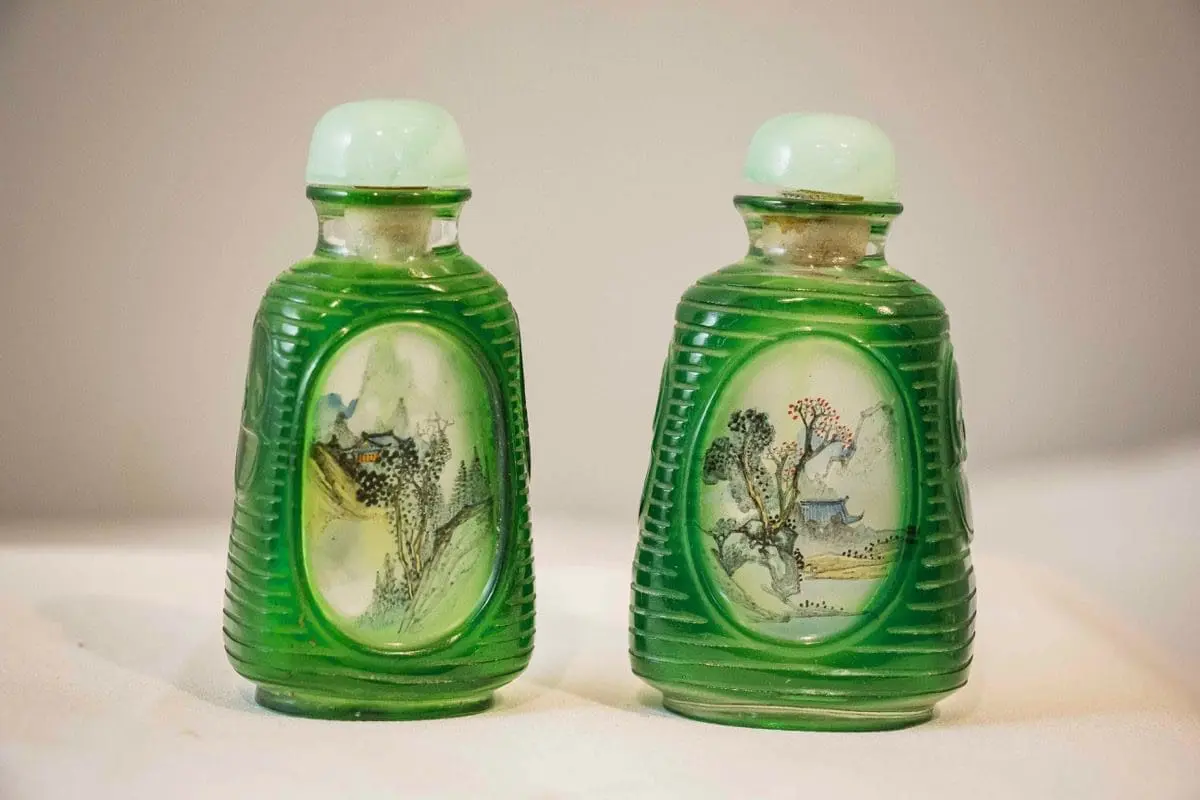 | Description | A pair of Peking glass snuff bottles. In green with center clear medallions containing detailed landscape paintings on each side. |