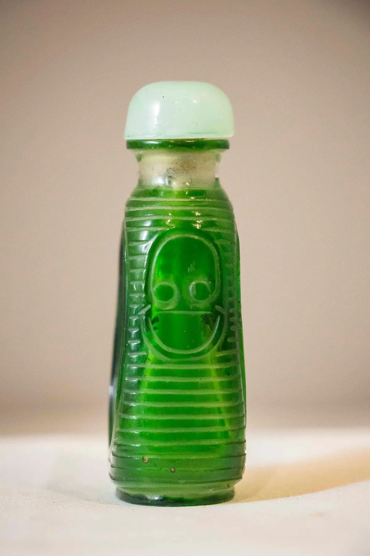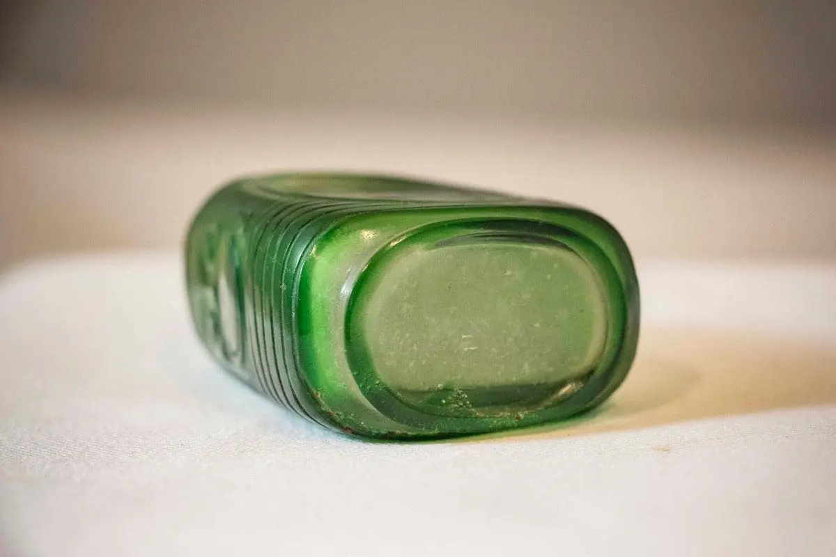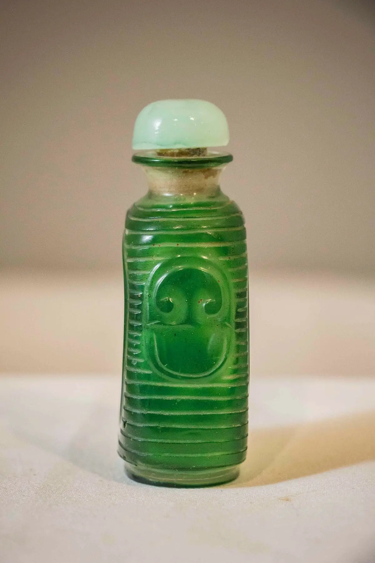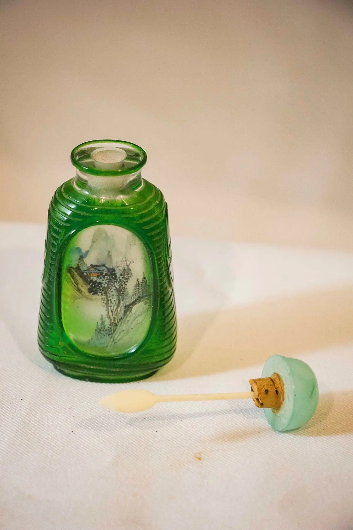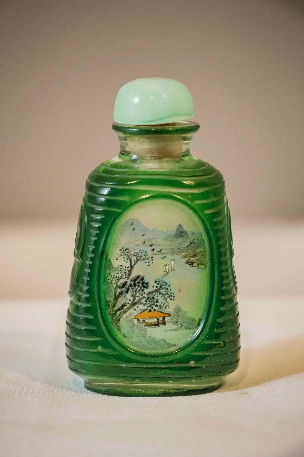 | Description | A pair of Peking glass snuff bottles. In green with center clear medallions containing detailed landscape paintings on each side. |