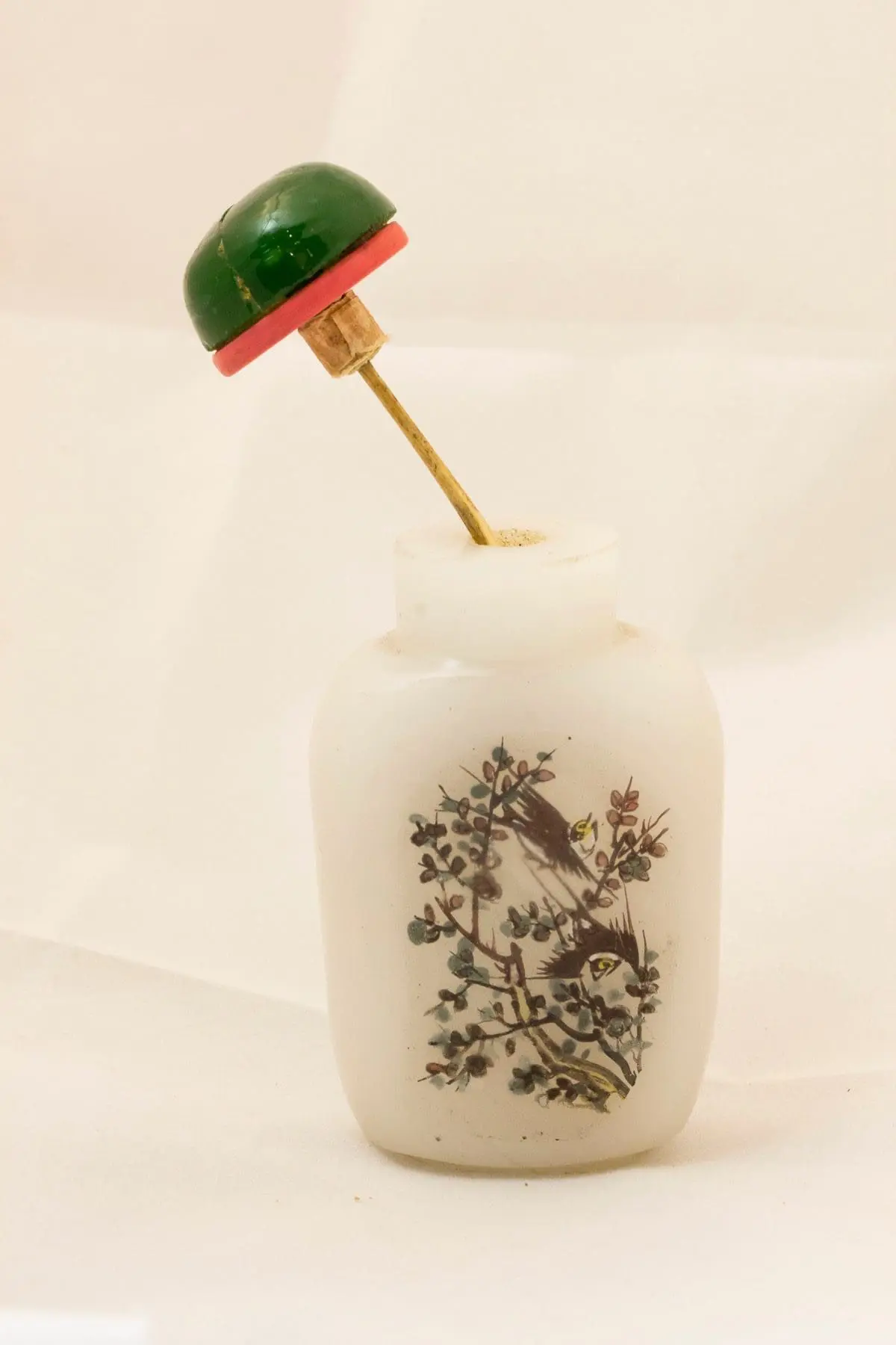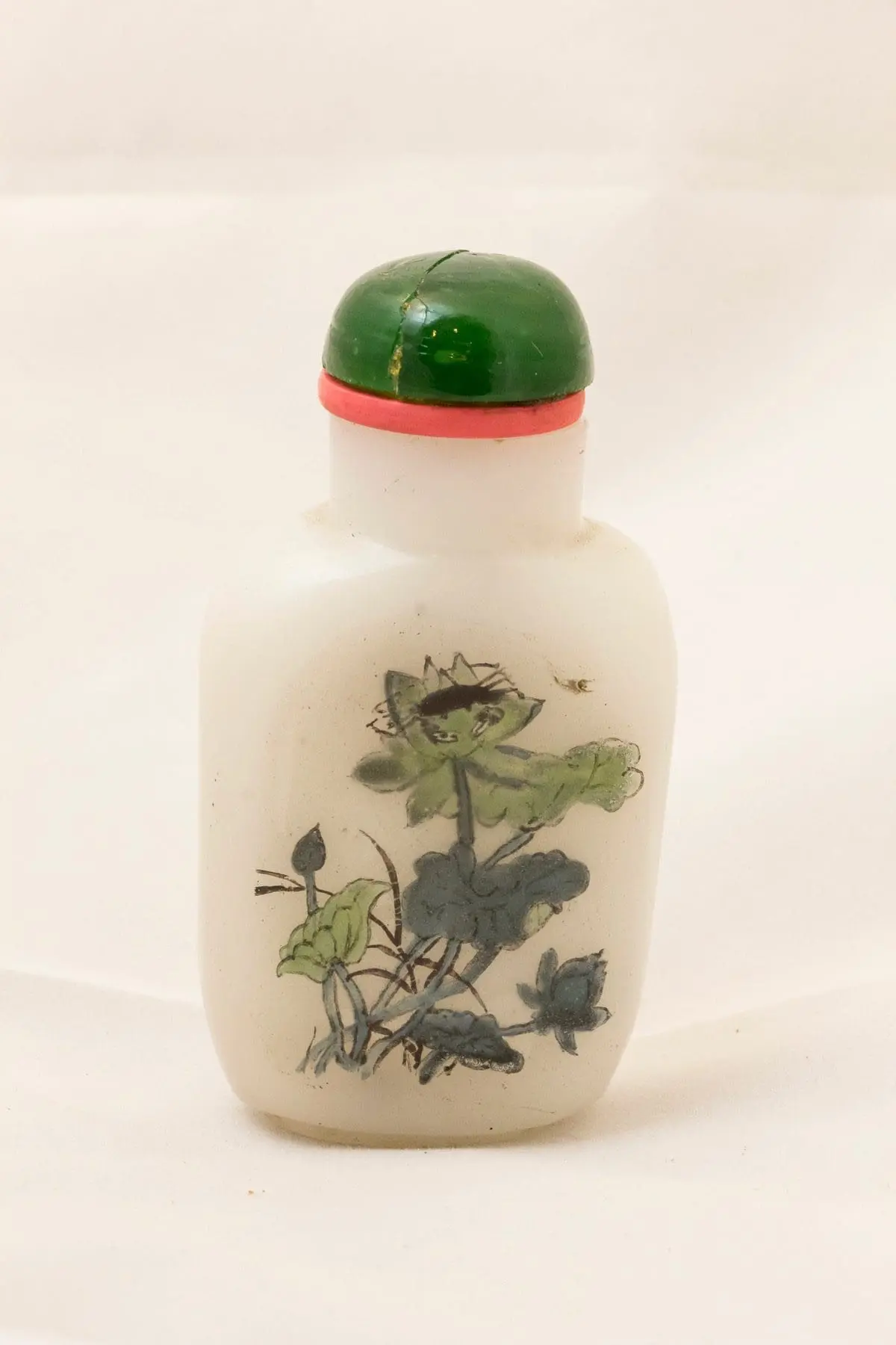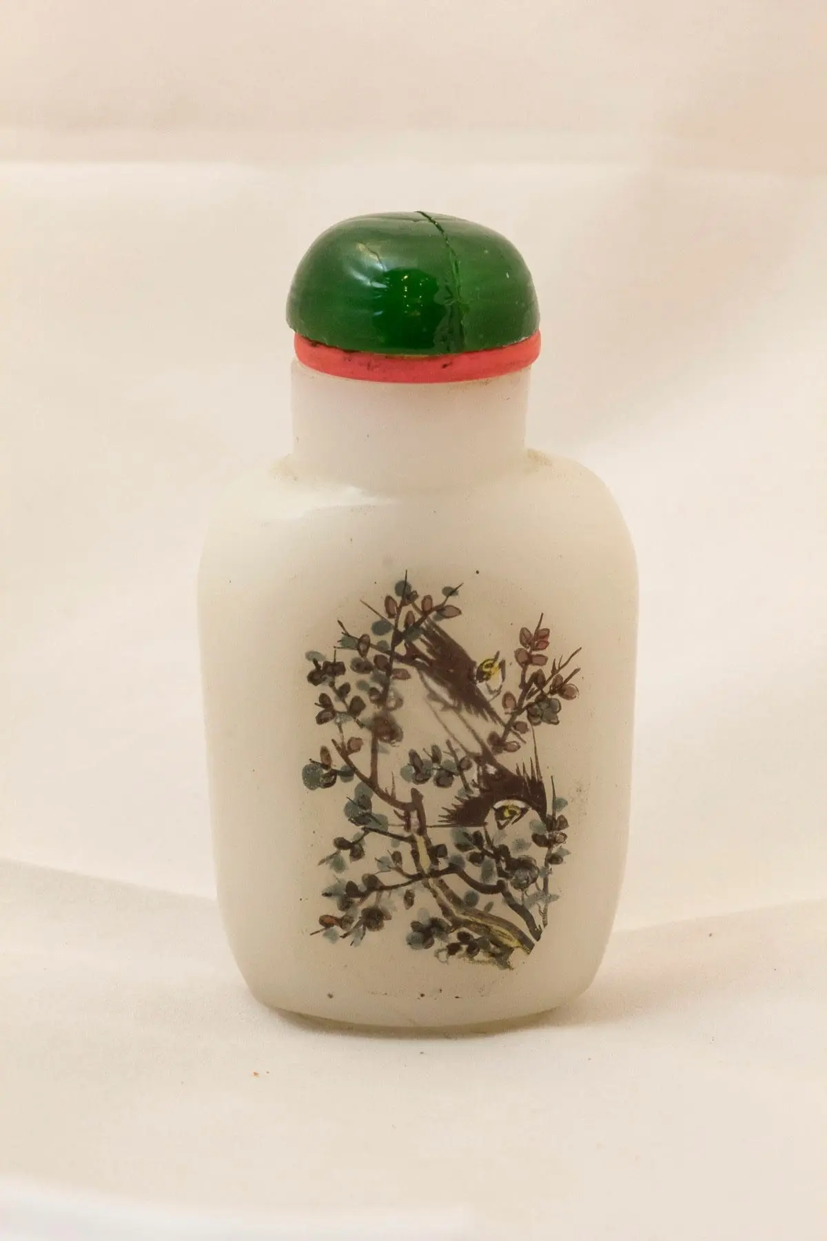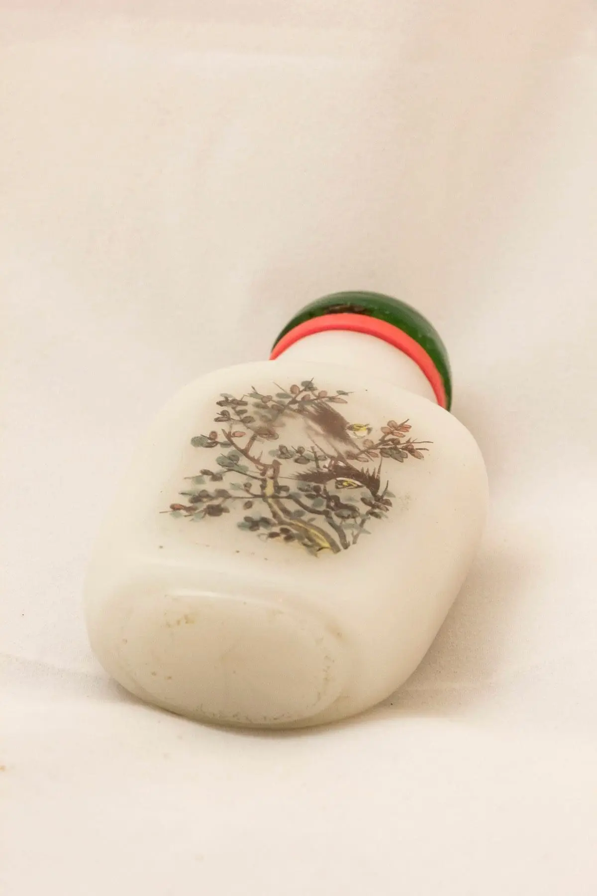 | Description | Large snuff bottle in opaque glass with overglaze flower and bird paintings in green on one side, branches in brown on the other. Jade stopper (slight crack). |