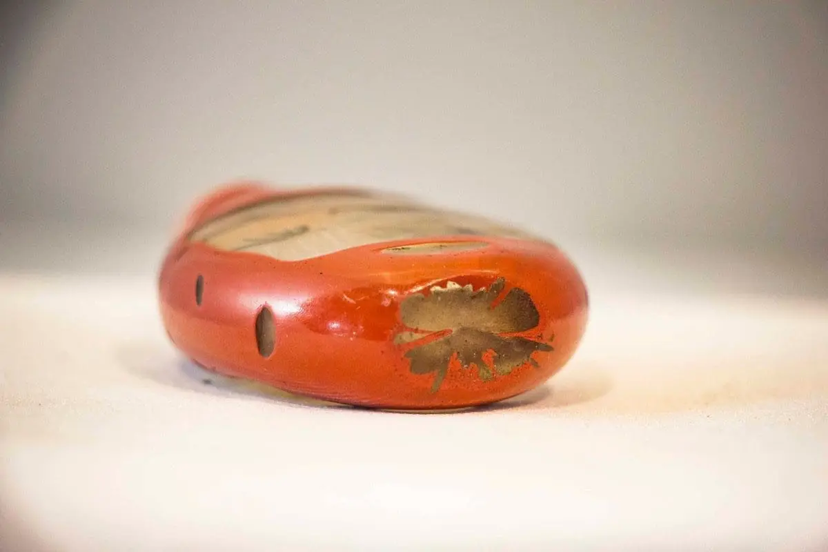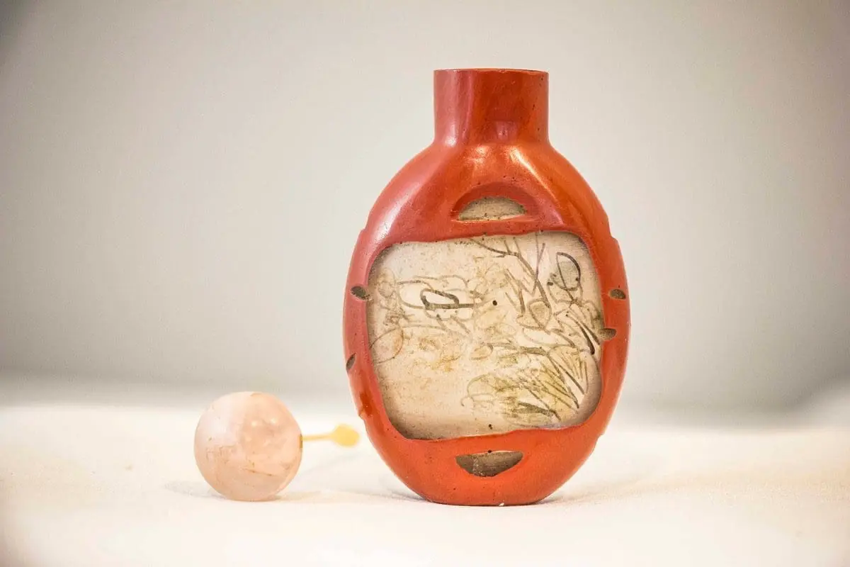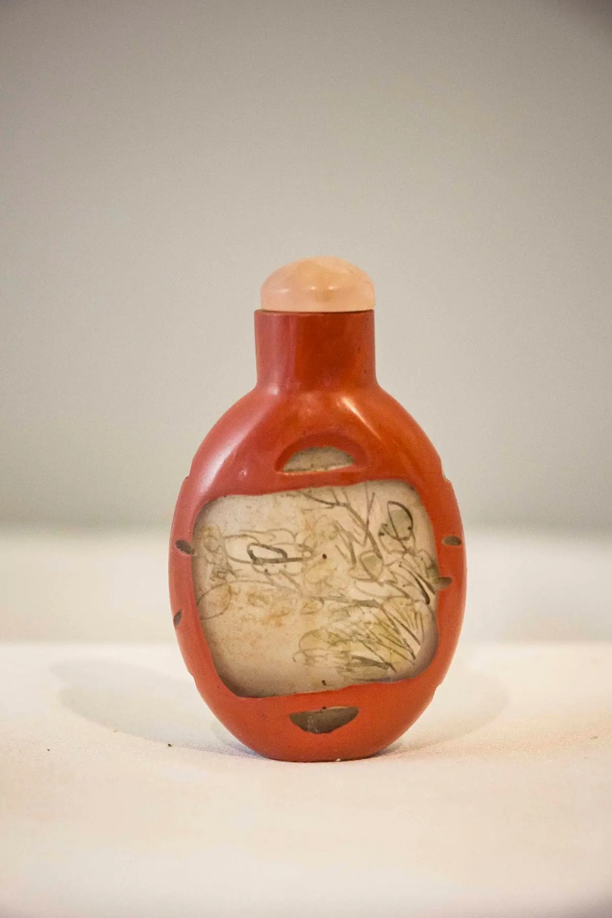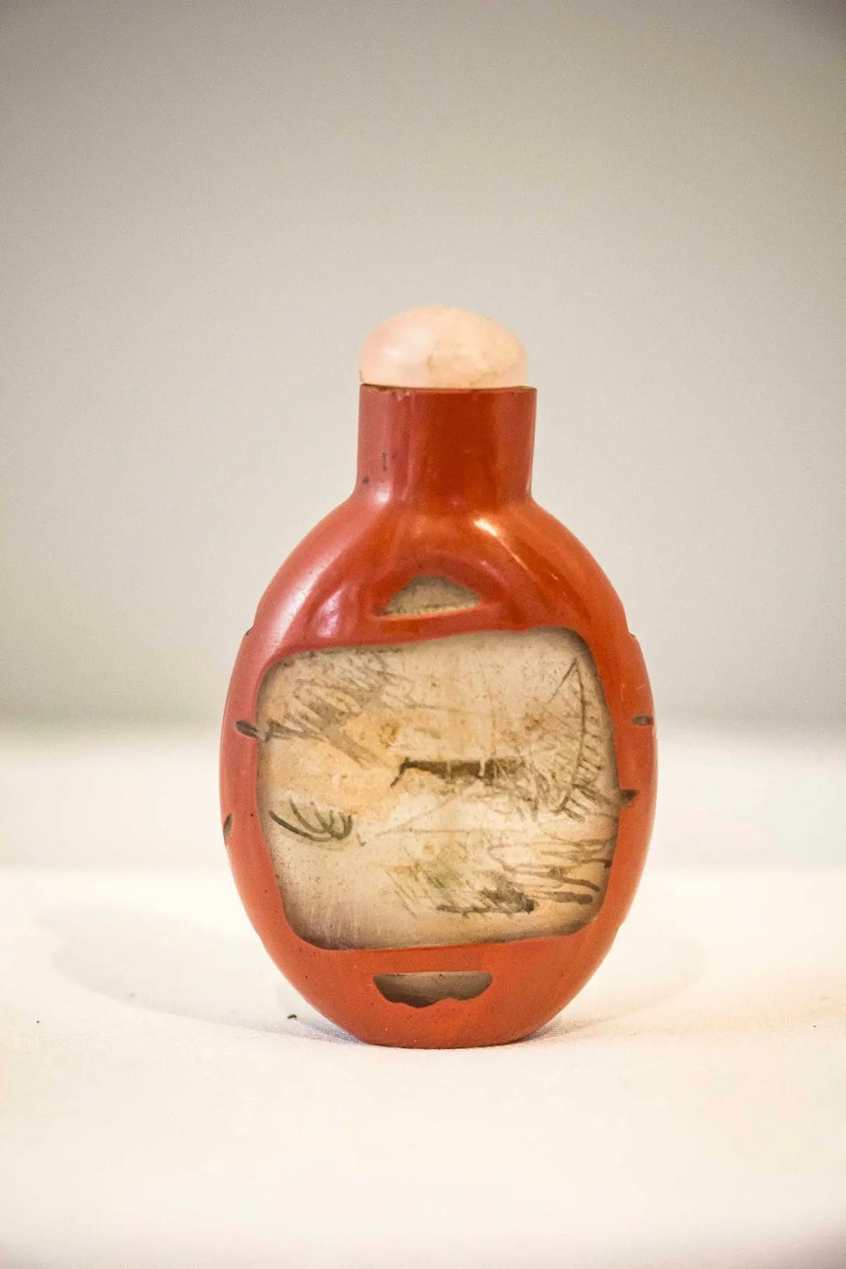 | Description | An unusual stone and cinnabar snuff bottle with an ink painted river and landscape scene on the front. Agate stopper. |