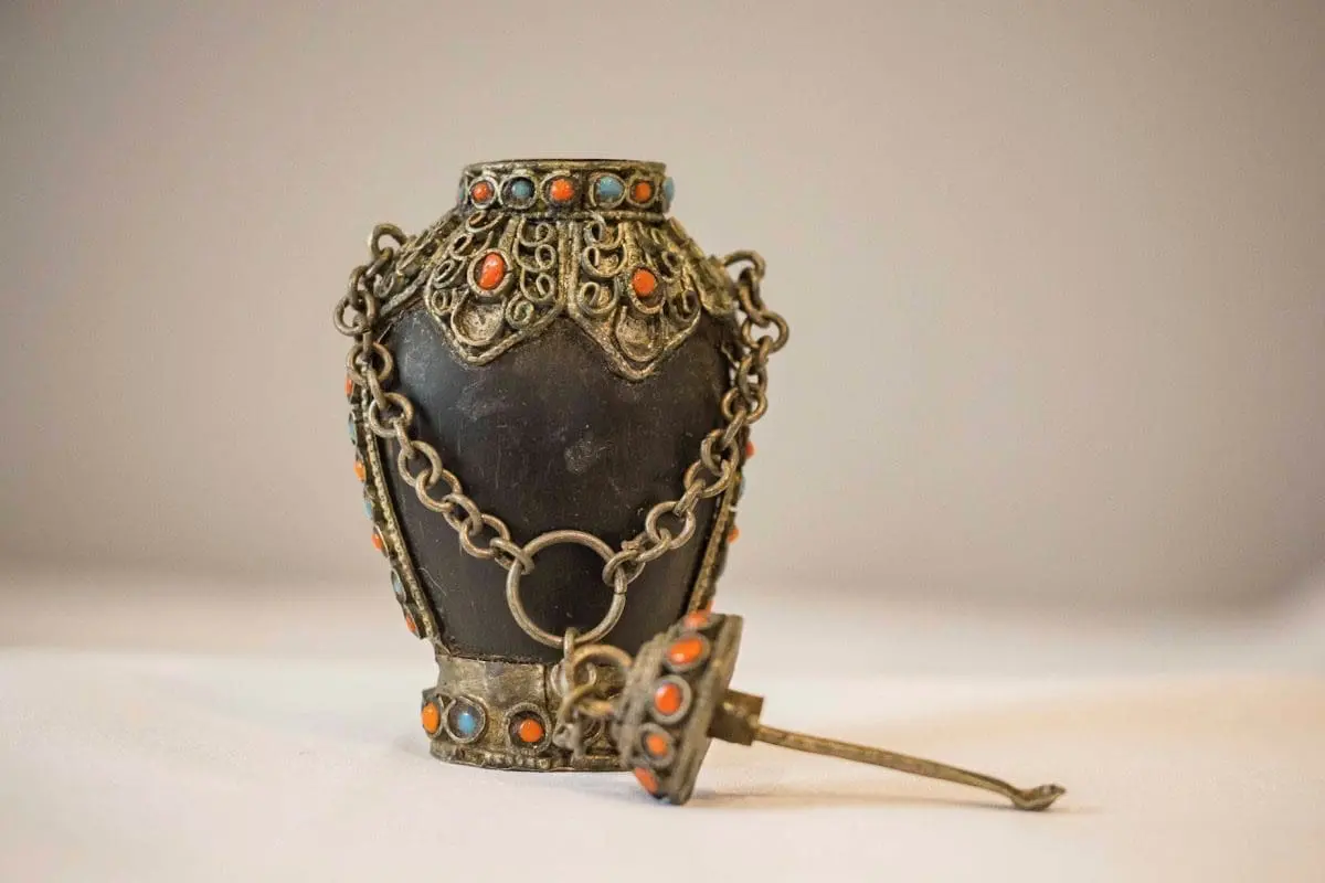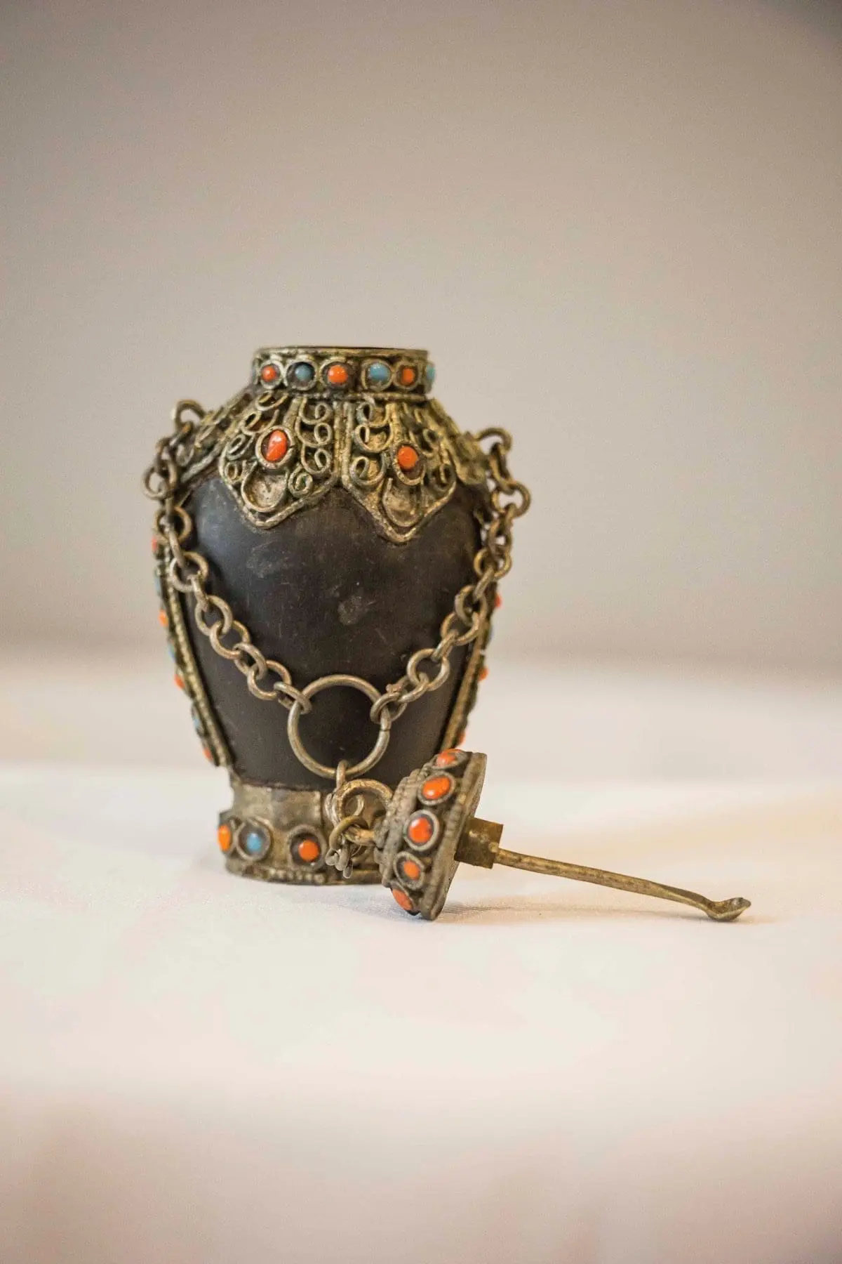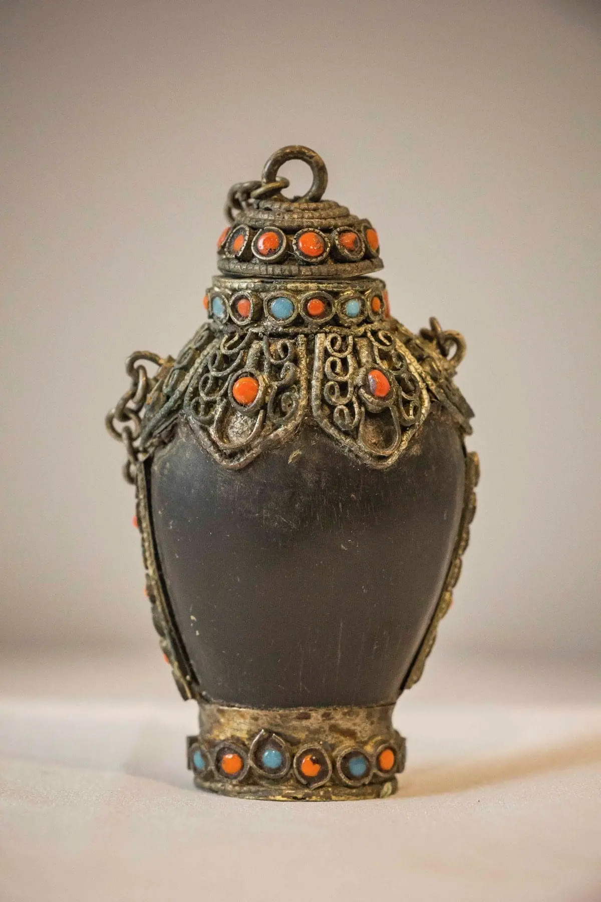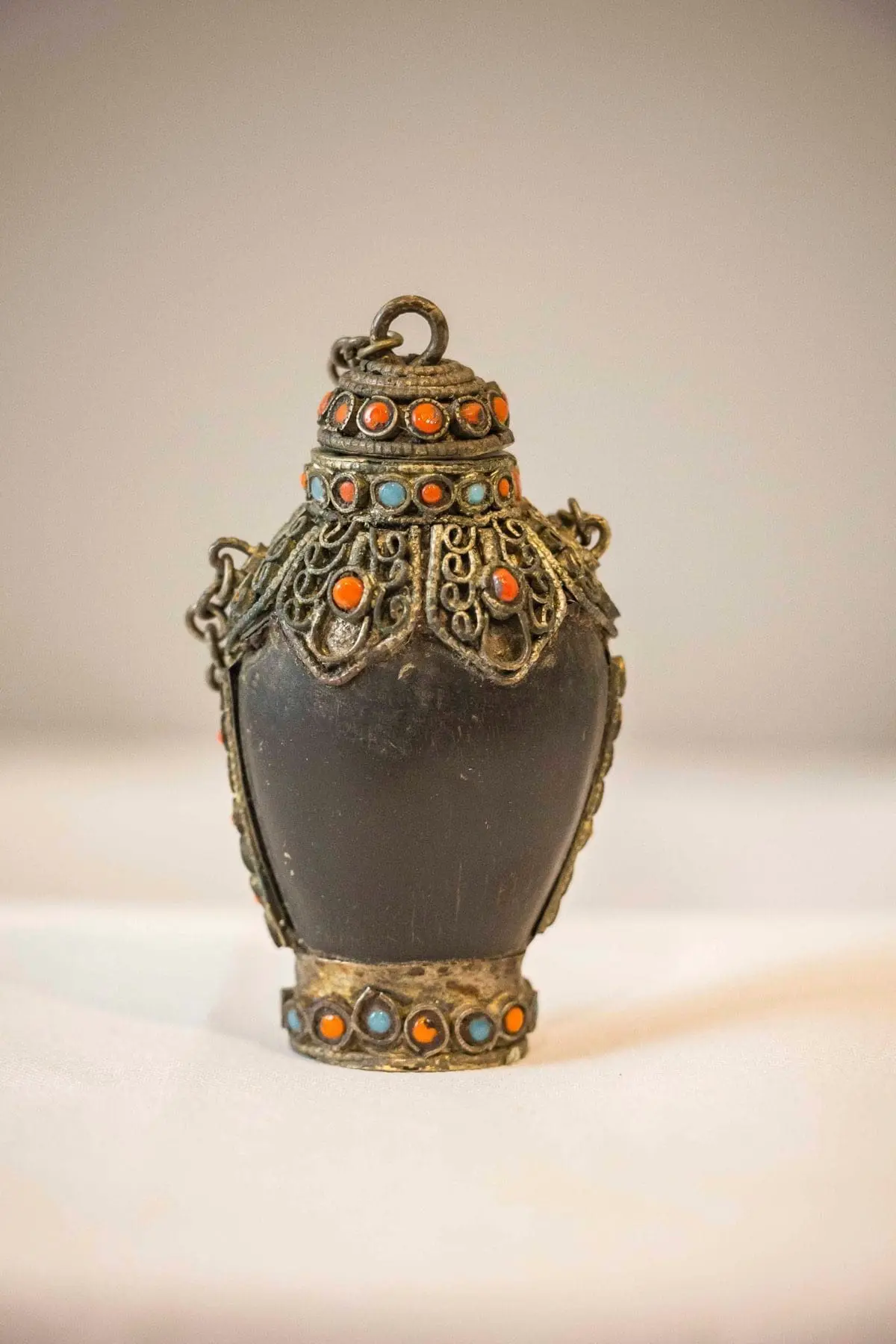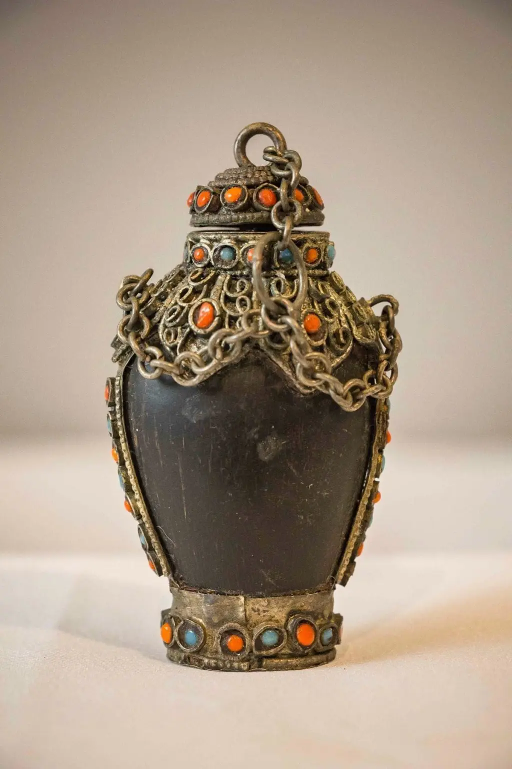 | Description | Onyx snuff bottle with turquoise and coral beads inlaid in an elaborately designed silver collar, sides, and base. |