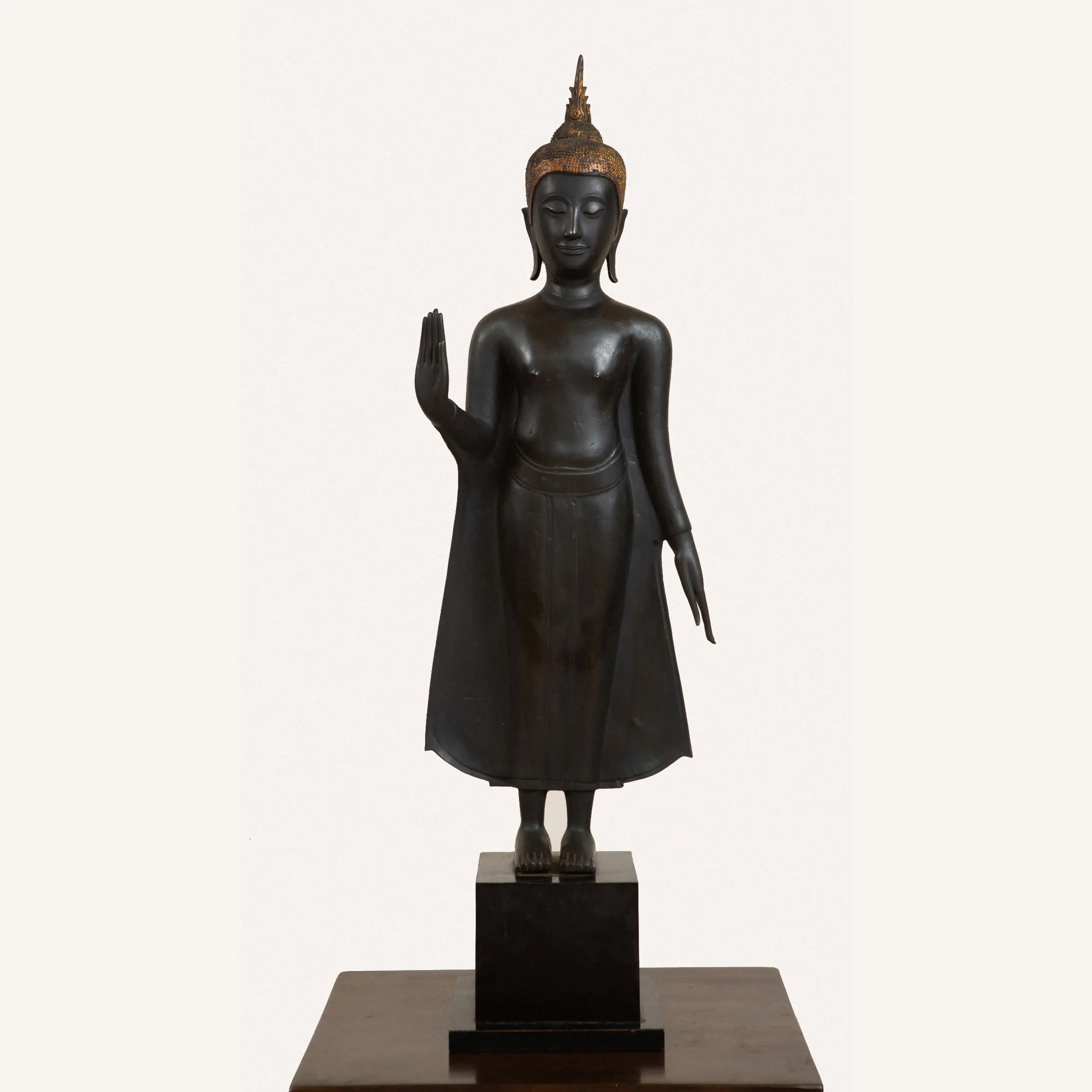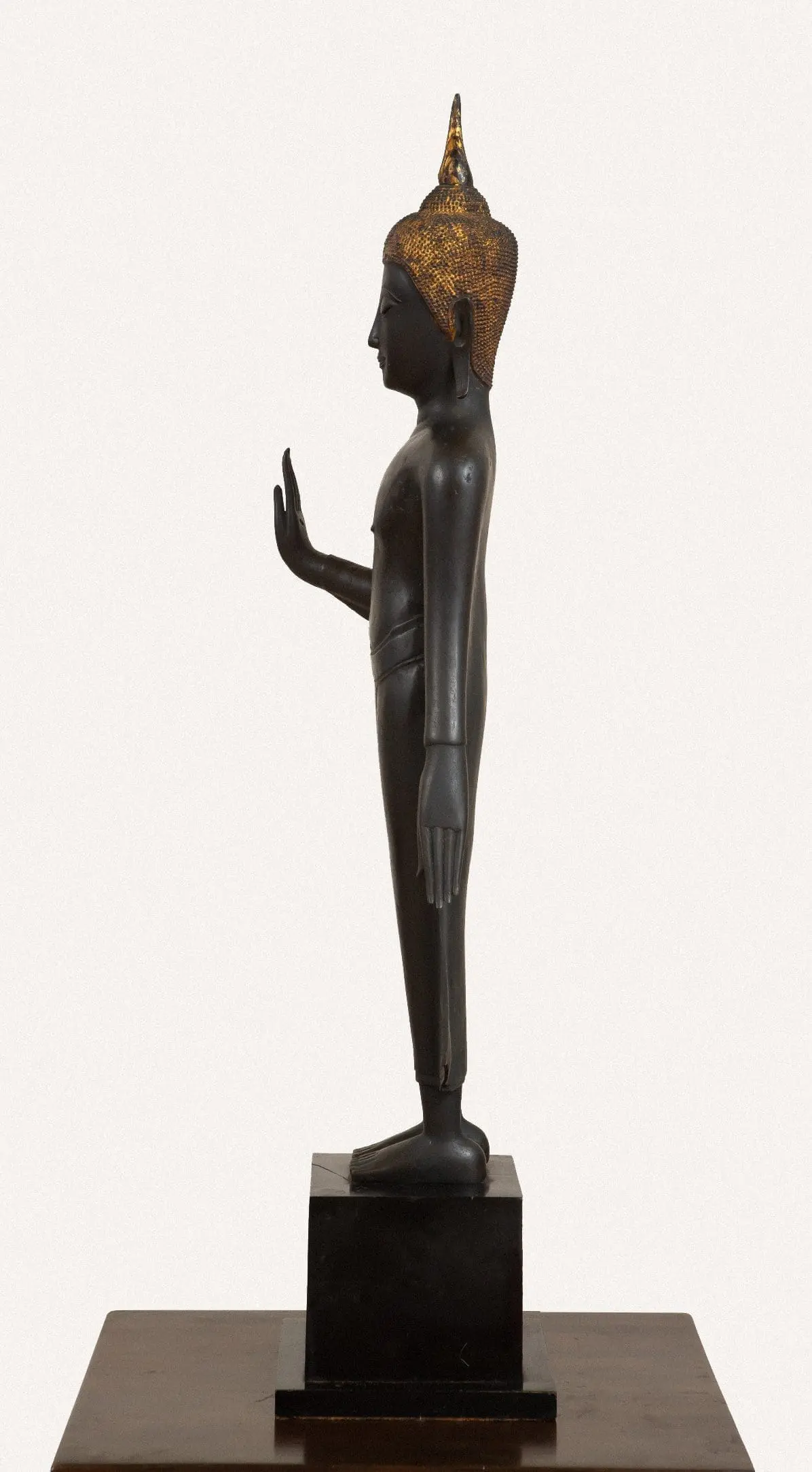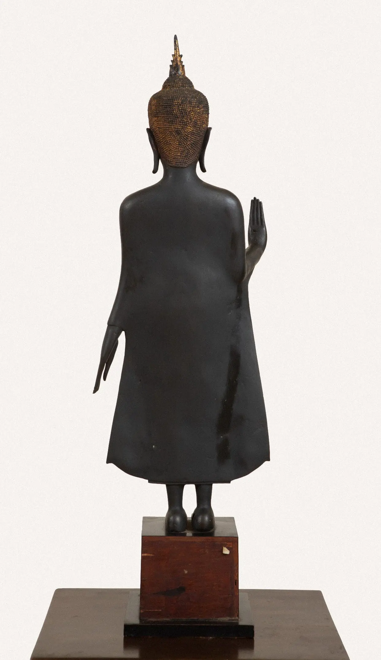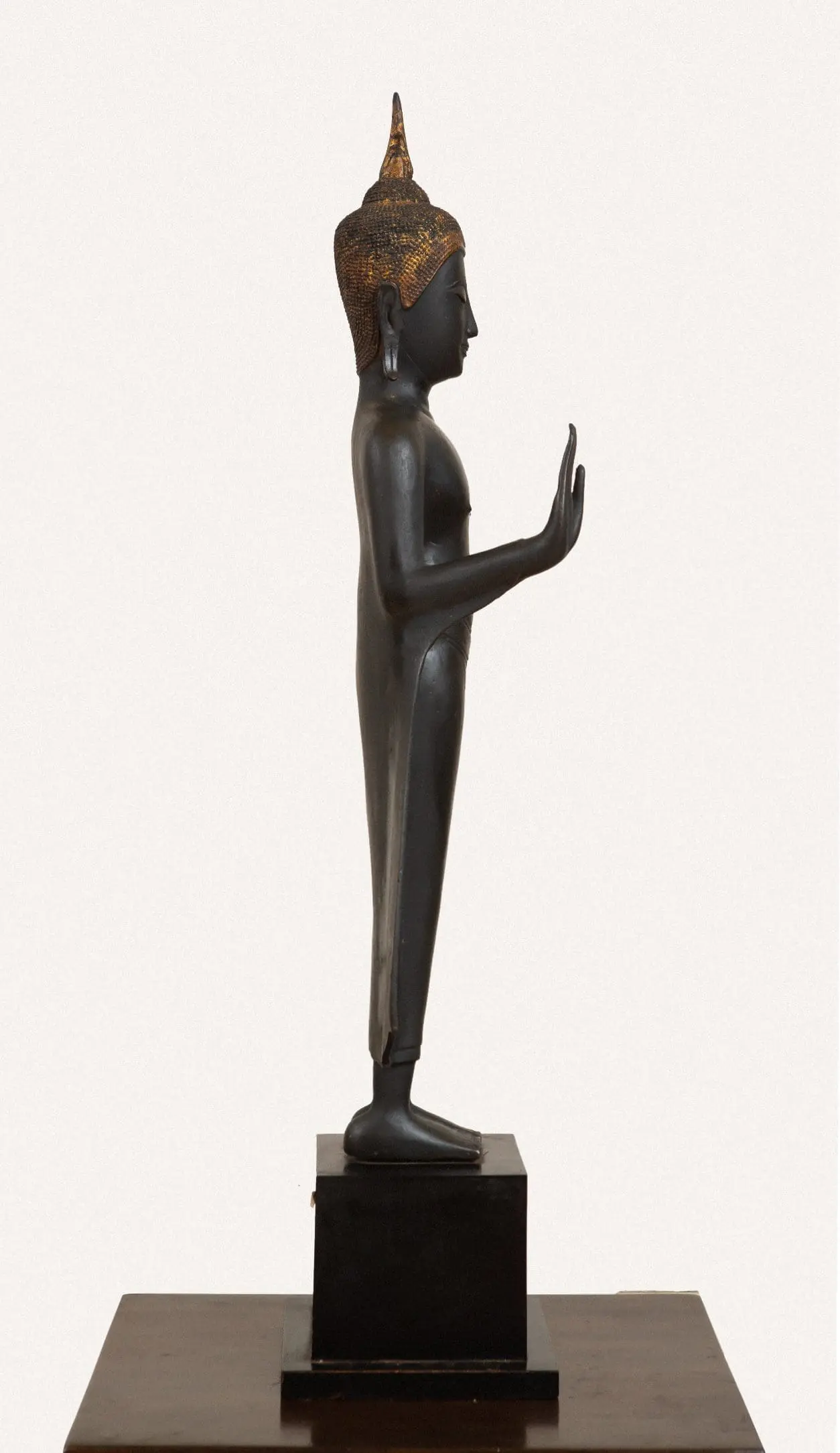 | Description | Large bronze standing Buddha with gilded crown, one hand raised in the gesture of fearlessness, the other pointing to the earth. Mounted on new stand. |