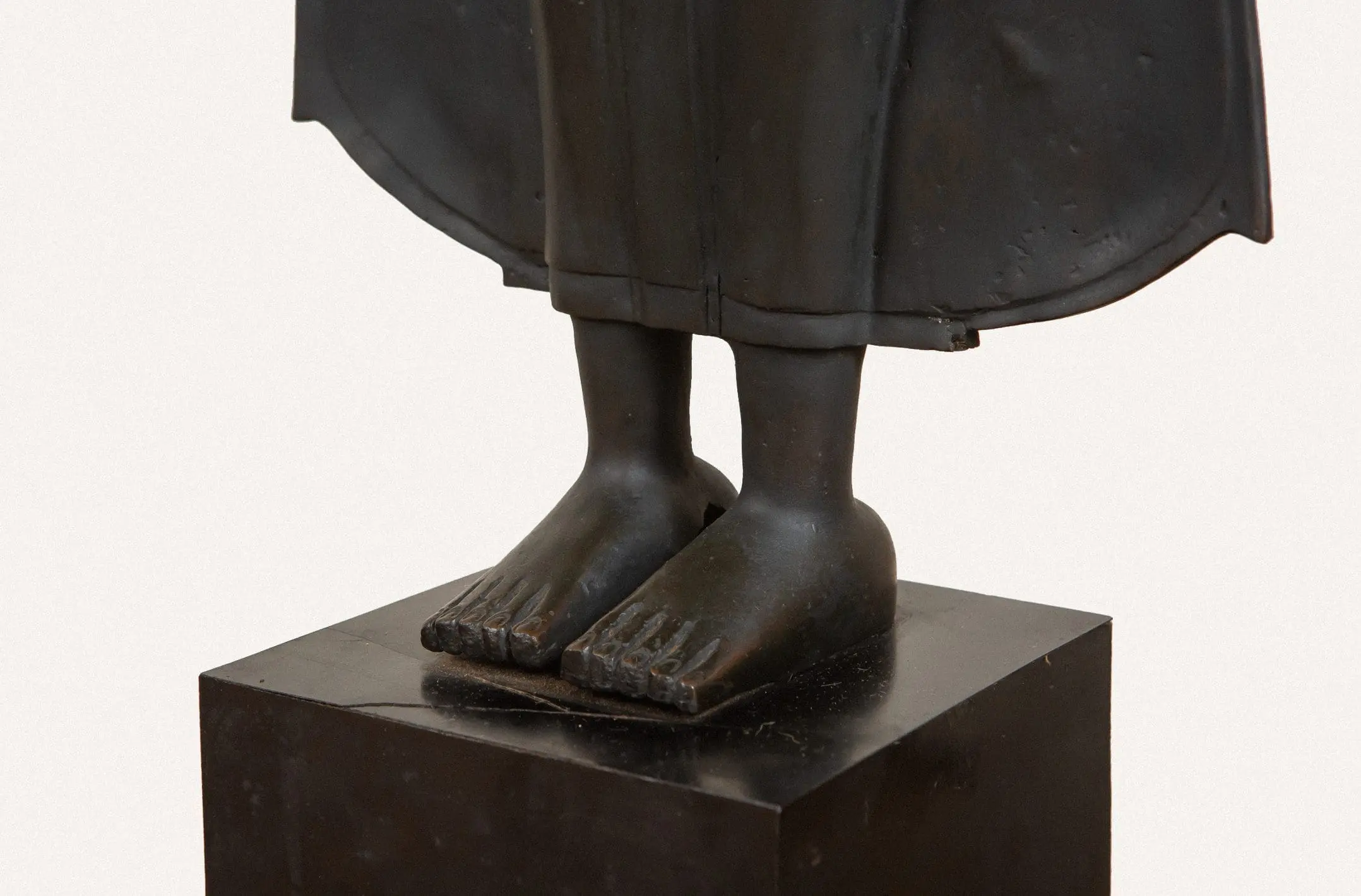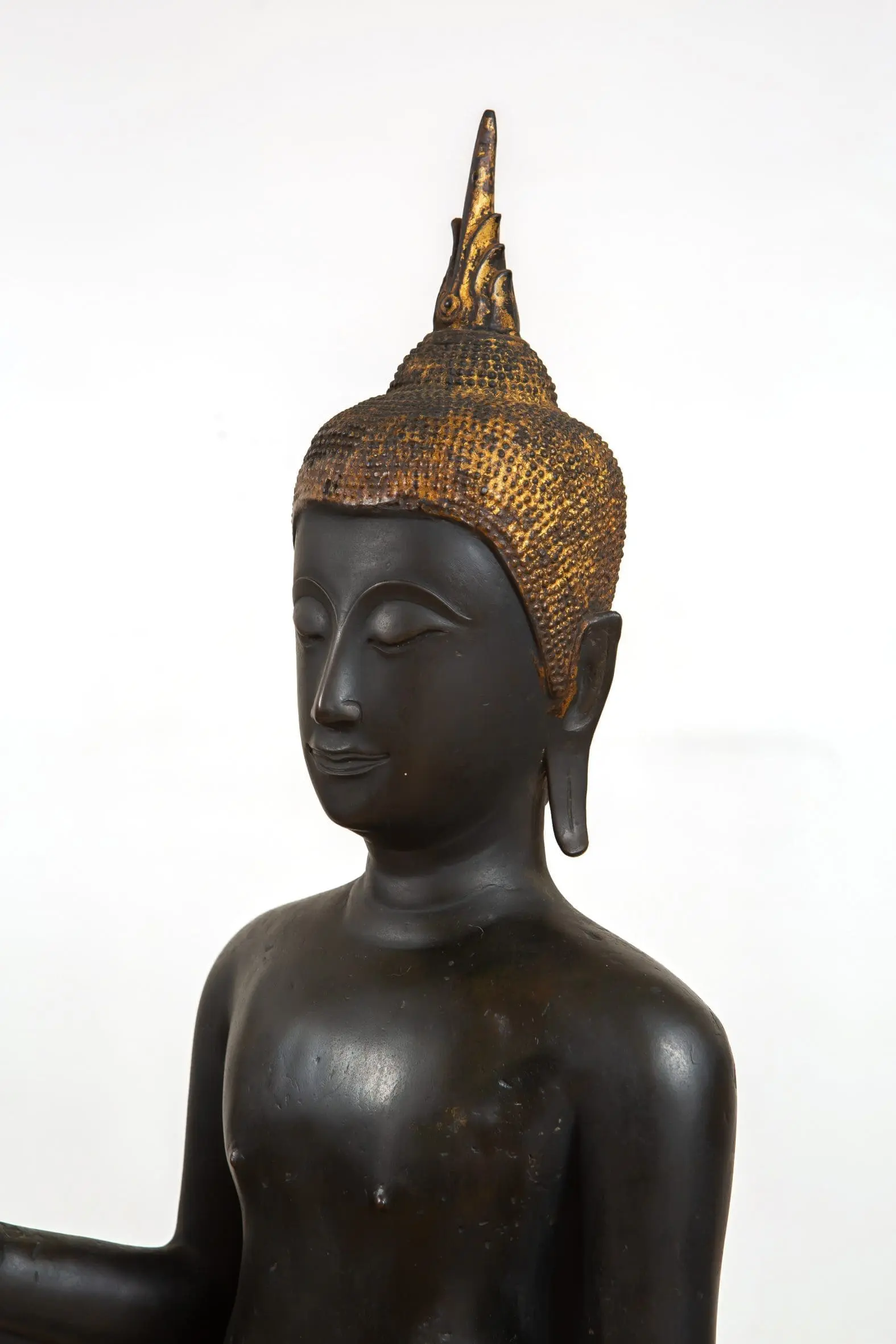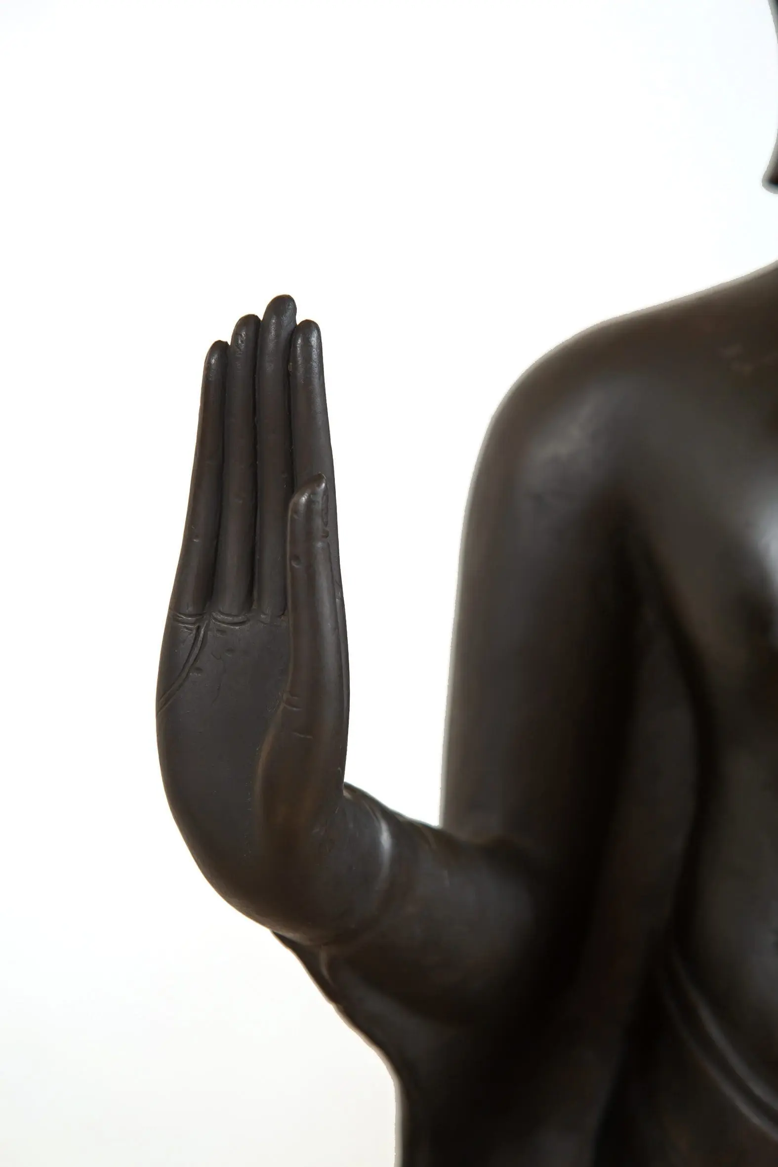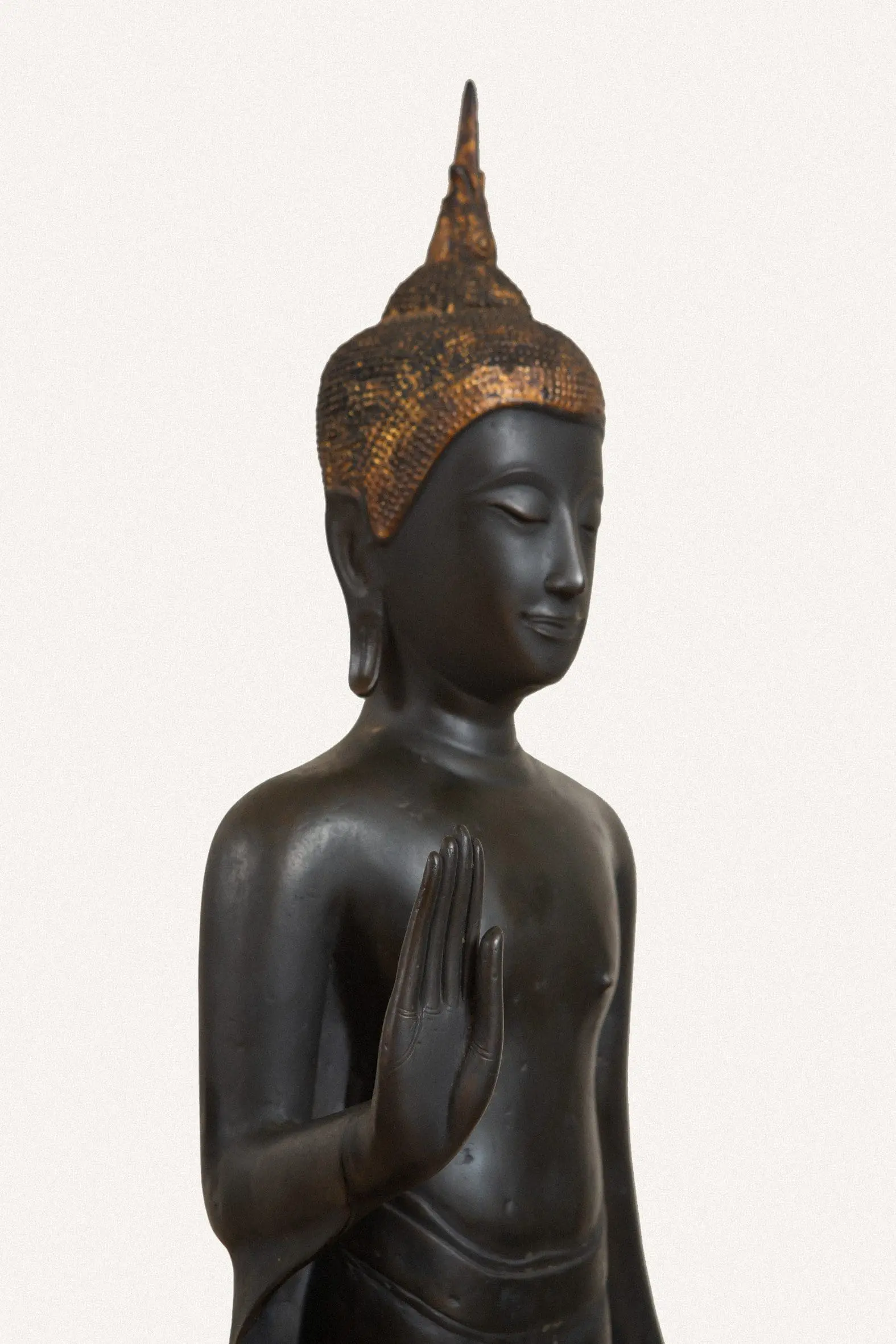 | Description | Large bronze standing Buddha with gilded crown, one hand raised in the gesture of fearlessness, the other pointing to the earth. Mounted on new stand. |