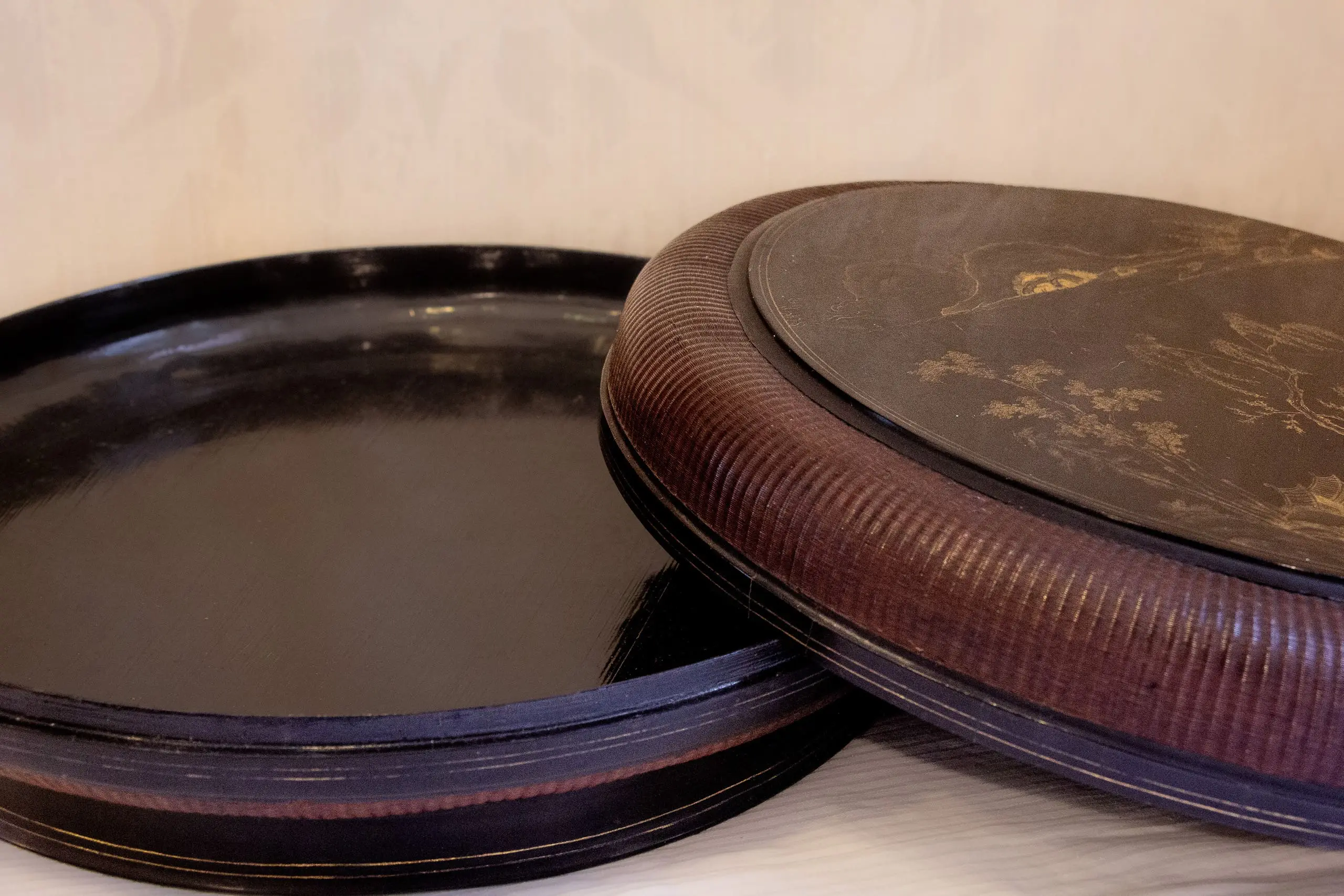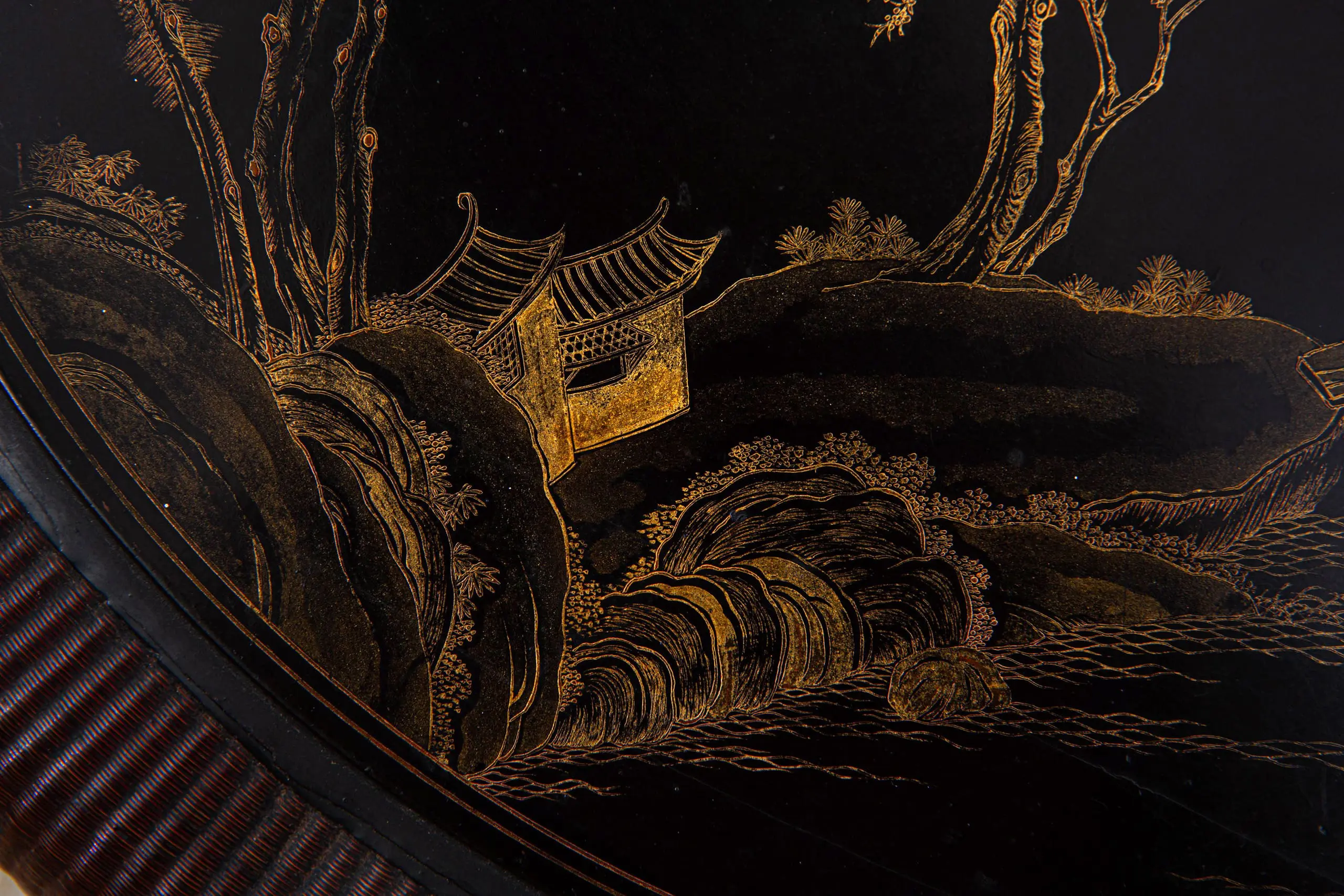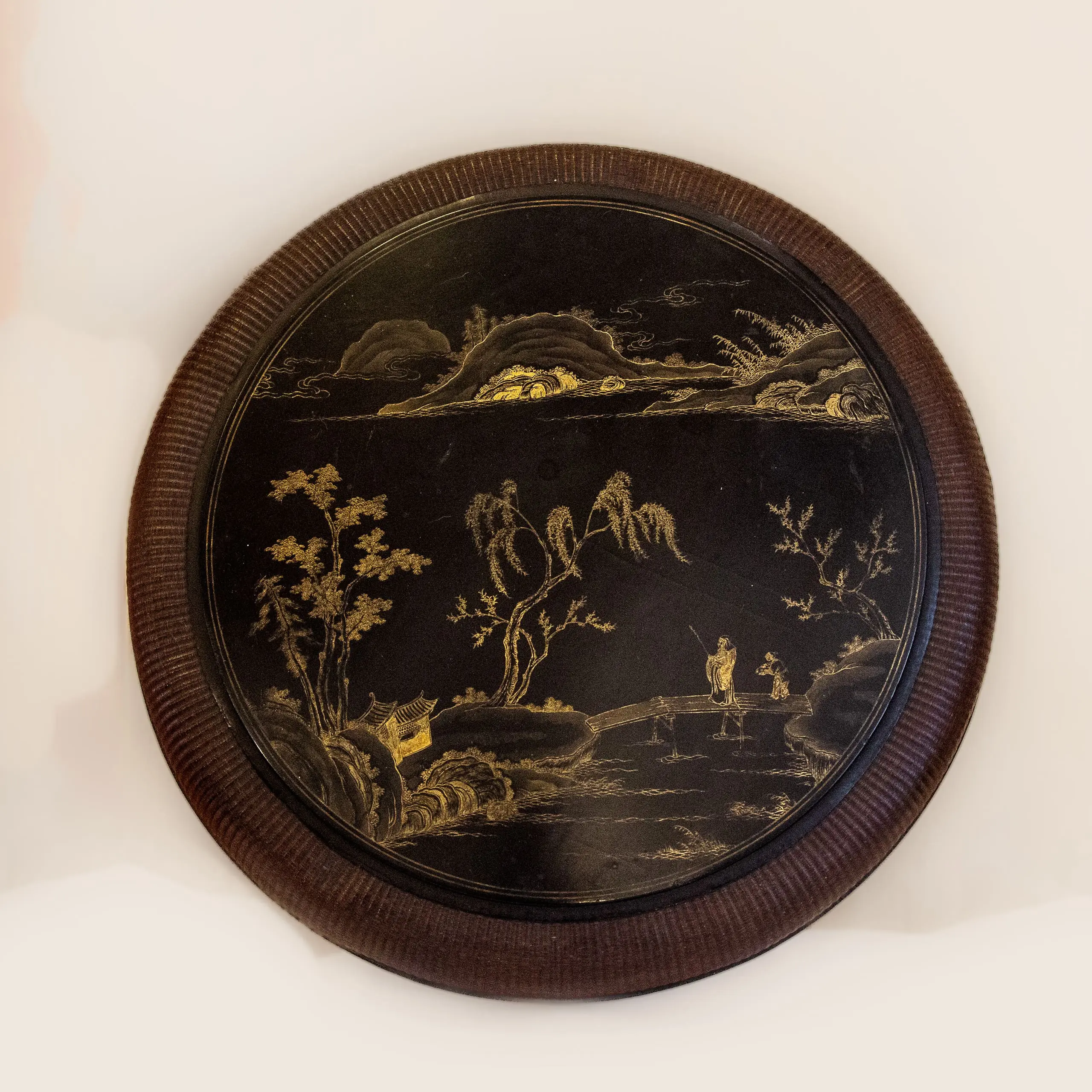 | Description | Finely woven bamboo and wood sewing box with landscape paintings on lid. |