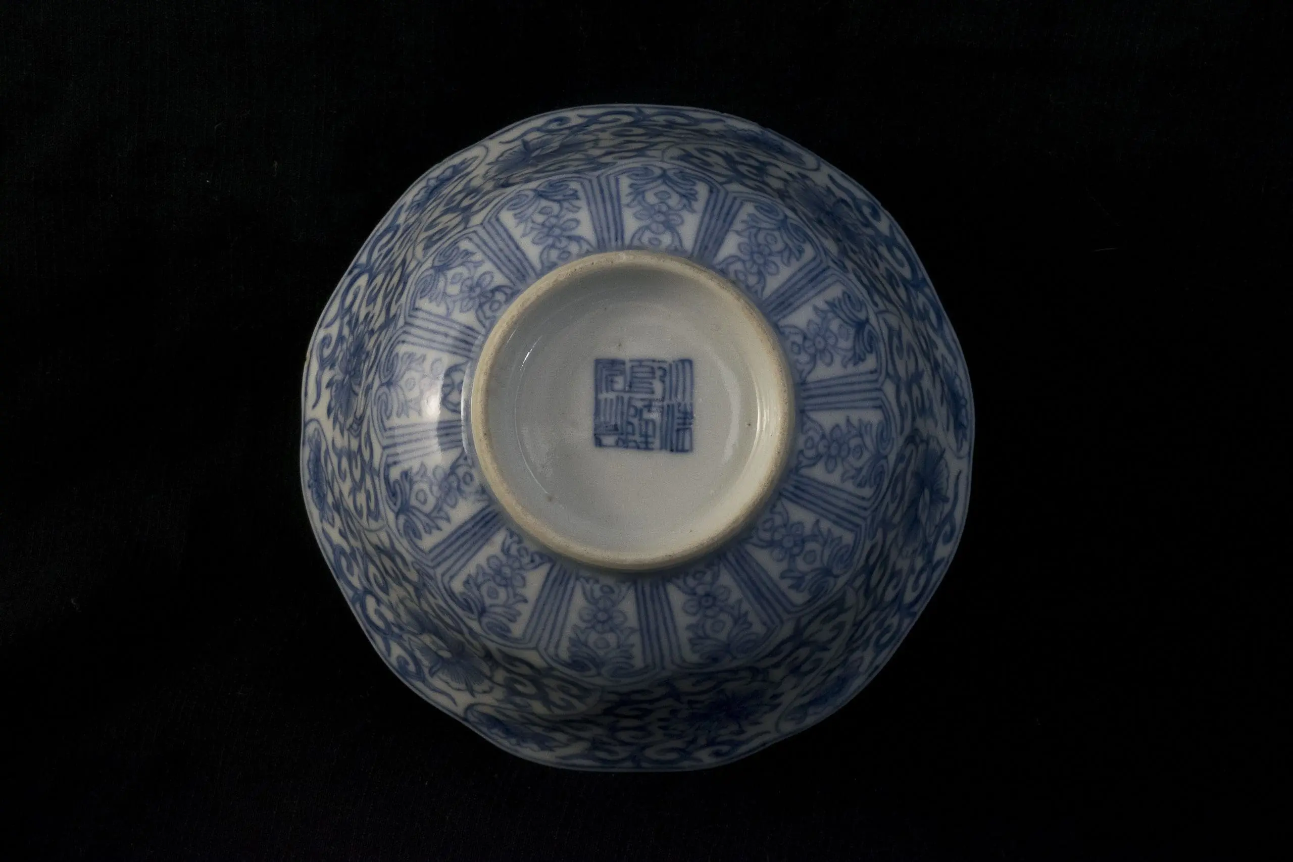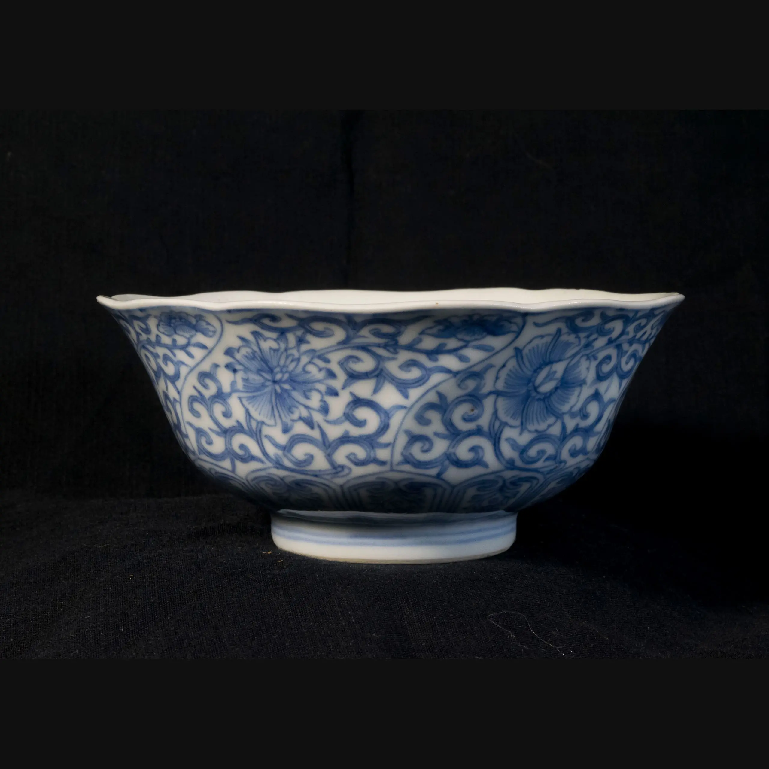 | Description | Small Daoguang period porcelain bowl with gently scalloped lip, decorated in underglaze blue. The sides feature scrolling leaf and floral motifs rendered in fine brushwork, rising above a short foot. |