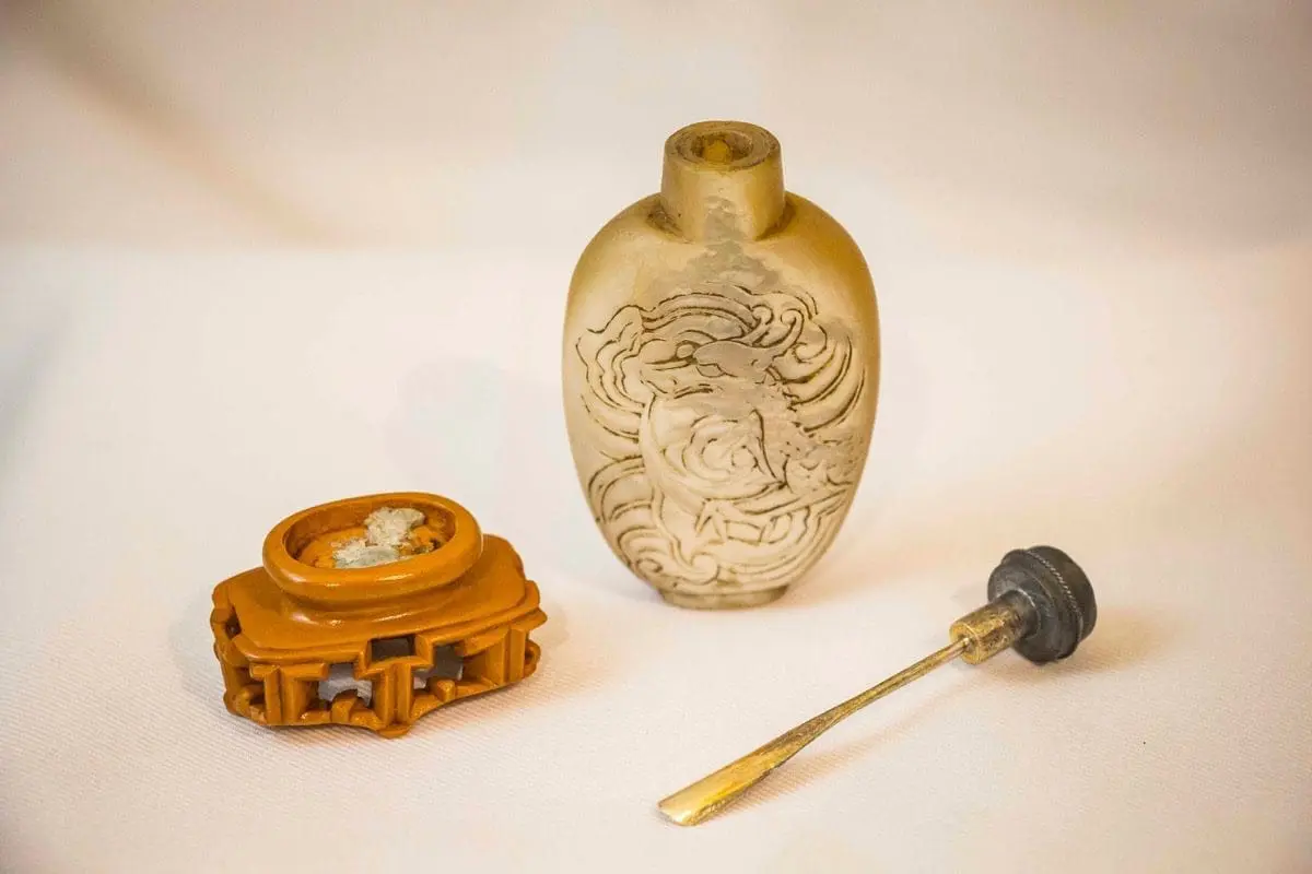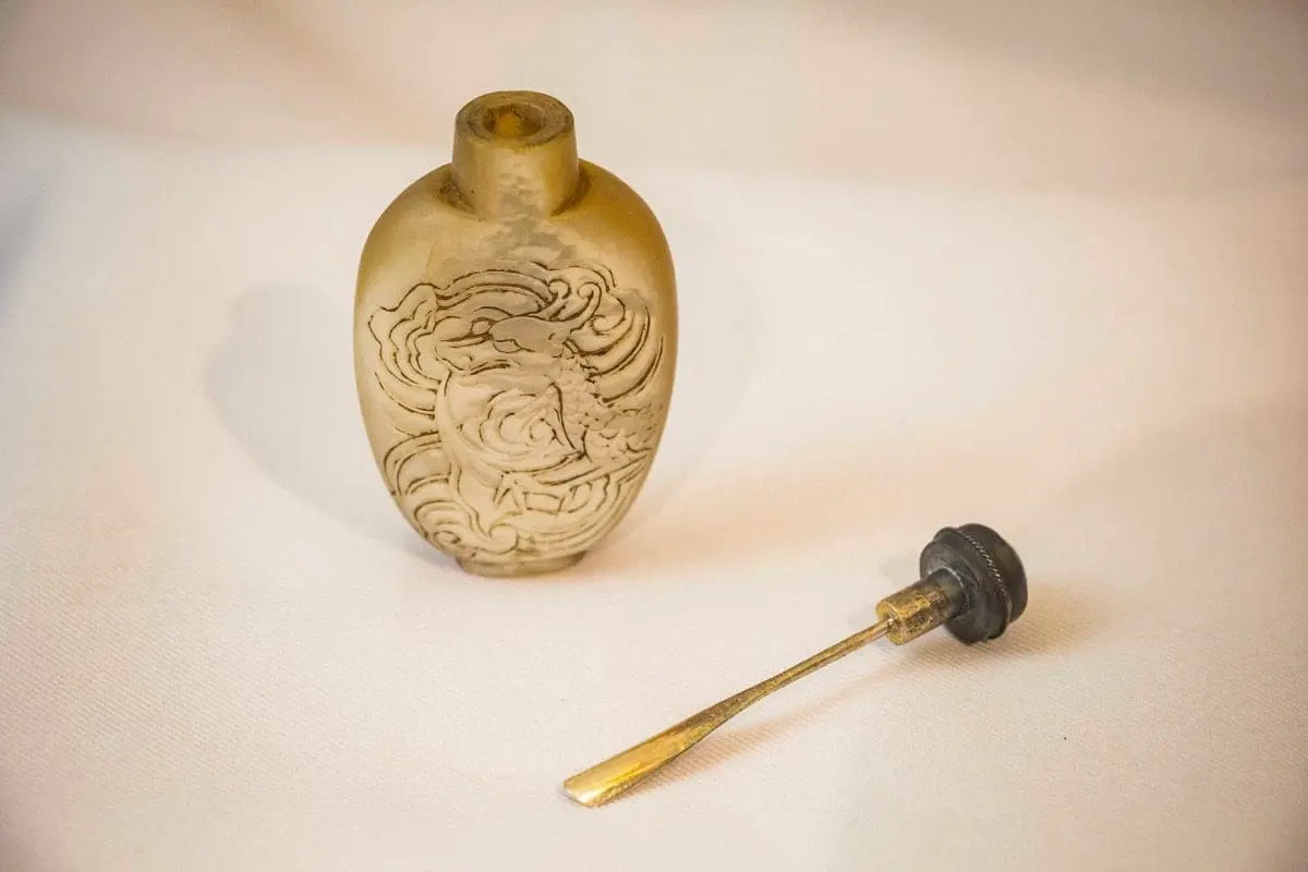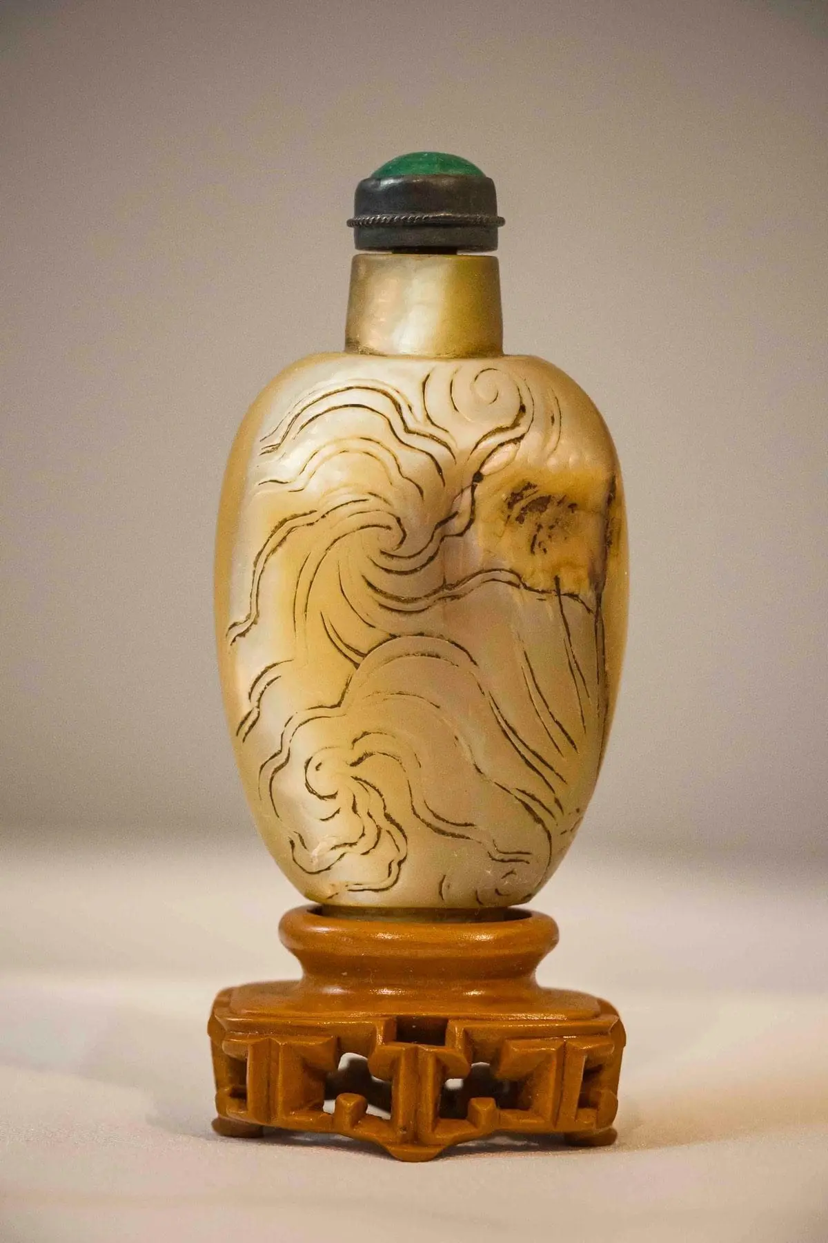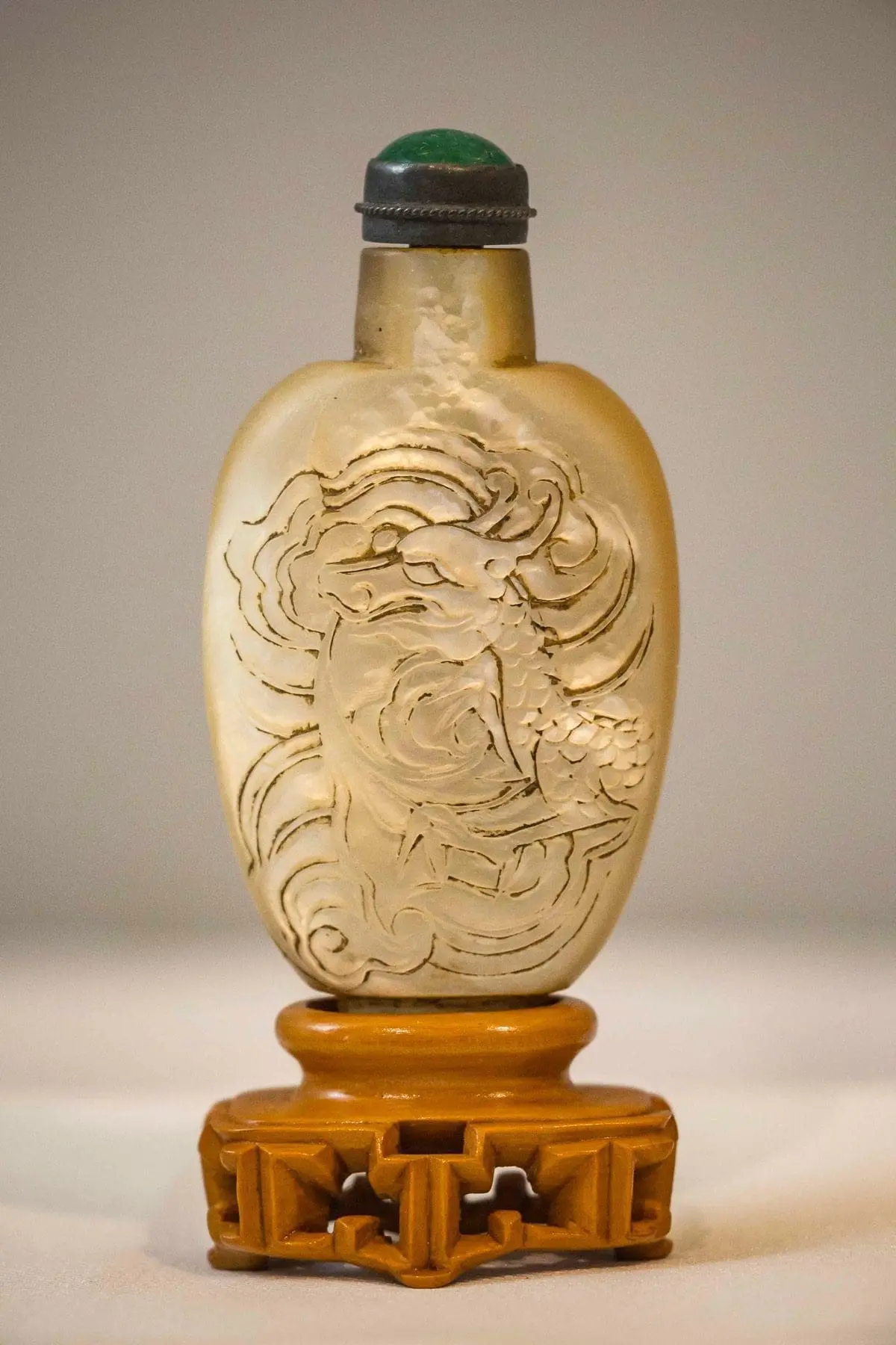 | Description | A snuff bottle of tortoise shell, with an incised carving of a dragon winding his way around the sides. |
