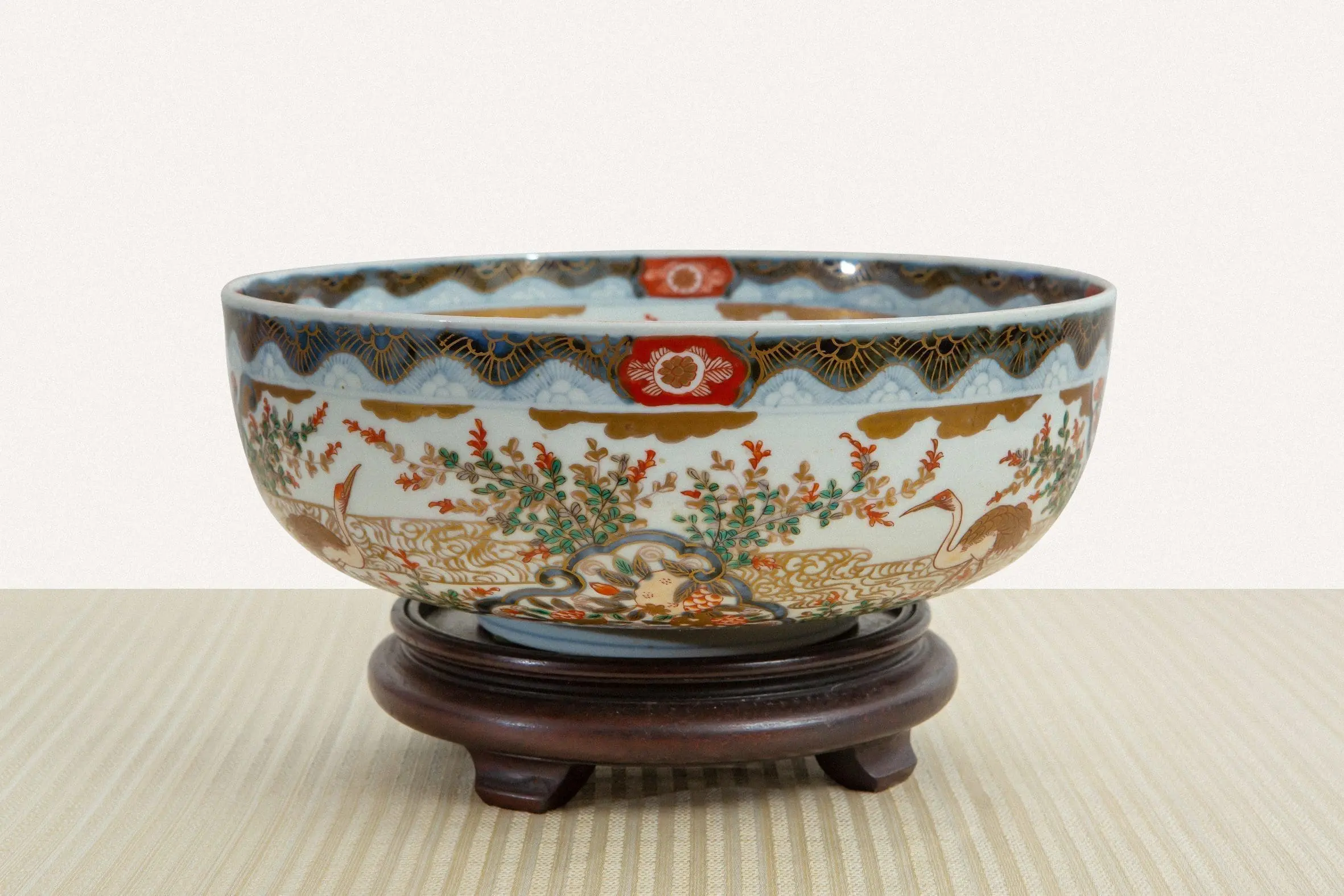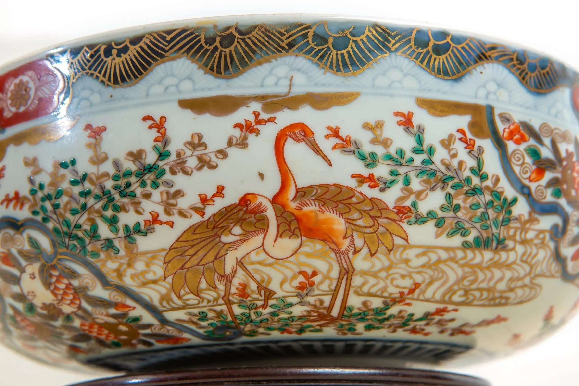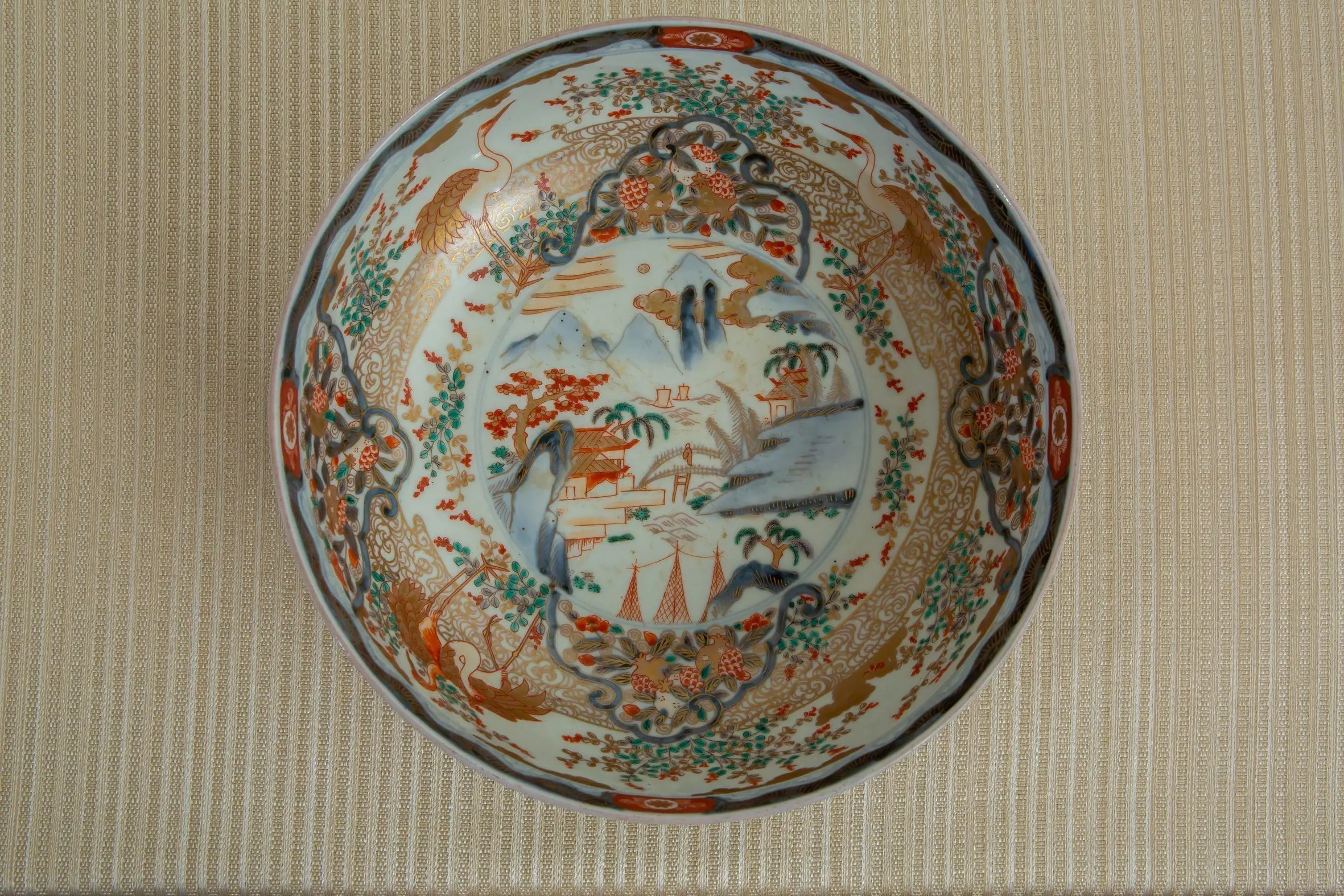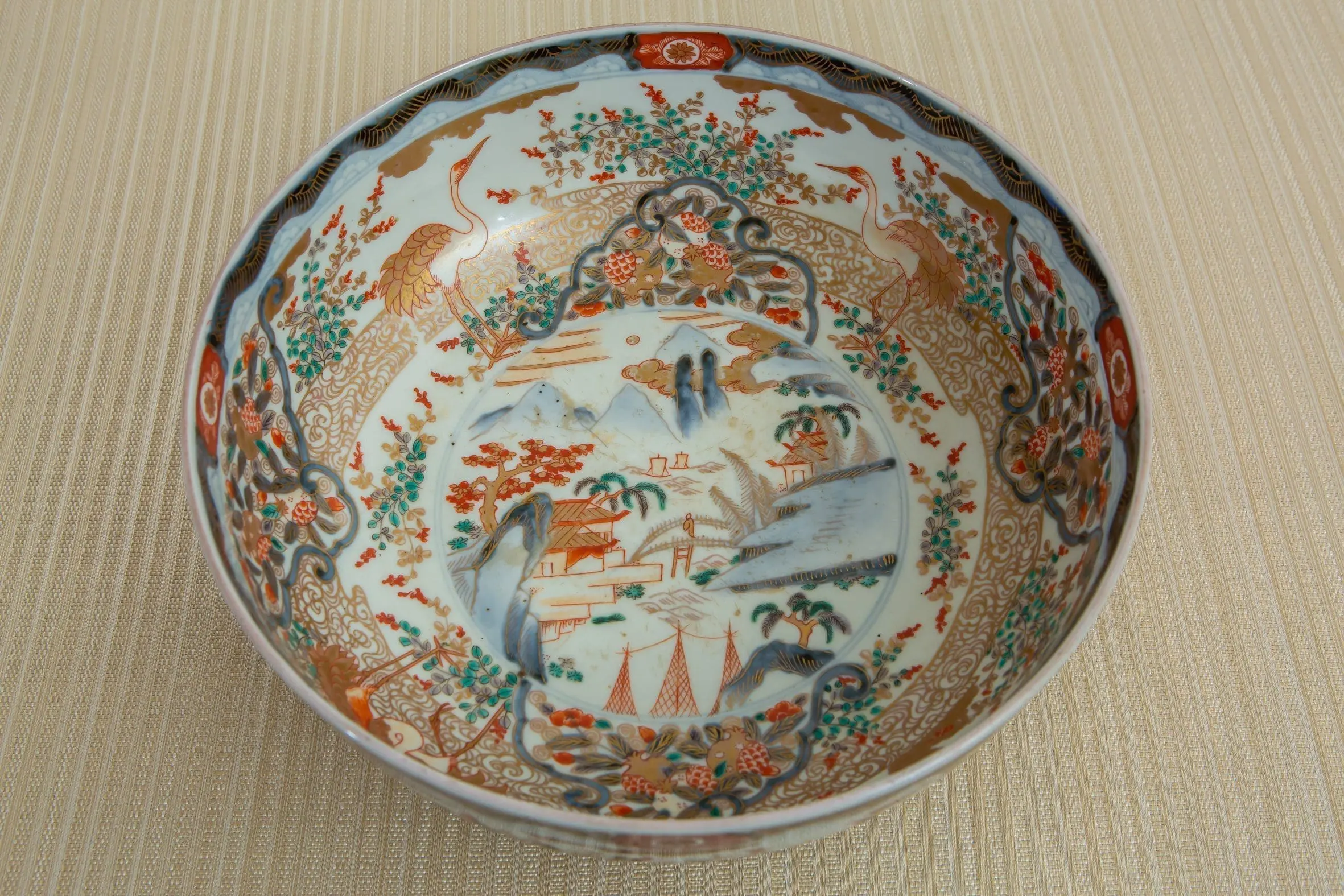 | Description | 19th century Japanese Arita/Imari bowl richly adorned with landscape scenes in underglaze blue, accented by overglaze iron-red and detailed with gilding. Cranes, floral sprays, and decorative panels encircle the body beneath a patterned rim. |
