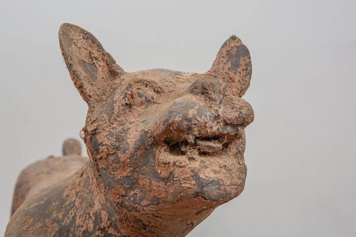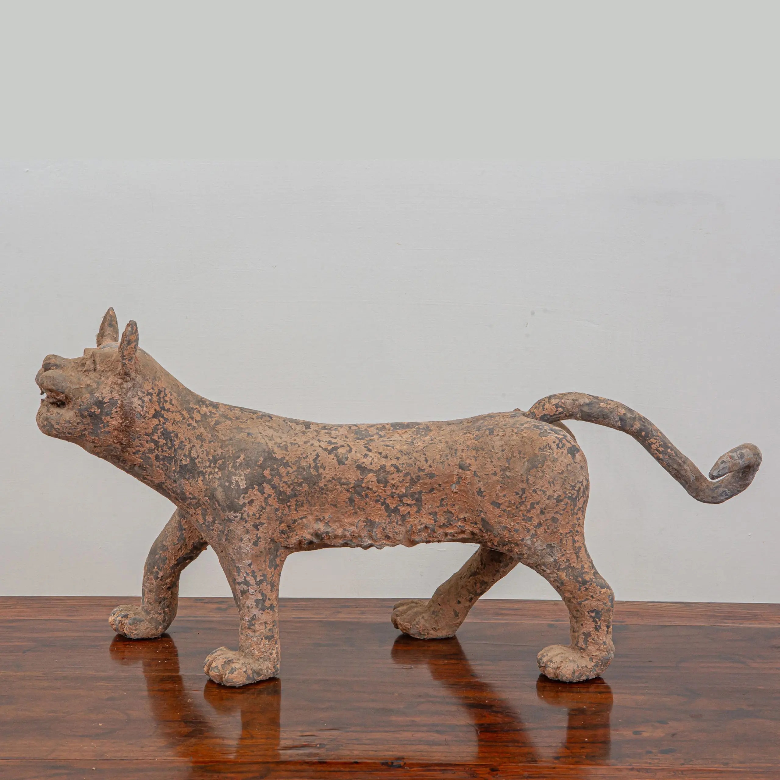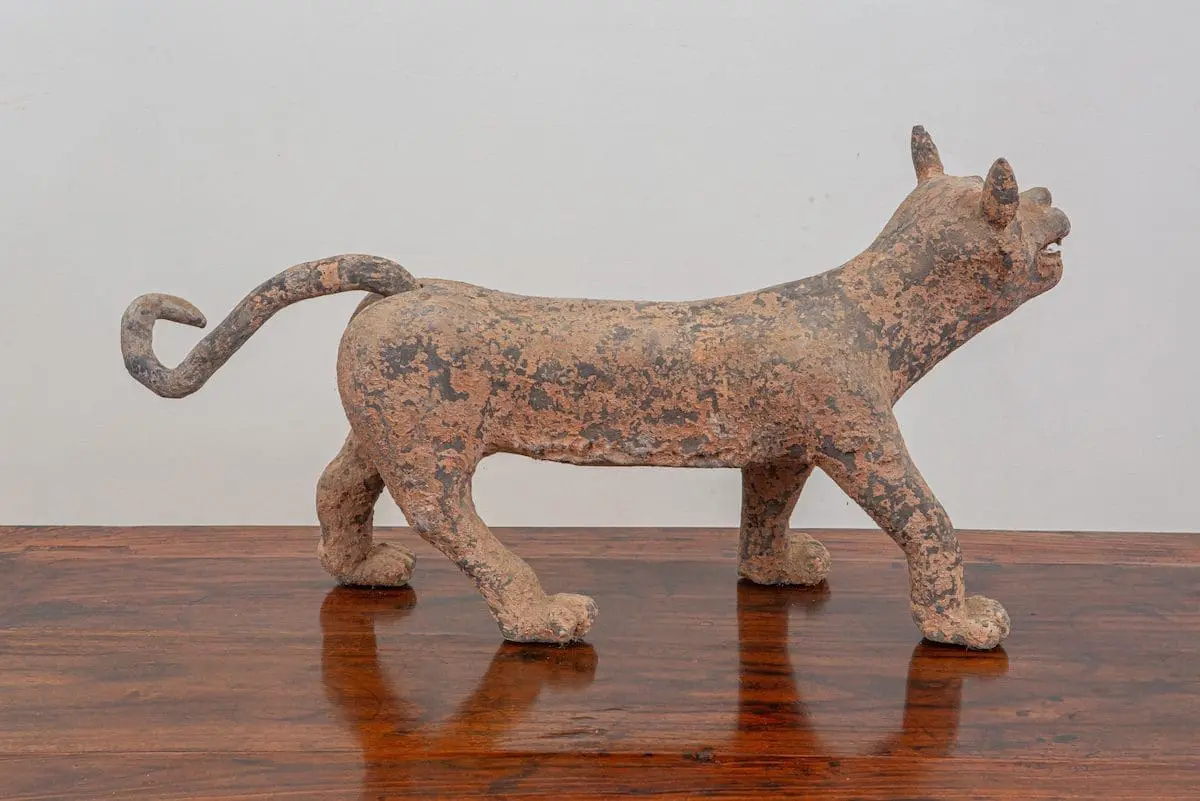 | Description | A unique Han tiger in dark brown pottery with reddish earth encrustations, a very ferocious face, removable tail. |