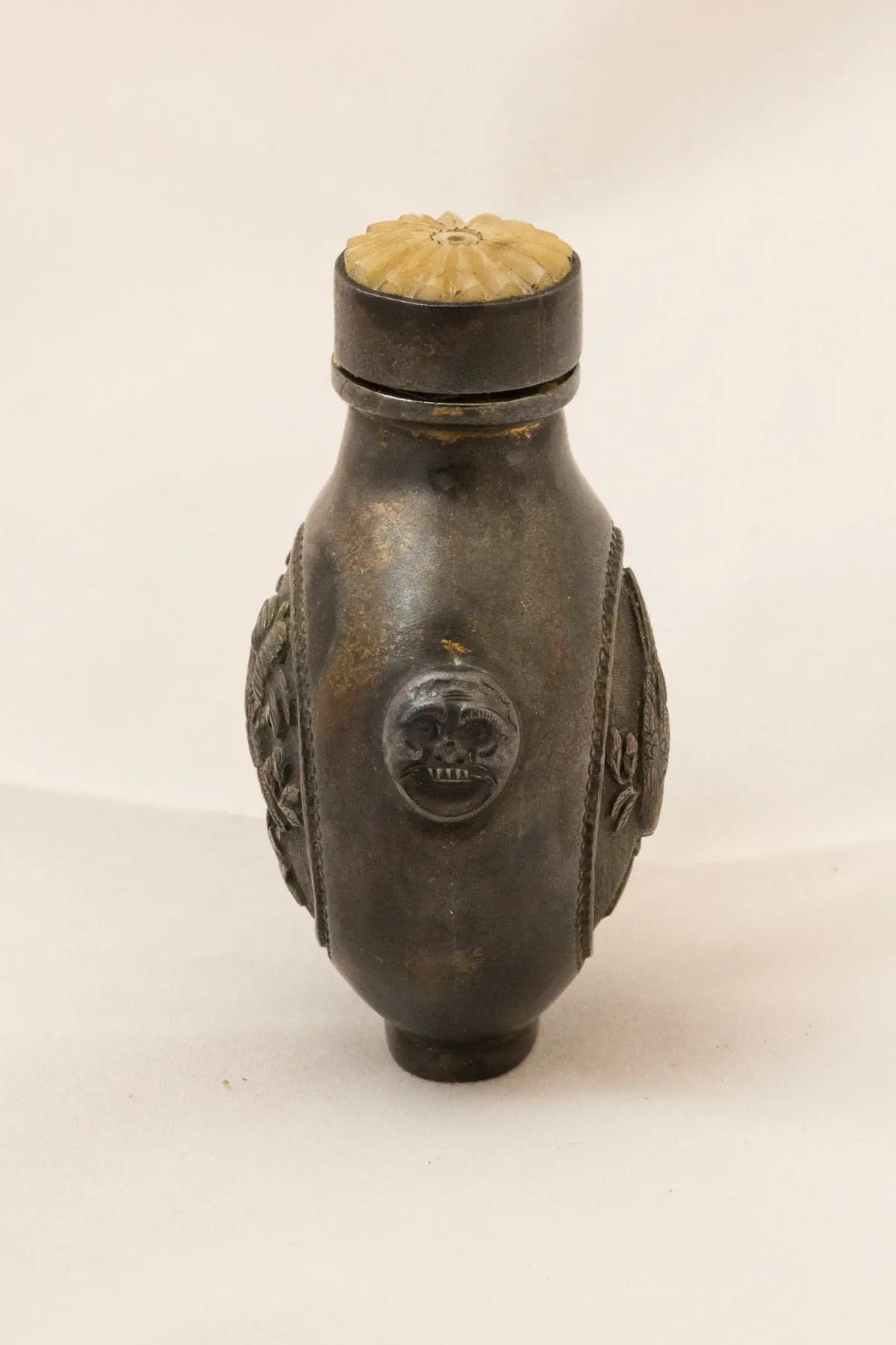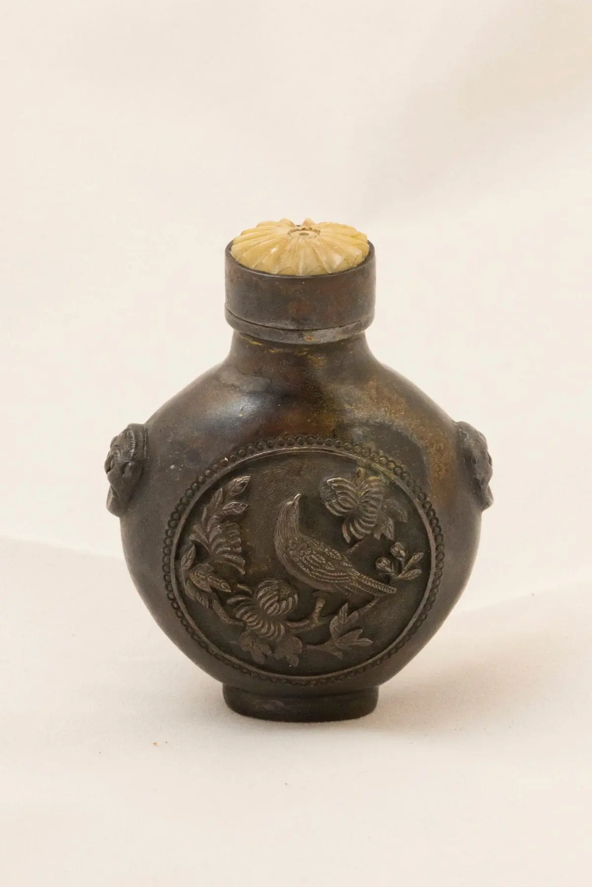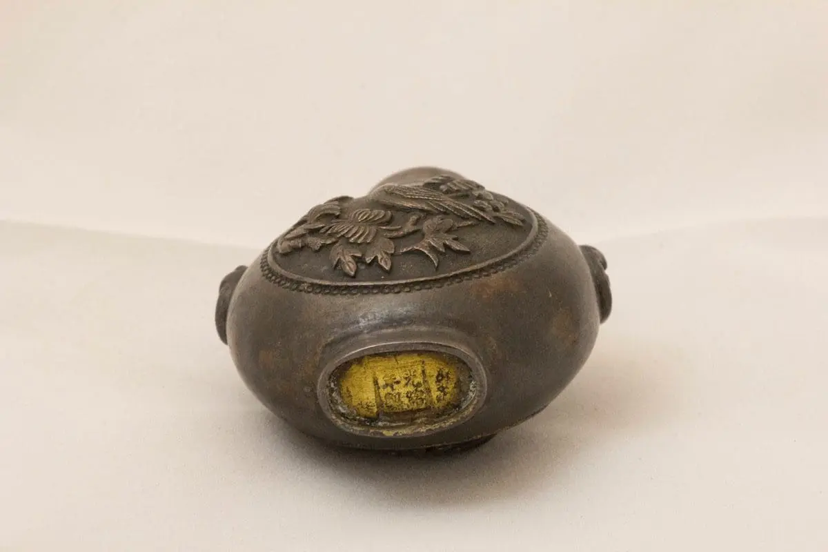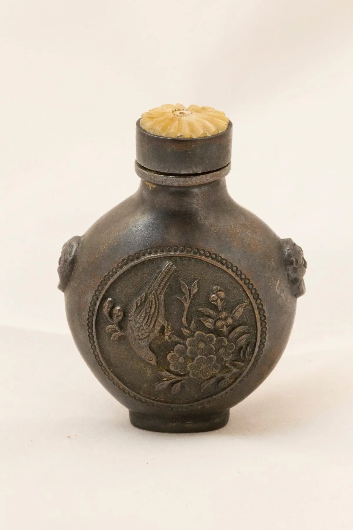 | Description | A gilded brass snuff bottle with center medallions on both sides of birds seated among flowering trees, carved in relief. |