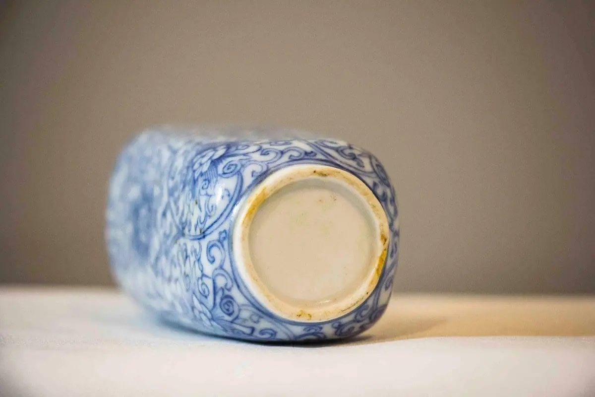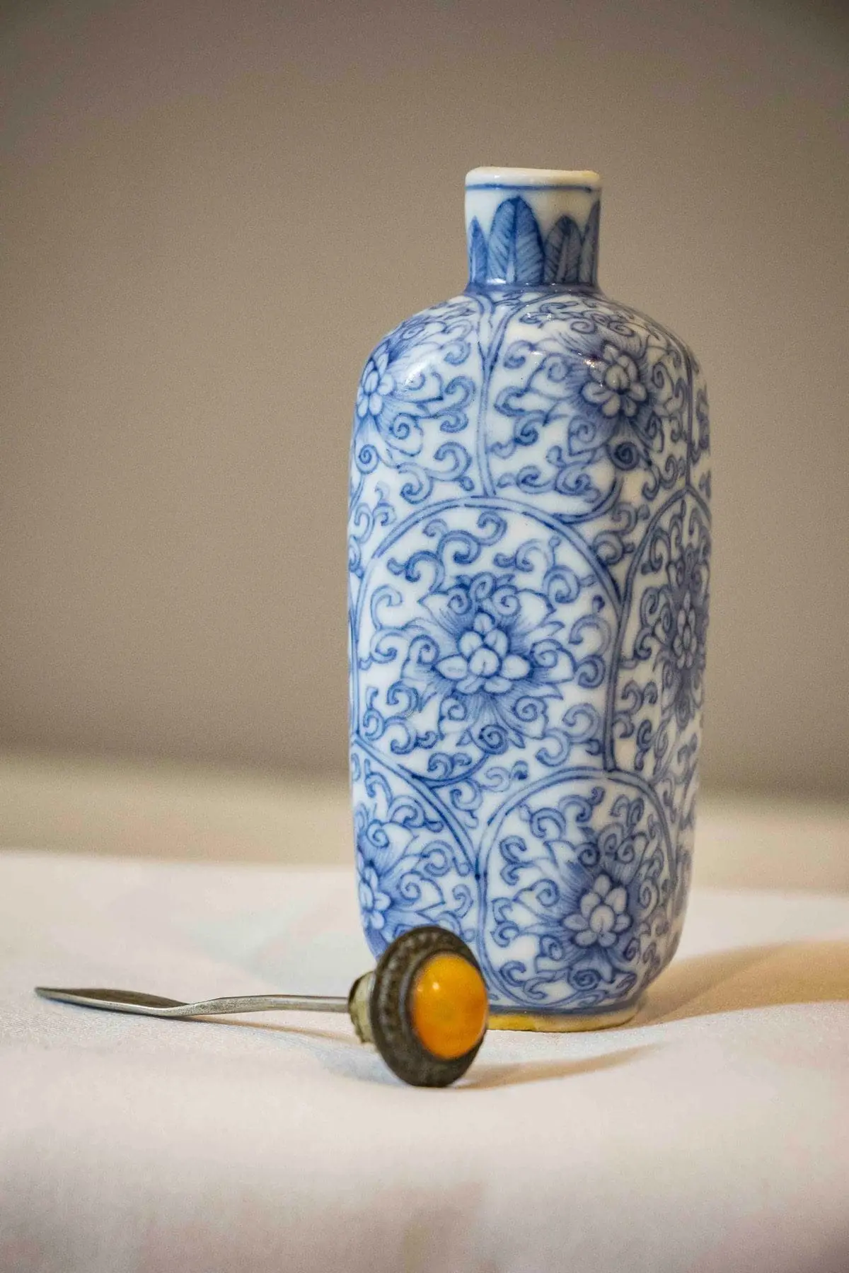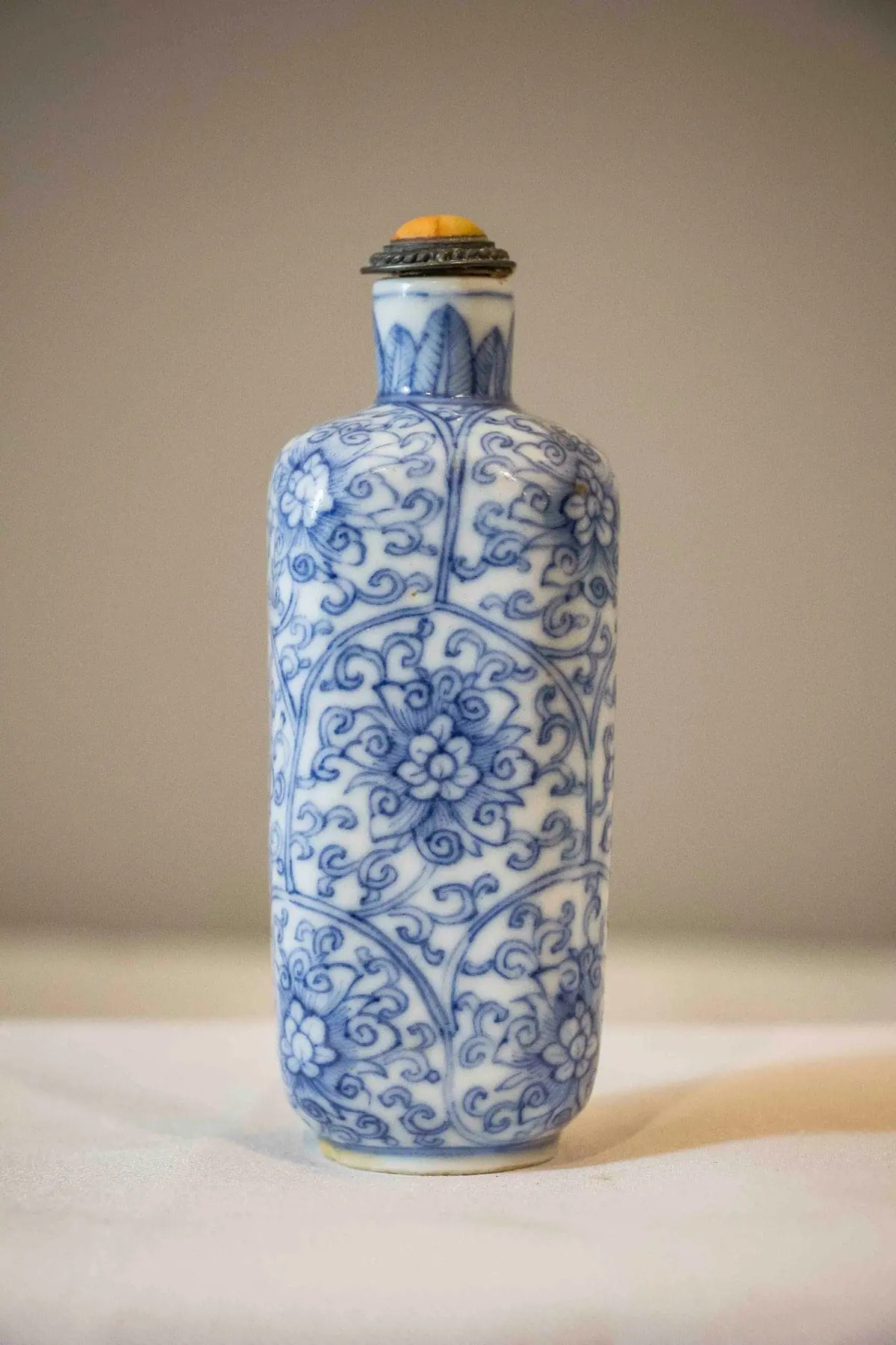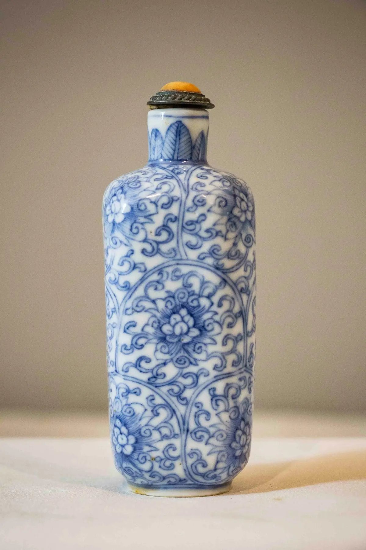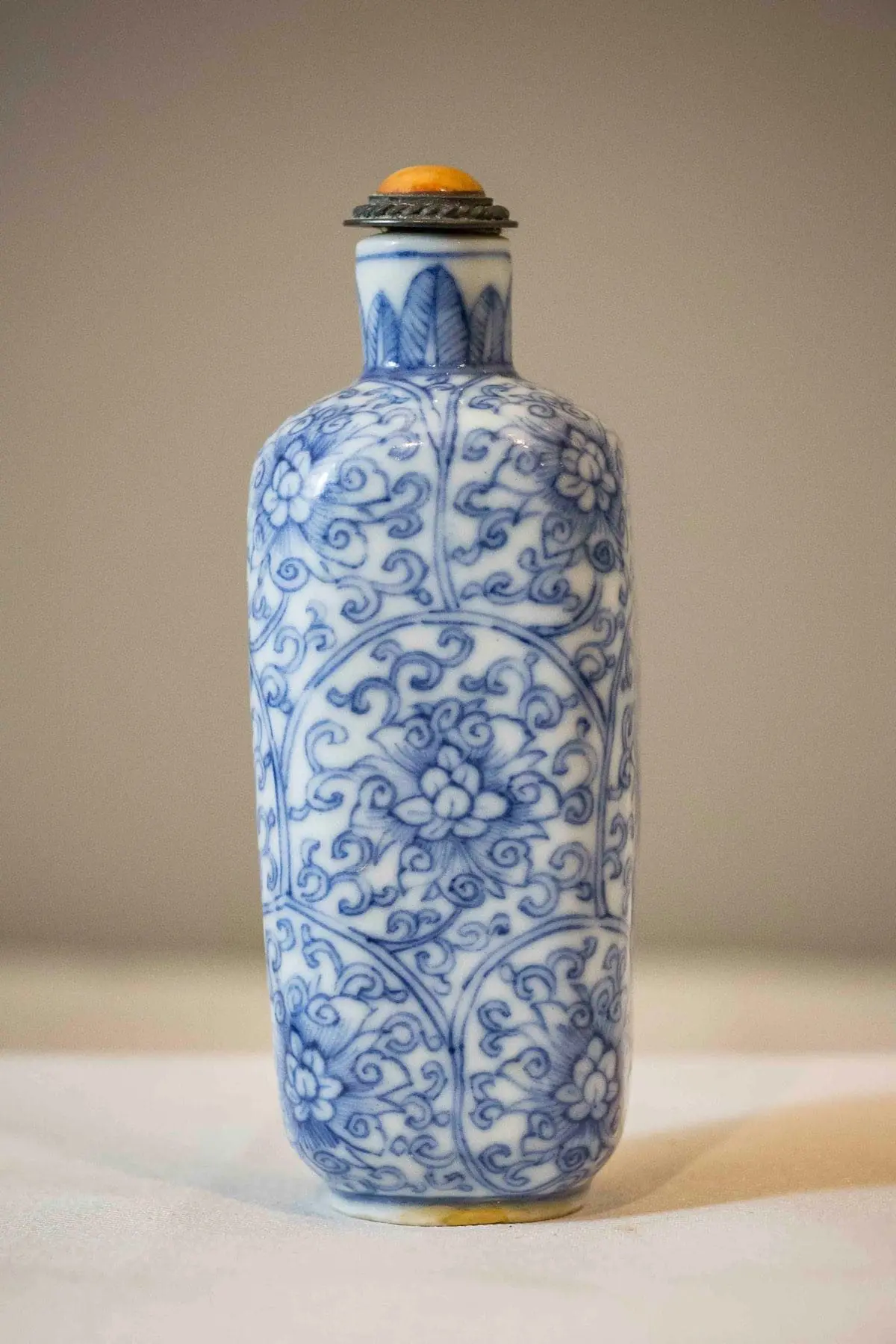 | Description | A square snuff bottle with rounded corners, underglaze cobalt blue paintings of blooming peonies among twining vines, banana leaf design painted around the neck, coral and metal stopper. |