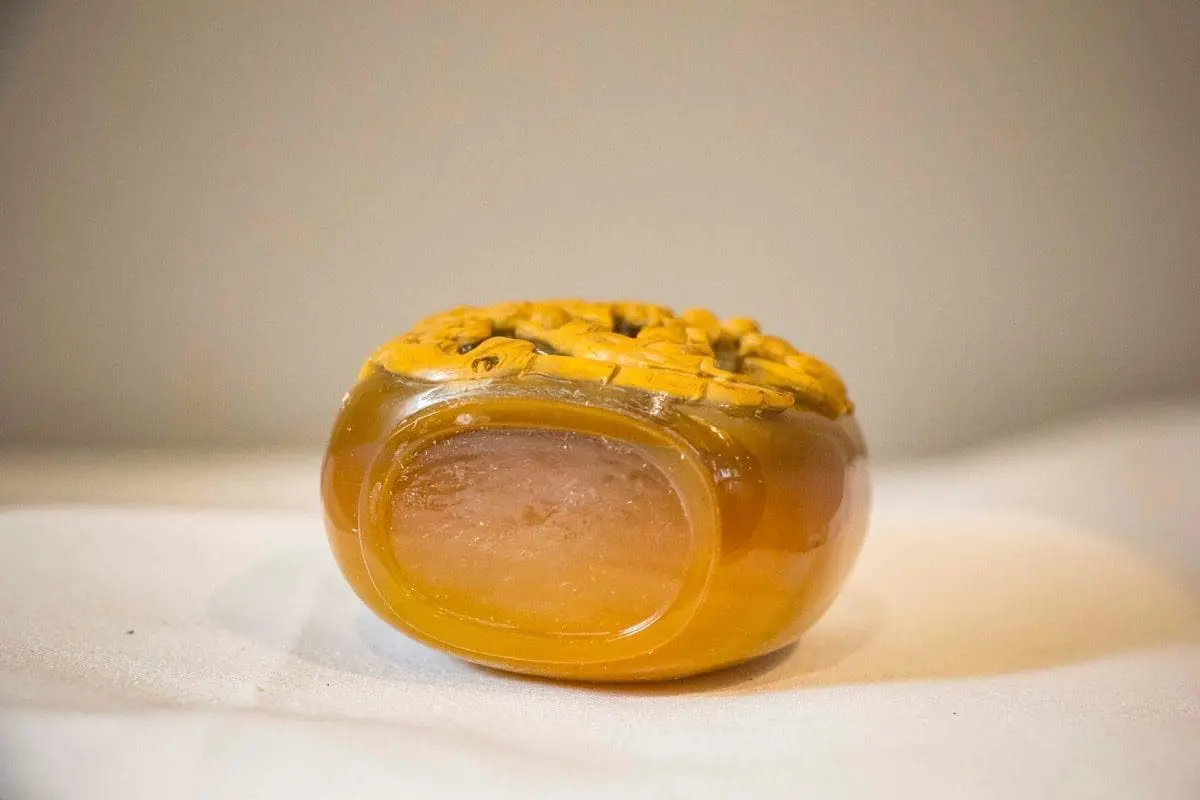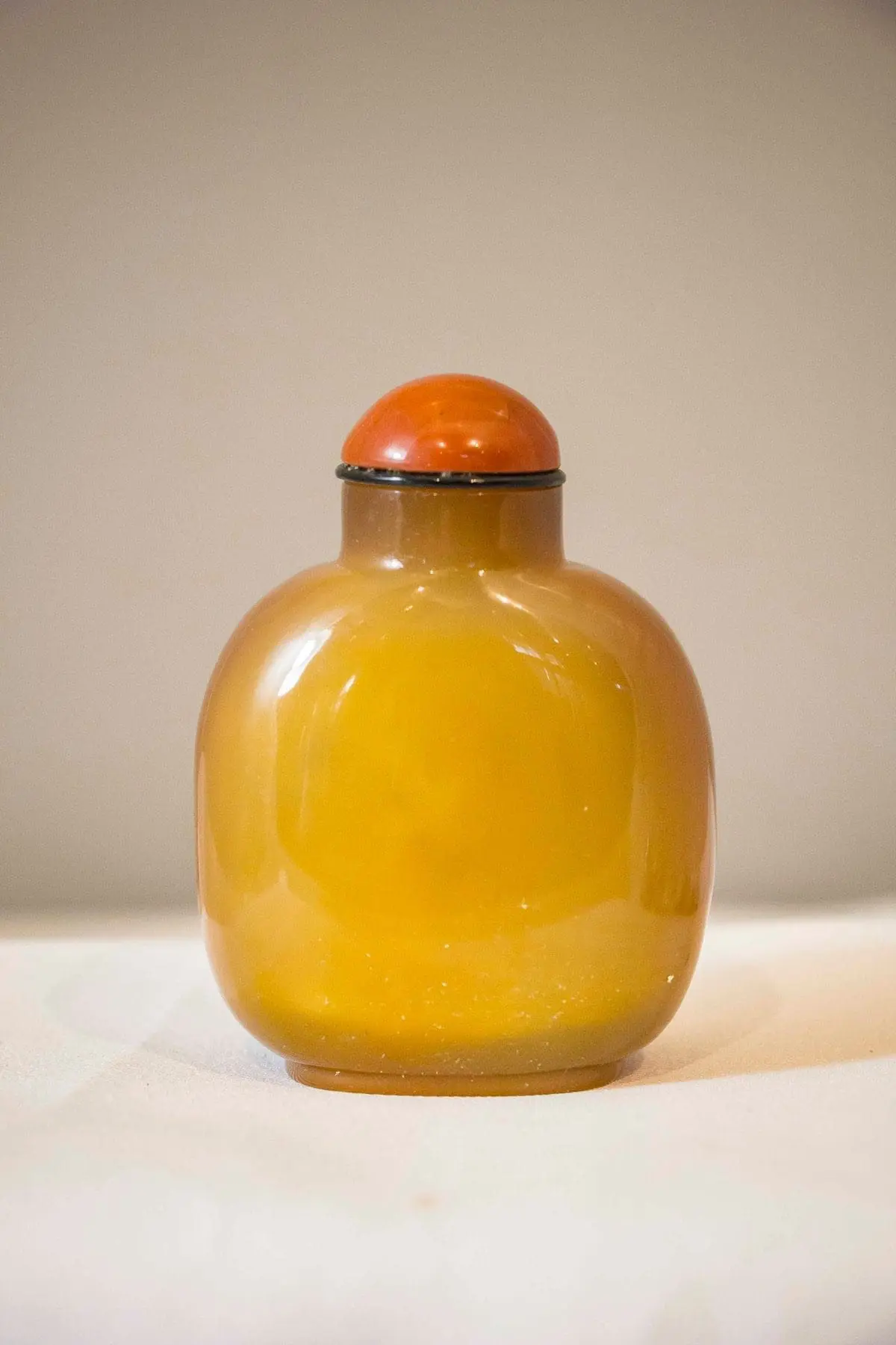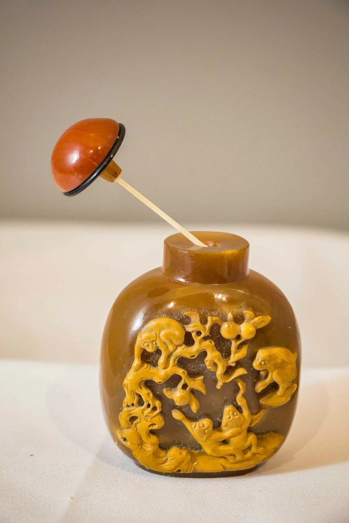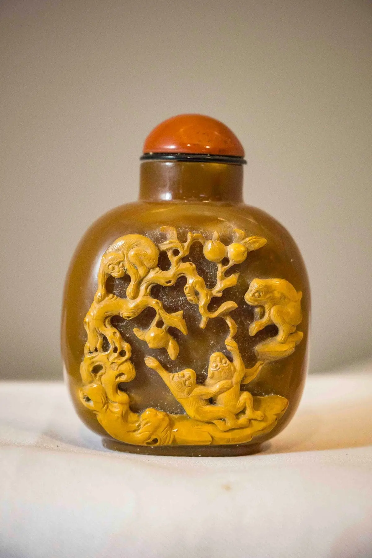 | Description | Snuff bottle in agate with repousse carvings in lighter brown of a family of four monkeys playing in a tree. Cornelian stopper. |