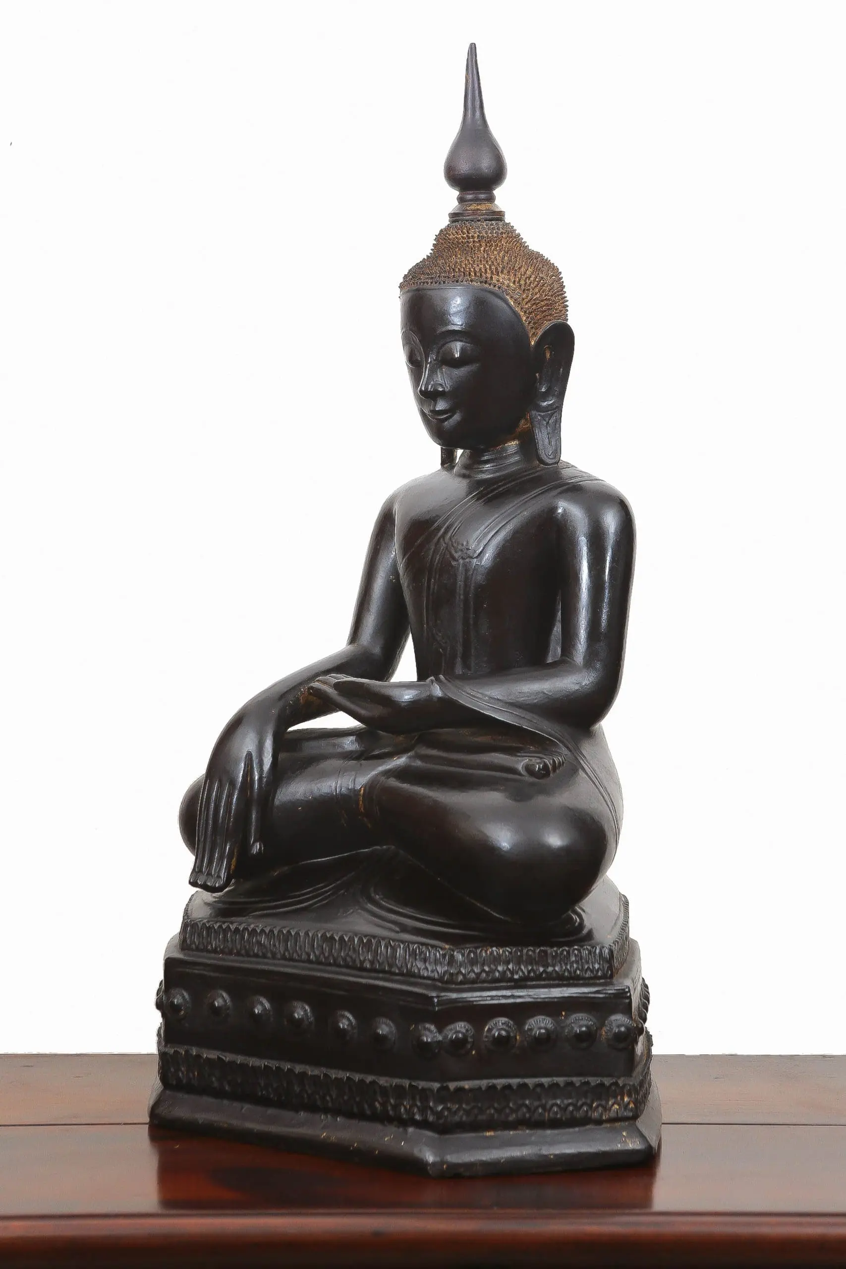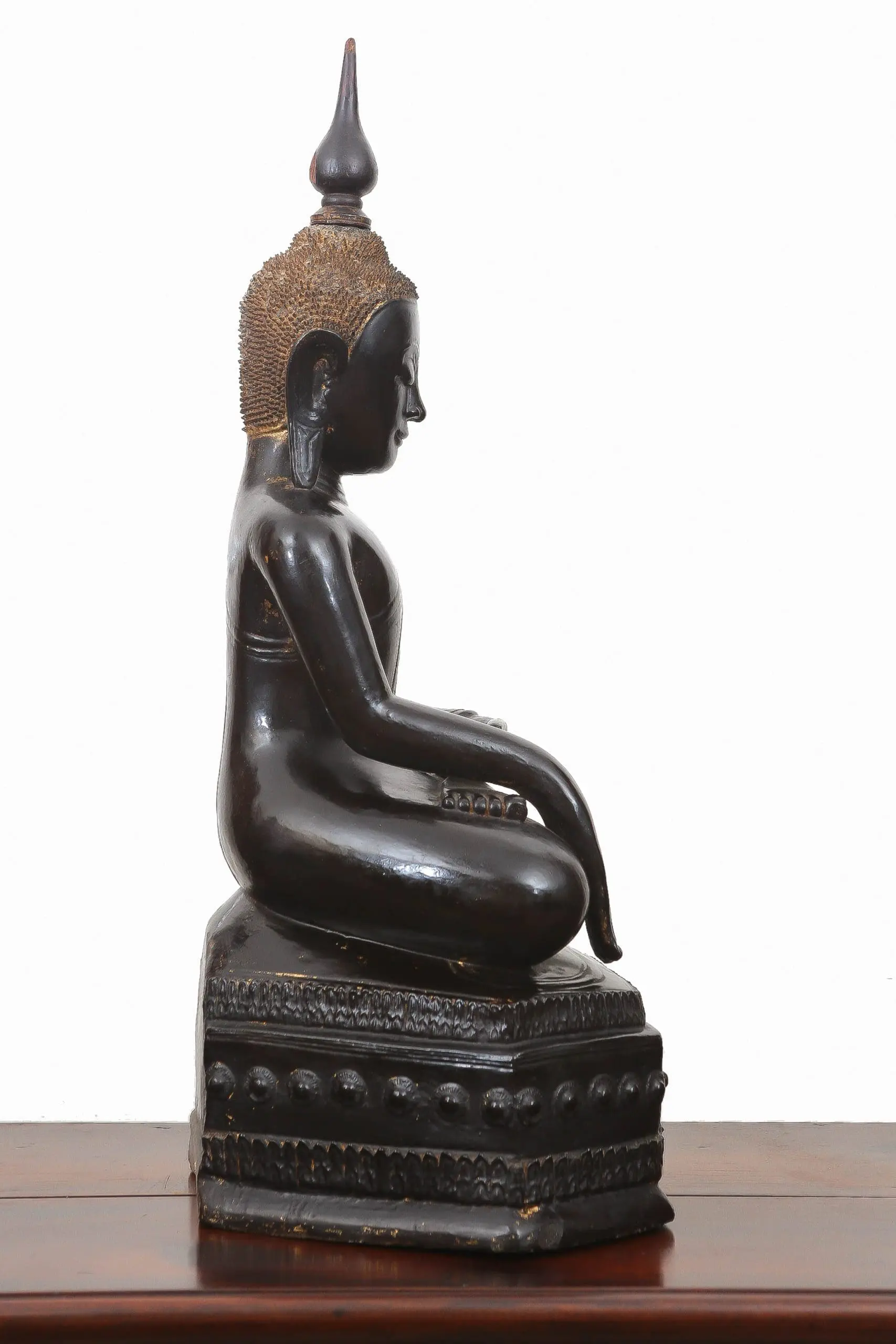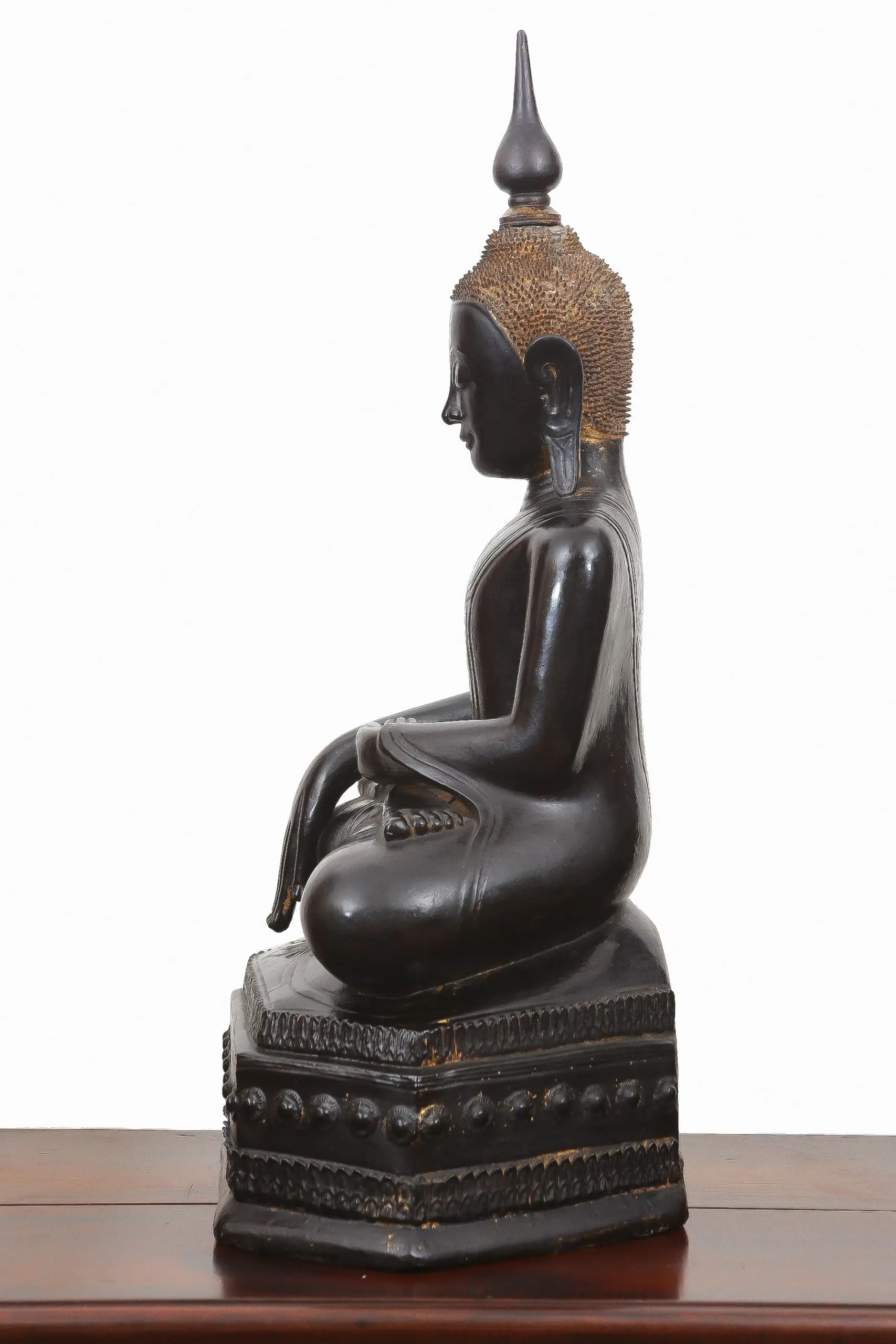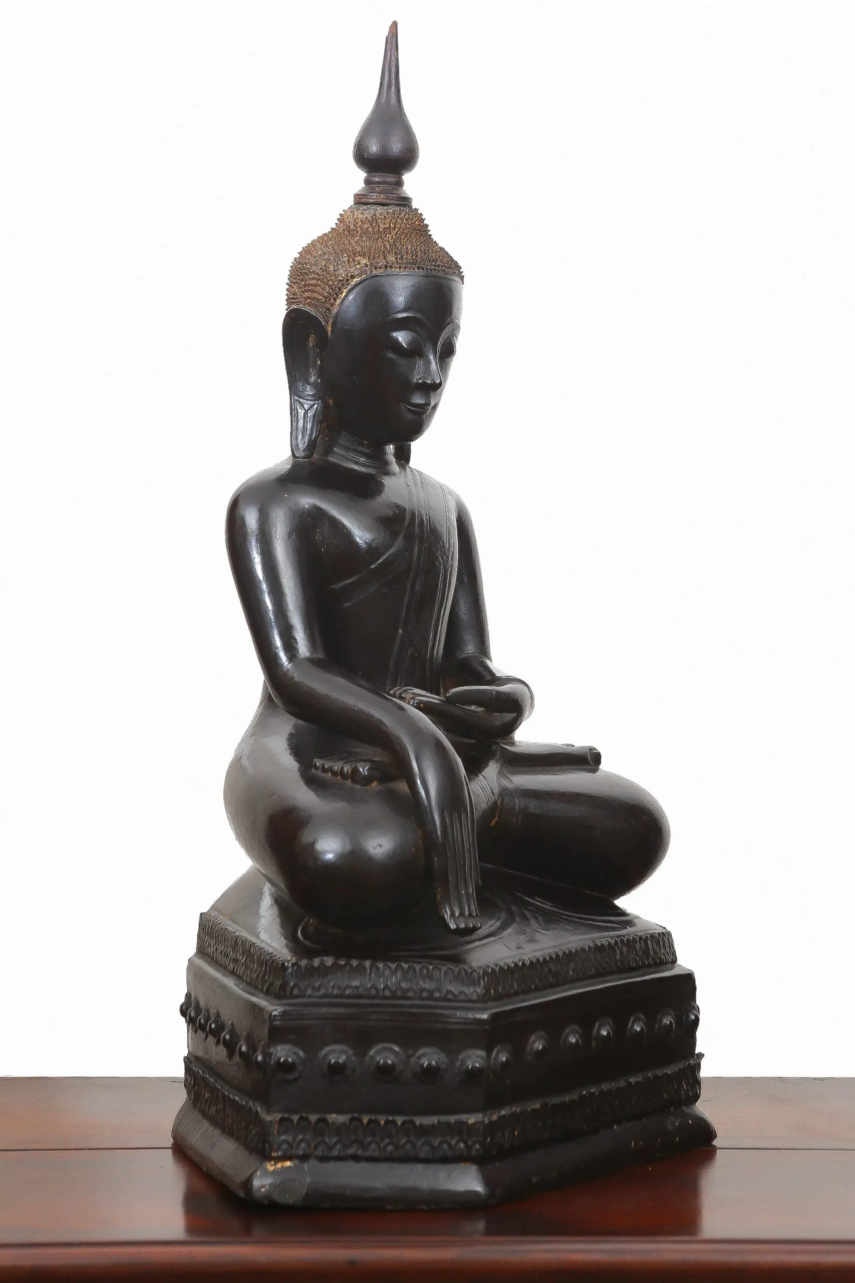 | Description | A large late 18th-century Shan crown Buddha, crisply carved in teak and seated upon an octagonal throne in the Subduing Mara mudra. Black lacquer and gilding survive with warm patina. Regal, serene, and devotional, it embodies Shan Buddhist aesthetics during a period of cultural refinement and monastic patronage. |