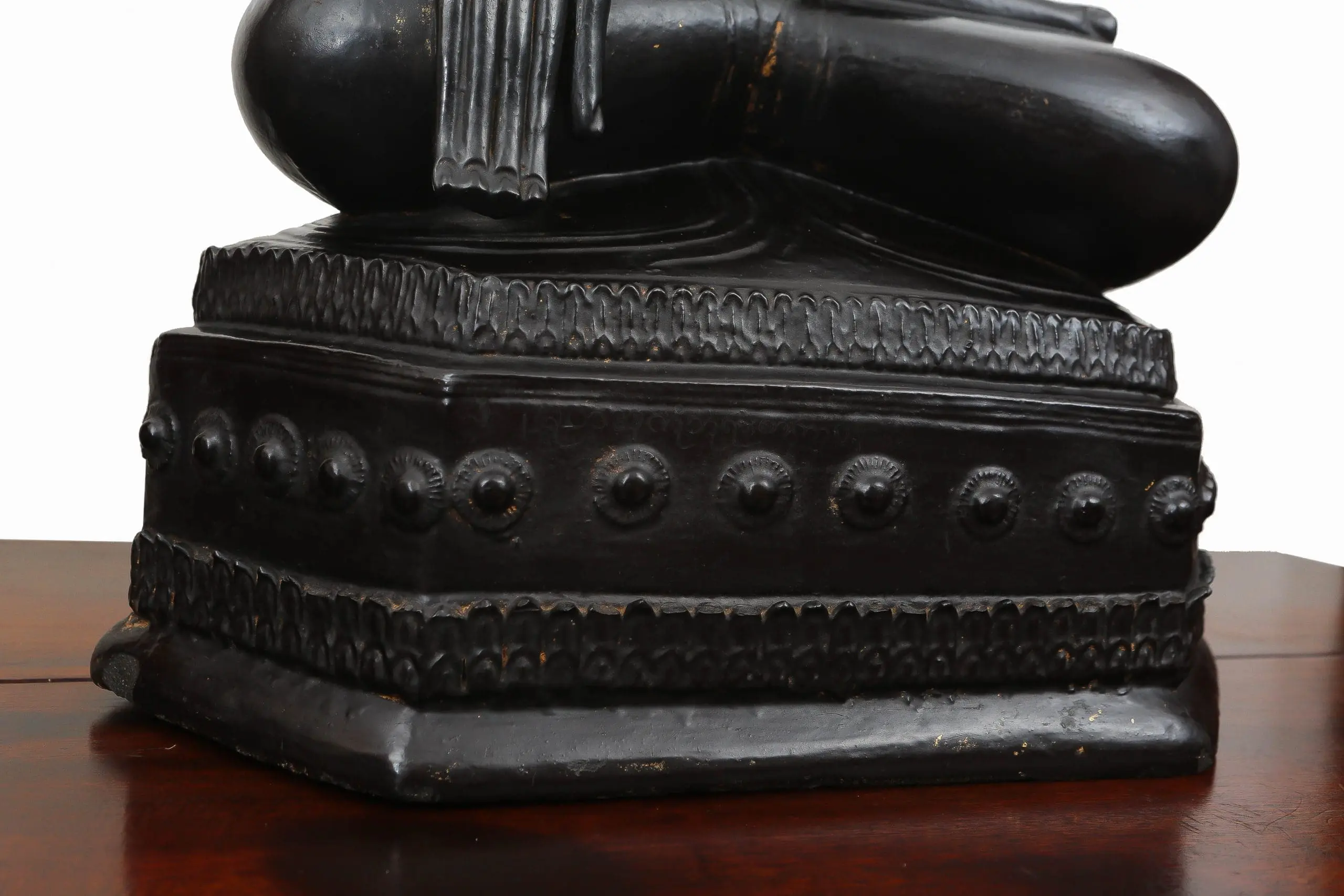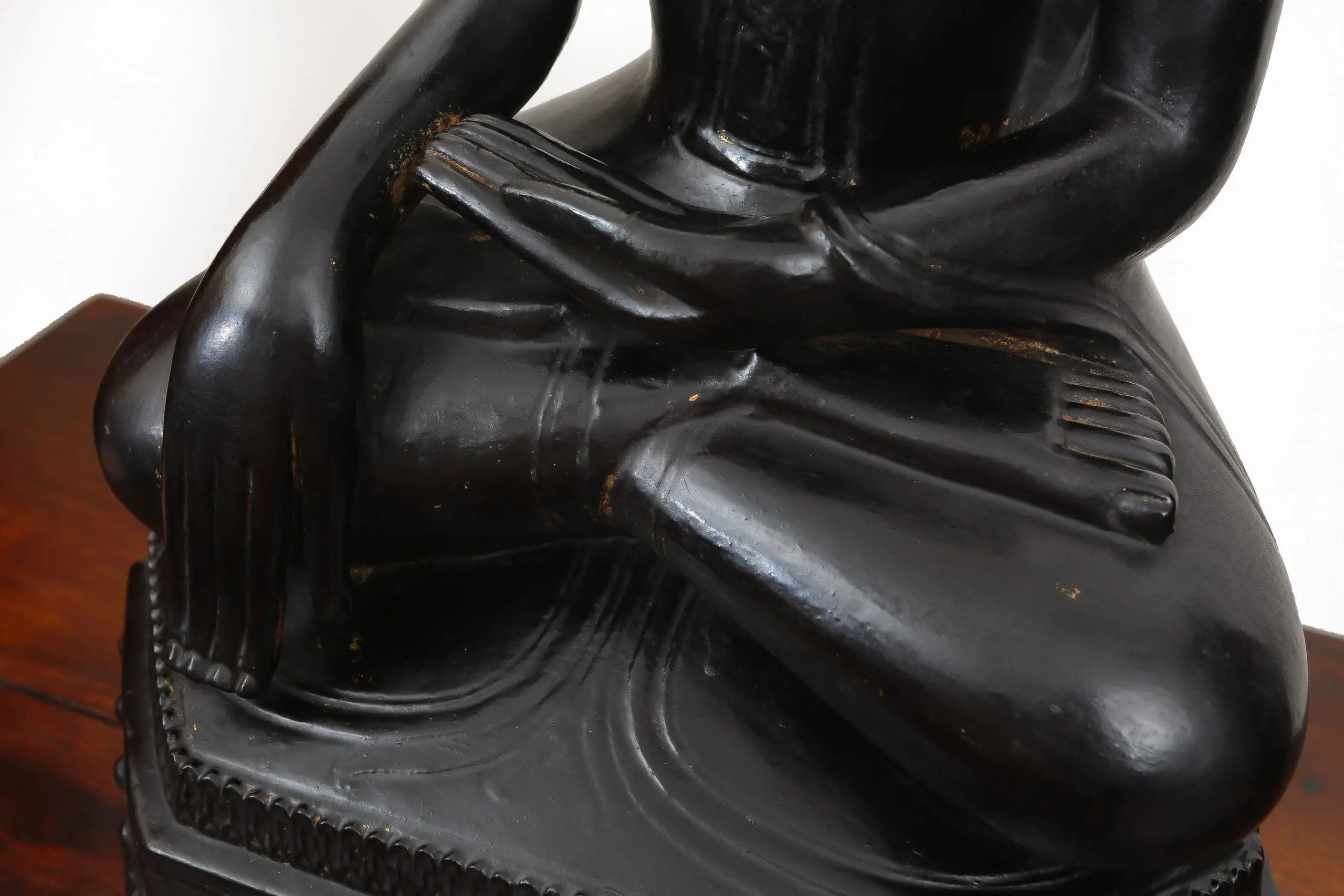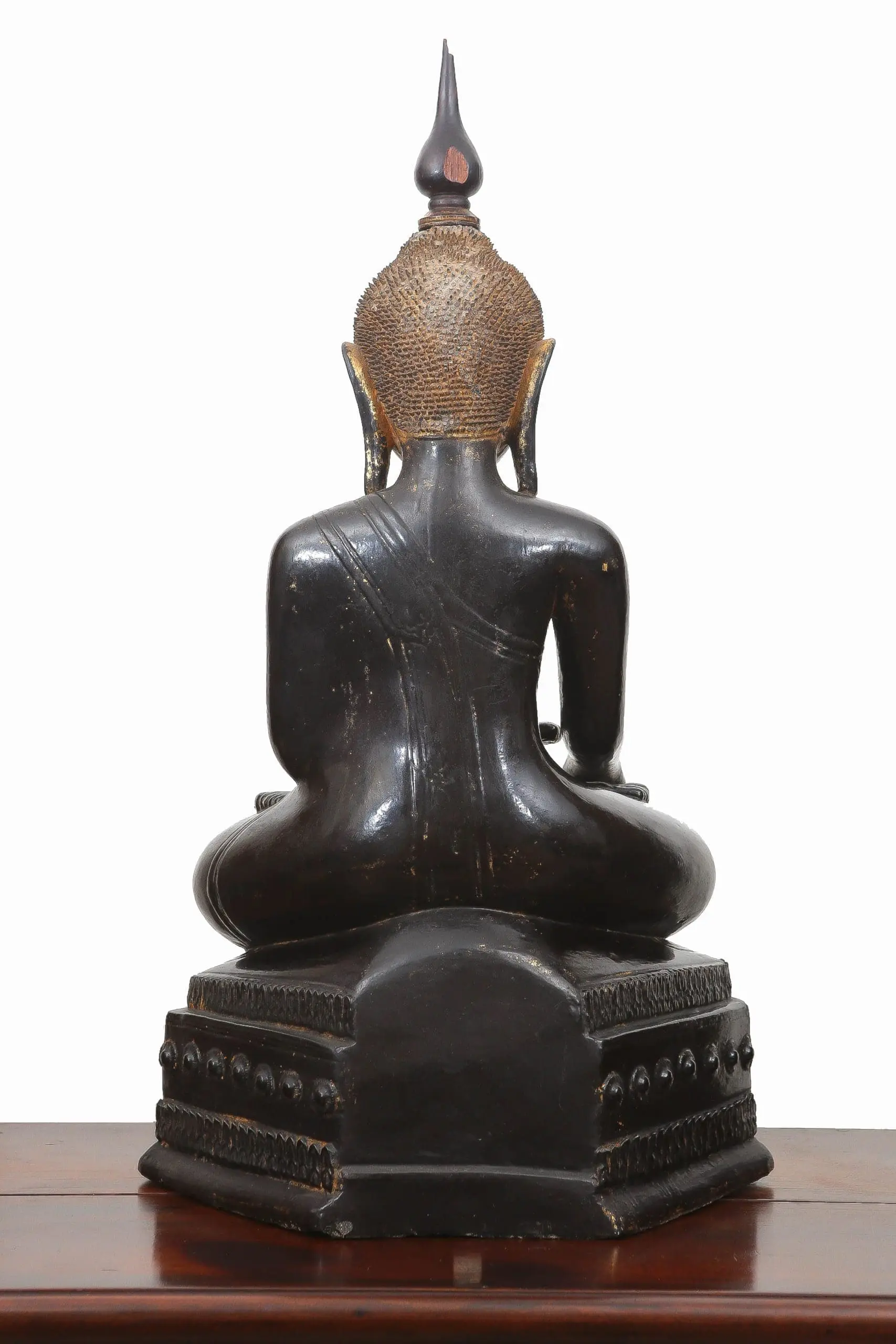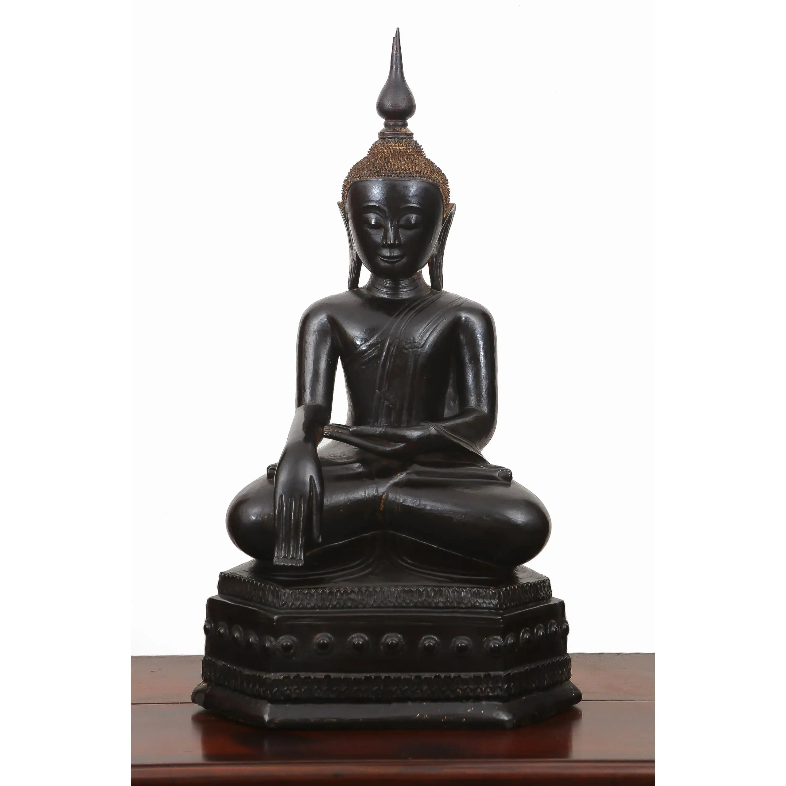 | Description | A large late 18th-century Shan crown Buddha, crisply carved in teak and seated upon an octagonal throne in the Subduing Mara mudra. Black lacquer and gilding survive with warm patina. Regal, serene, and devotional, it embodies Shan Buddhist aesthetics during a period of cultural refinement and monastic patronage. |