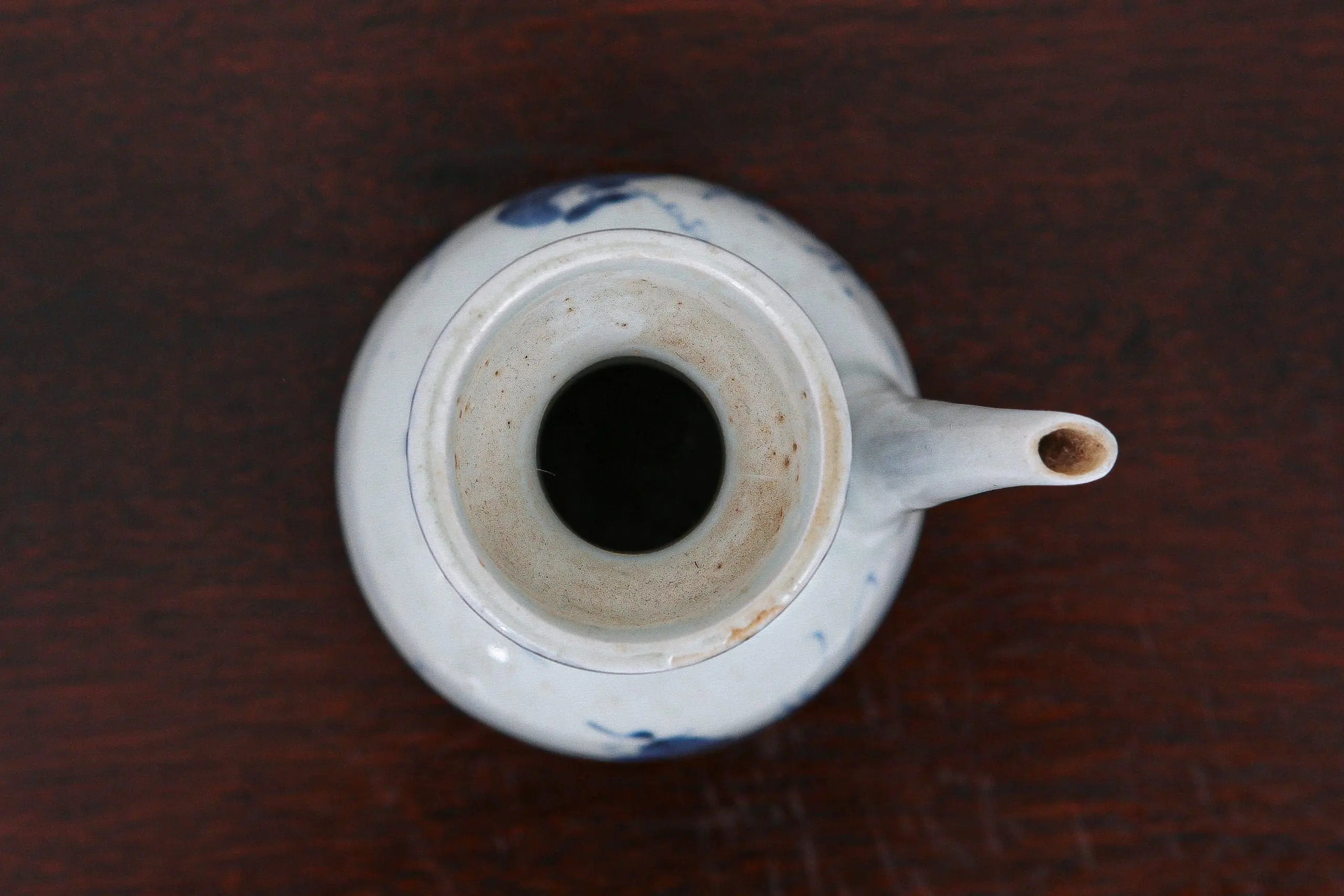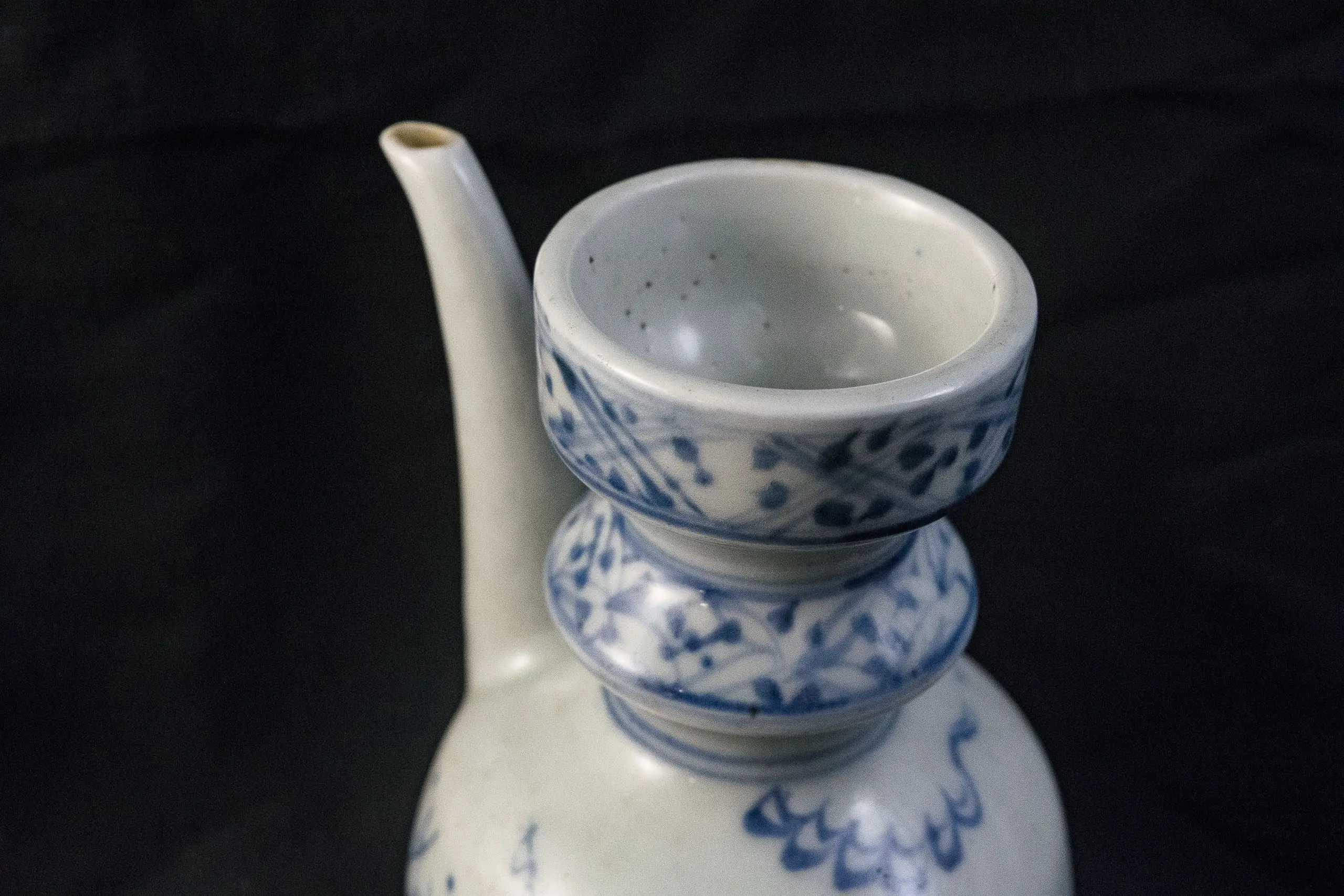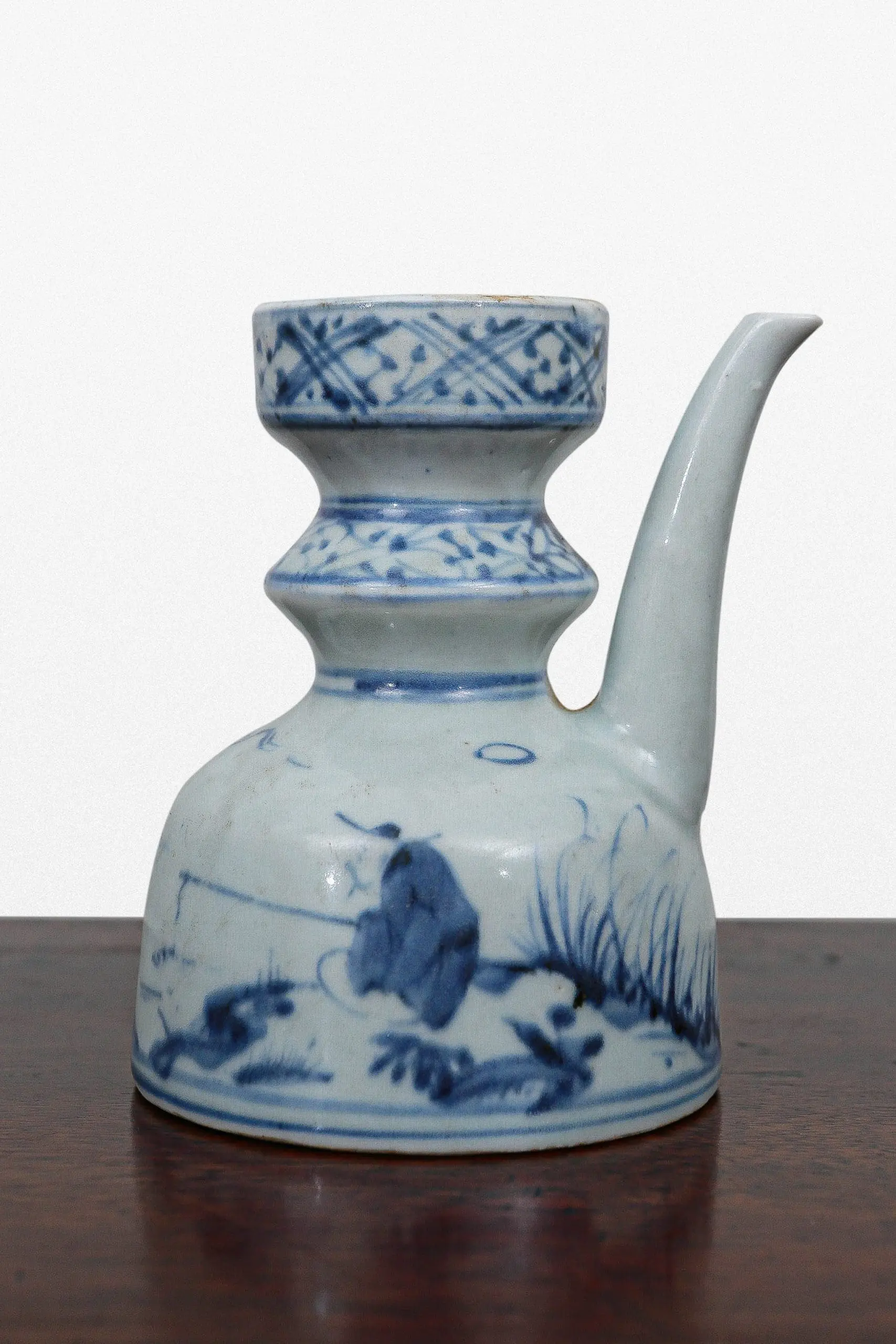 | Description | Ming dynasty porcelain oil jar with bulbous body, tall stepped neck, and elegant pouring spout. Painted in underglaze cobalt blue with a riverside scene showing a lone fisherman casting his line amid rocks and grasses. |