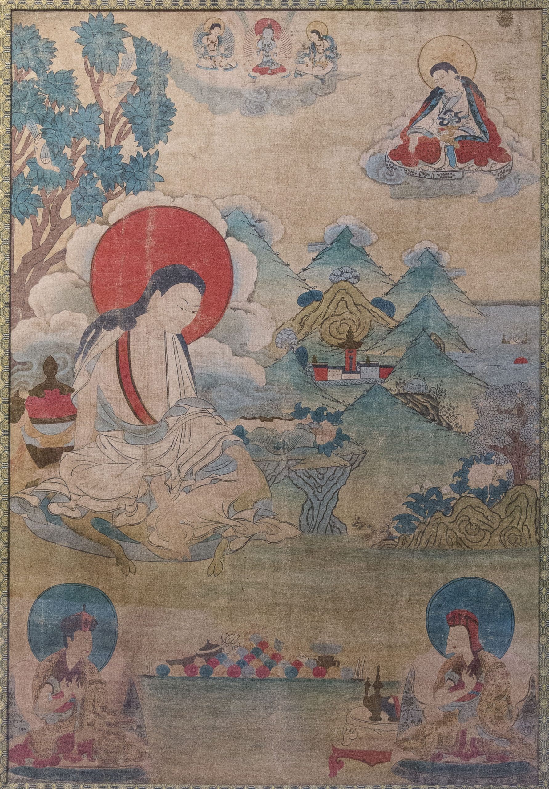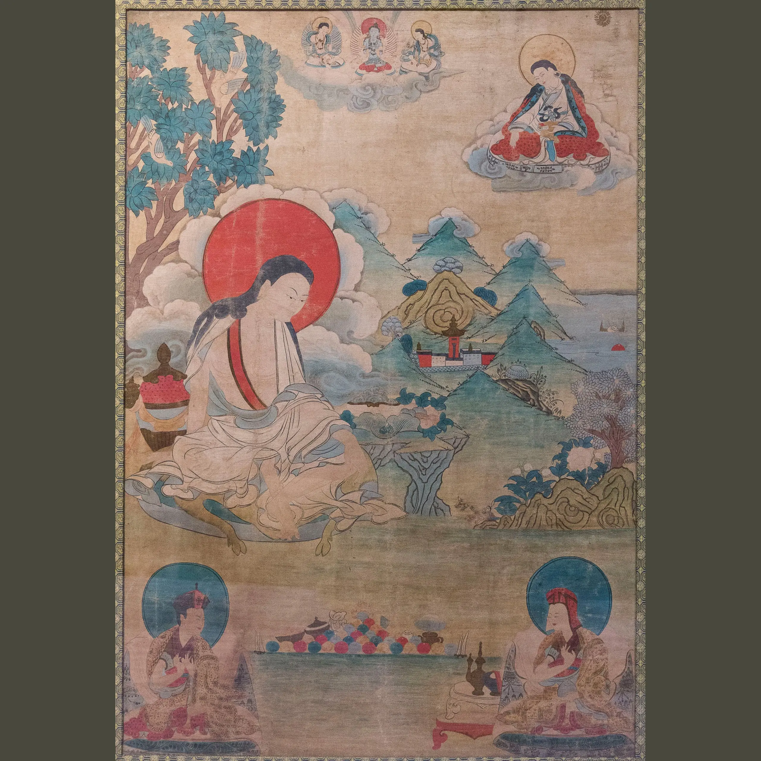This 19th-century Tibetan thangka (89 x 68 x 5 cm) portrays Milarepa meditating in a tranquil mountain setting, surrounded by deities and disciples. Vivid colors and fine detail emphasize themes of devotion and enlightenment, reflecting the spiritual depth and artistic precision of late Himalayan Buddhist painting