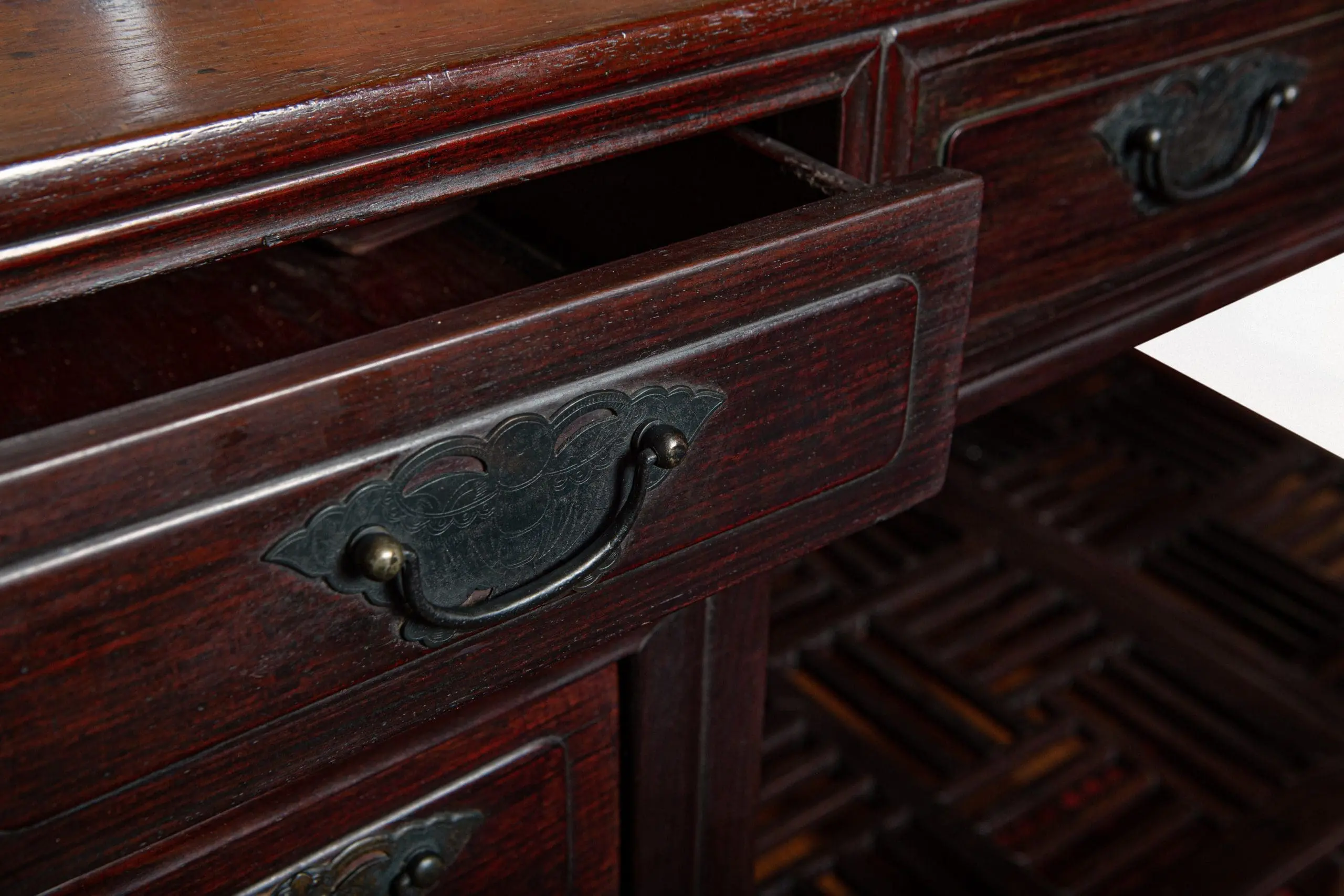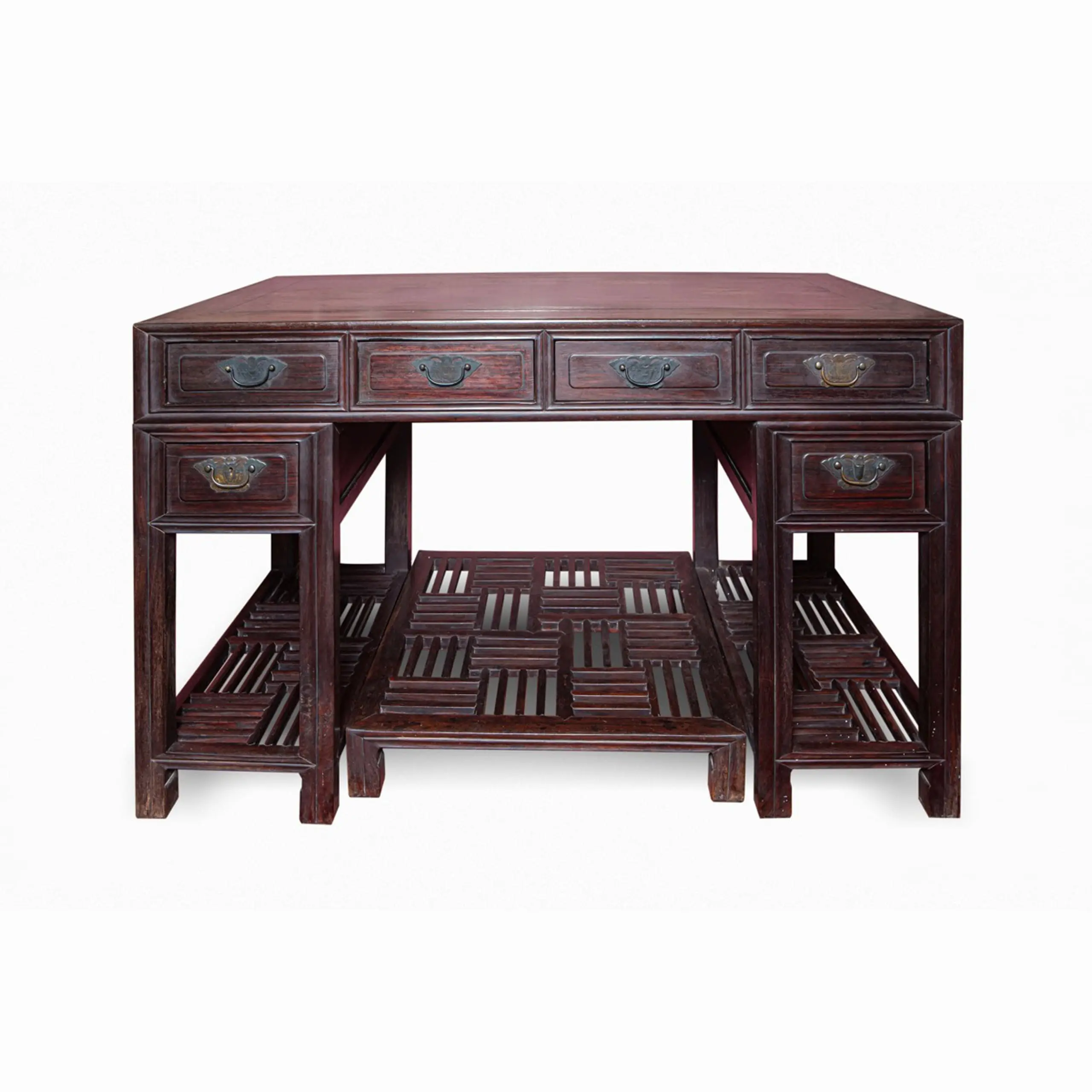 | Description | A two tiered desk, the upper portion consisting of four wide drawers, tiers on either side with a single drawer and lower stretcher, center removable stretcher. |
