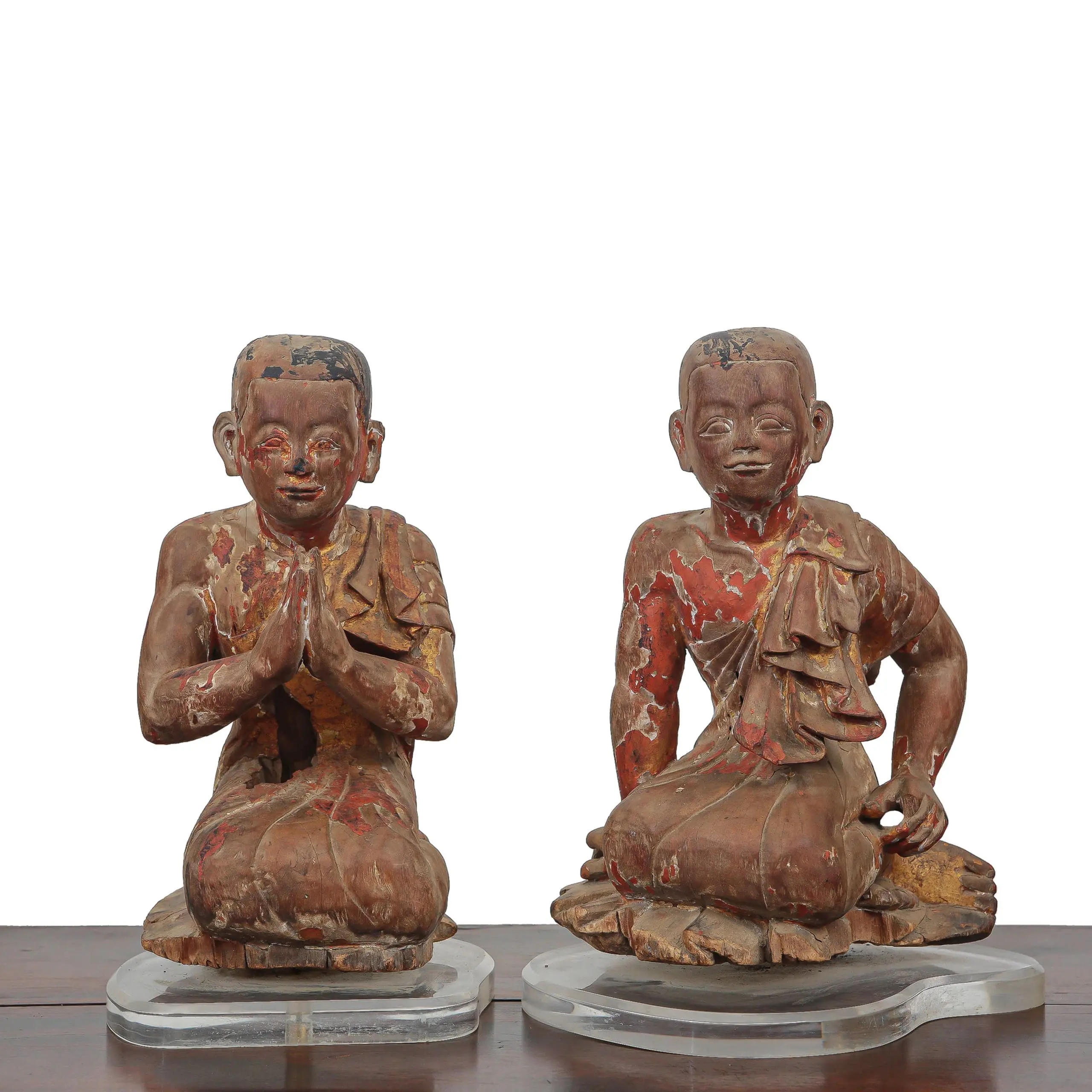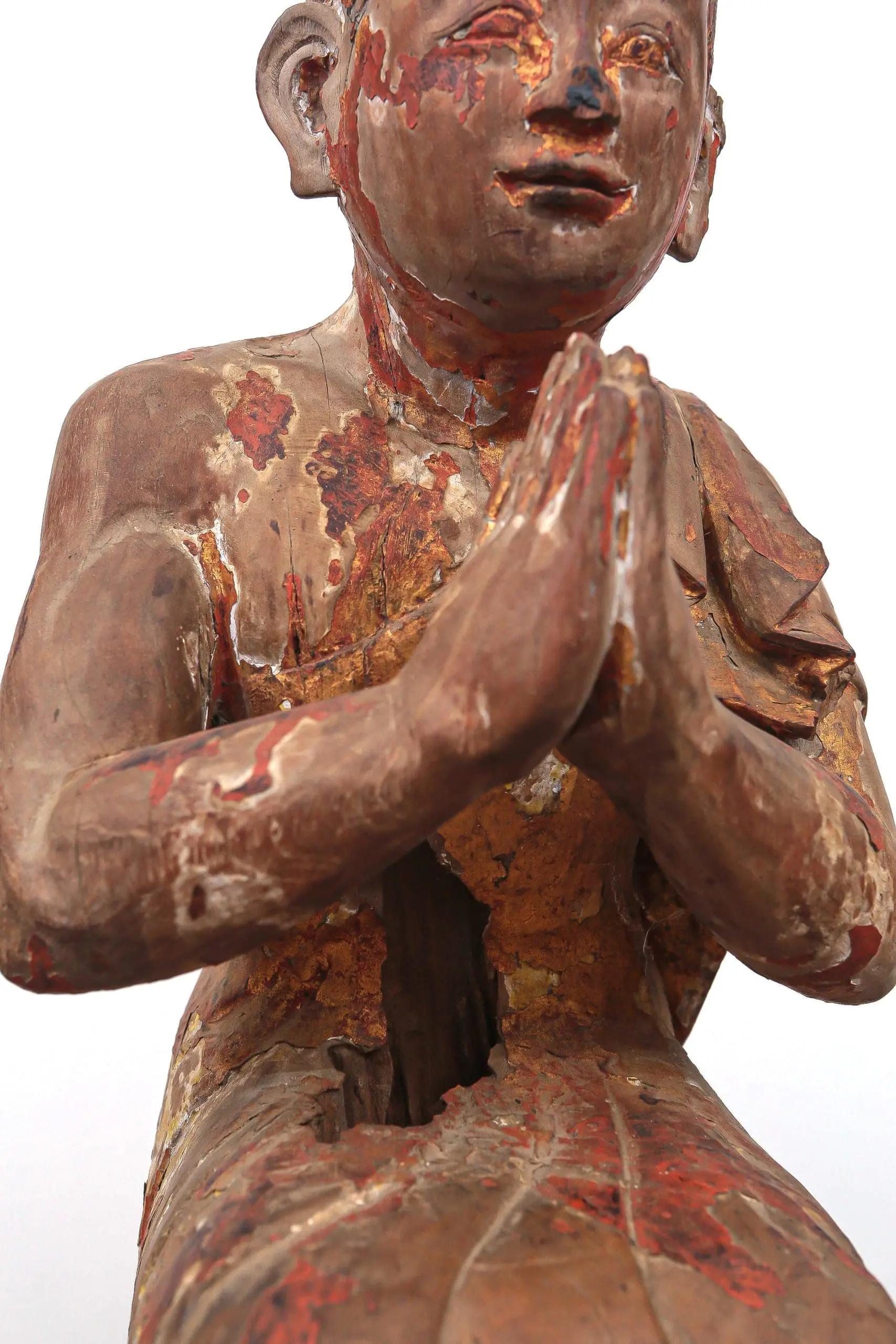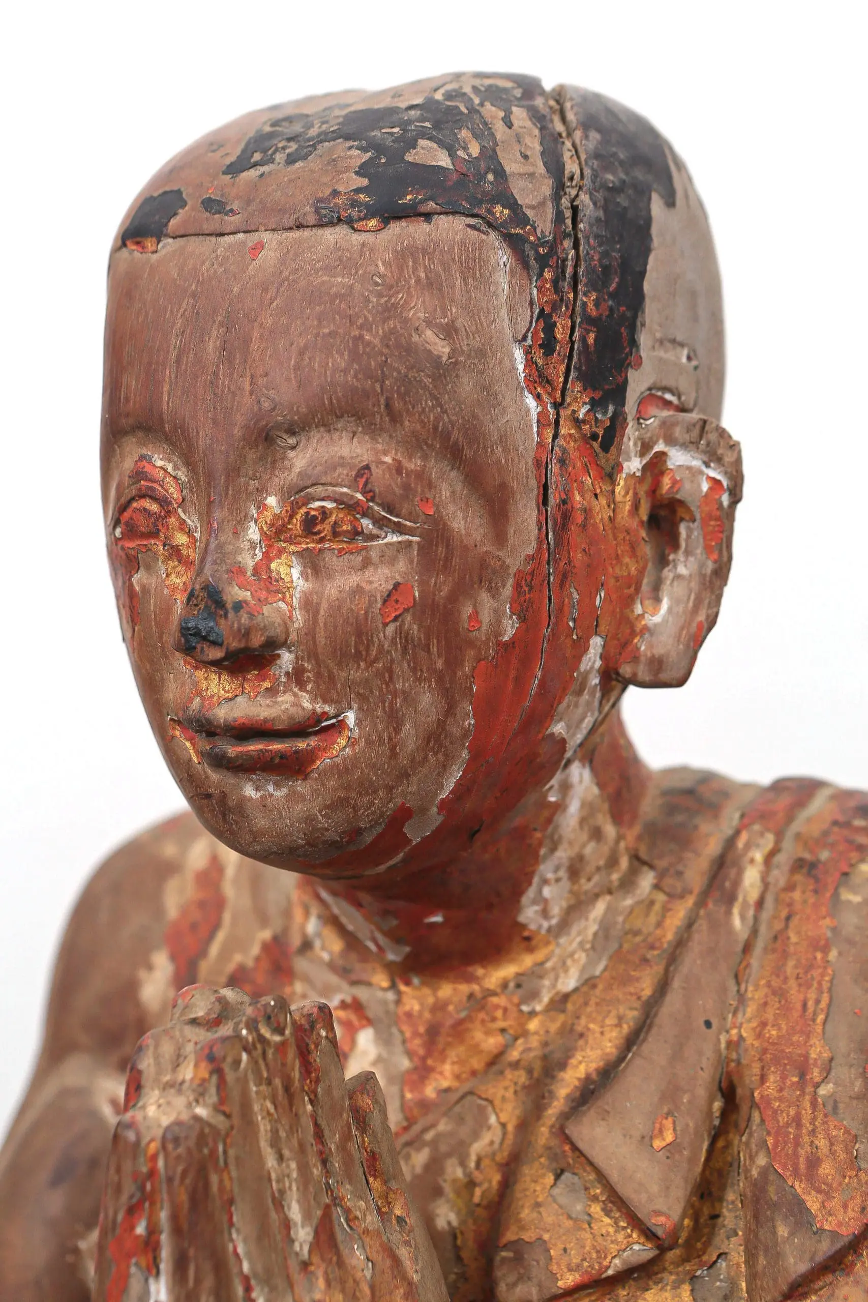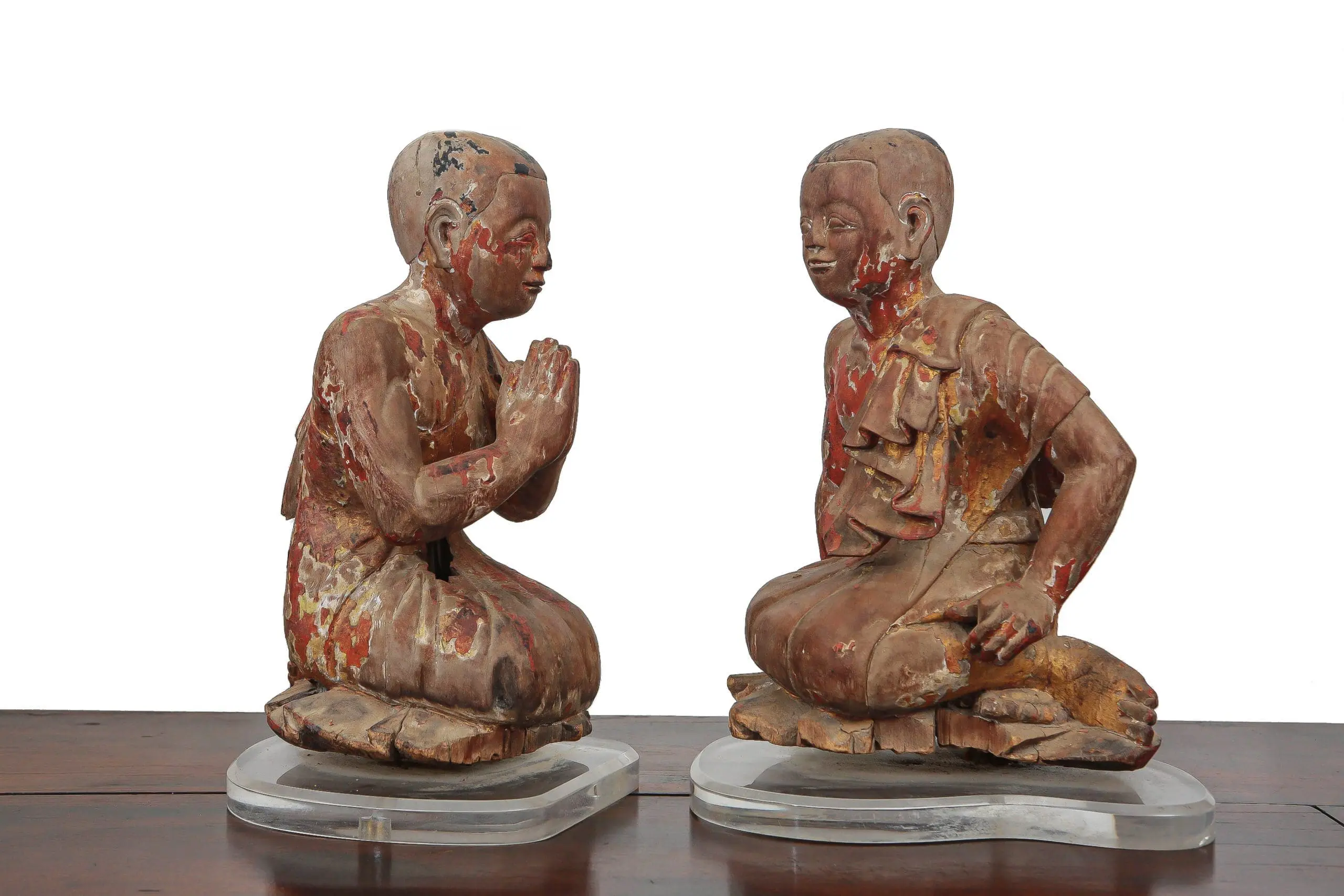 | Description | A charming pair of Mandalay-period teak monks kneeling in devotional attitudes, with traces of their original red lacquer and gilding. Their youthful faces, lotus-pad bases, and softly cascading robes reflect Burmese Buddhist sculpture of the mid–late 1800s. |