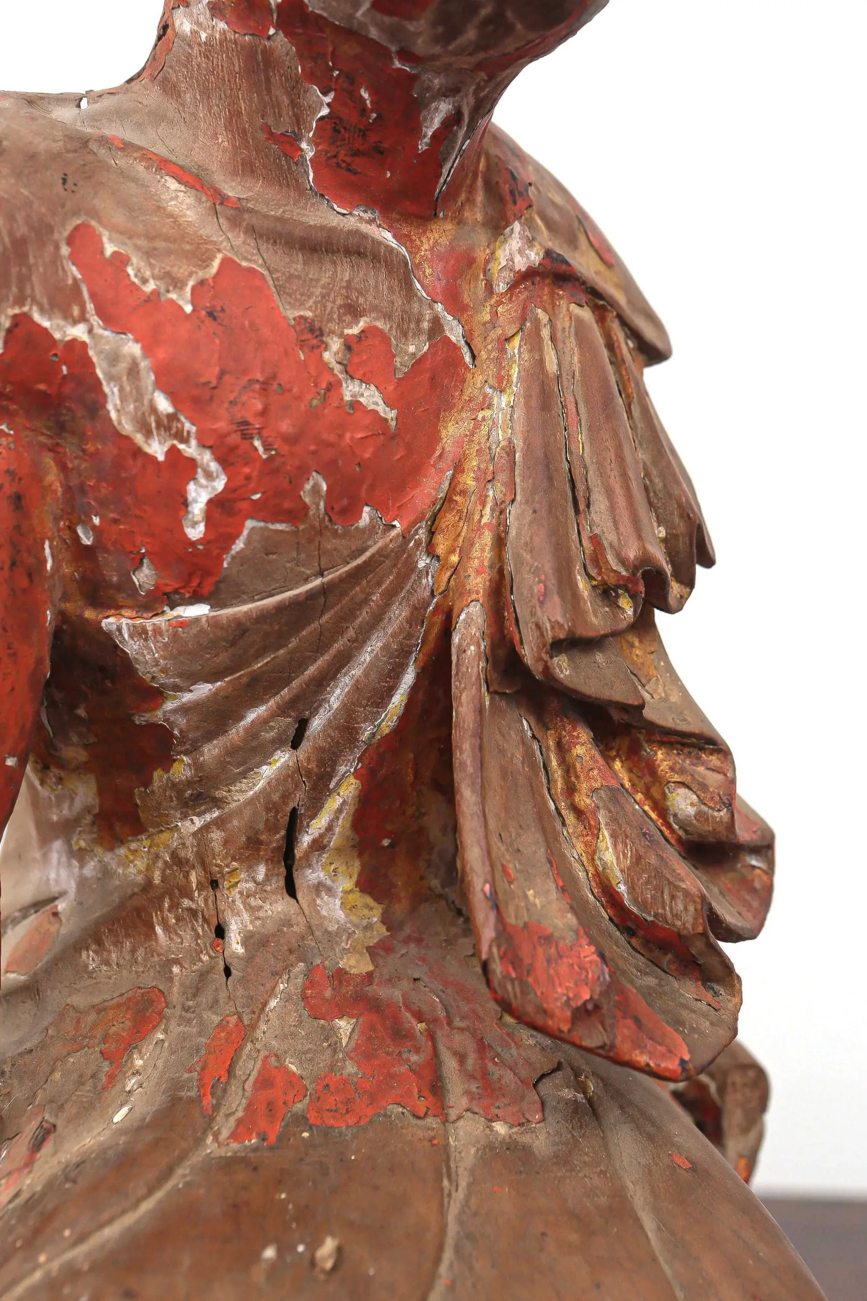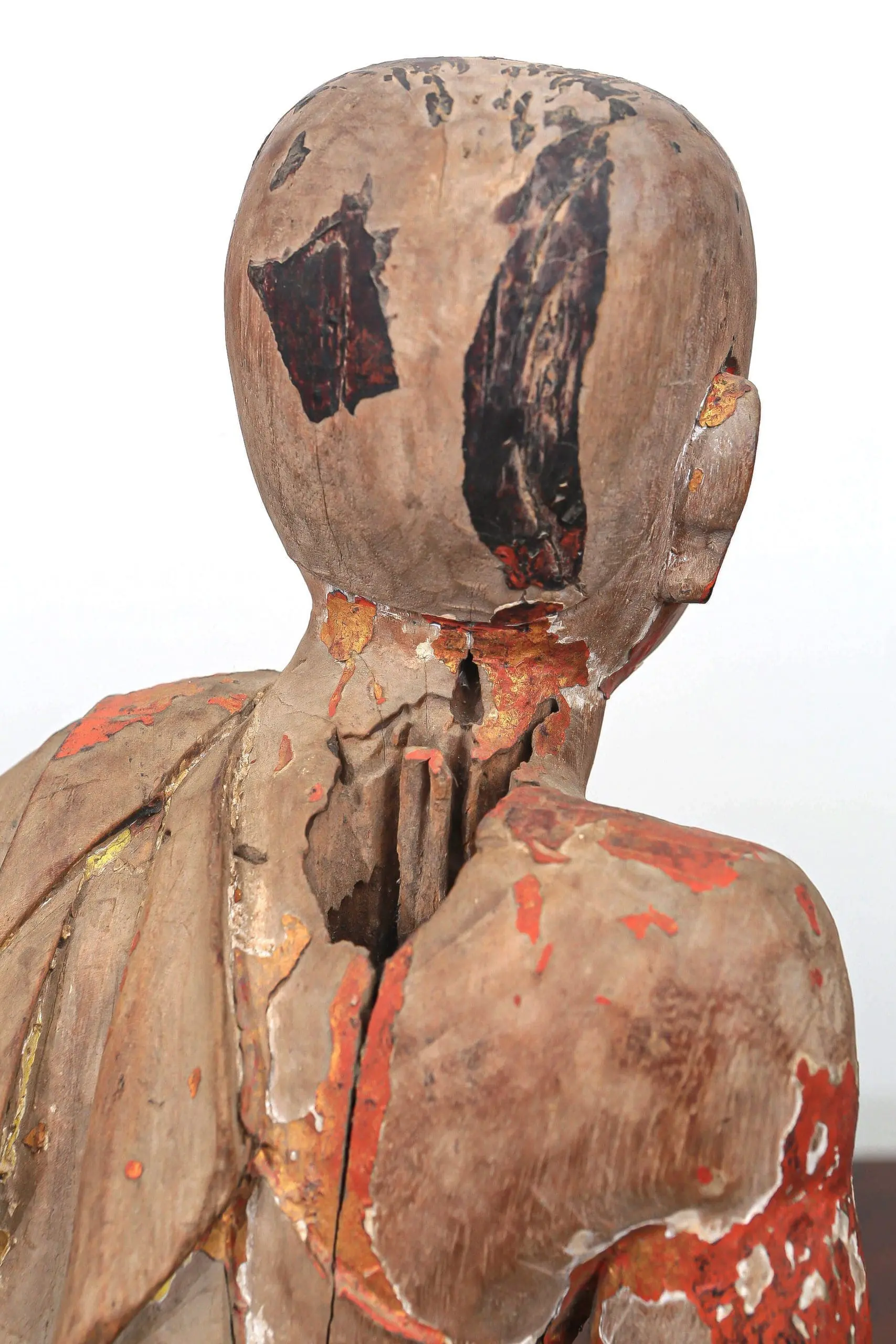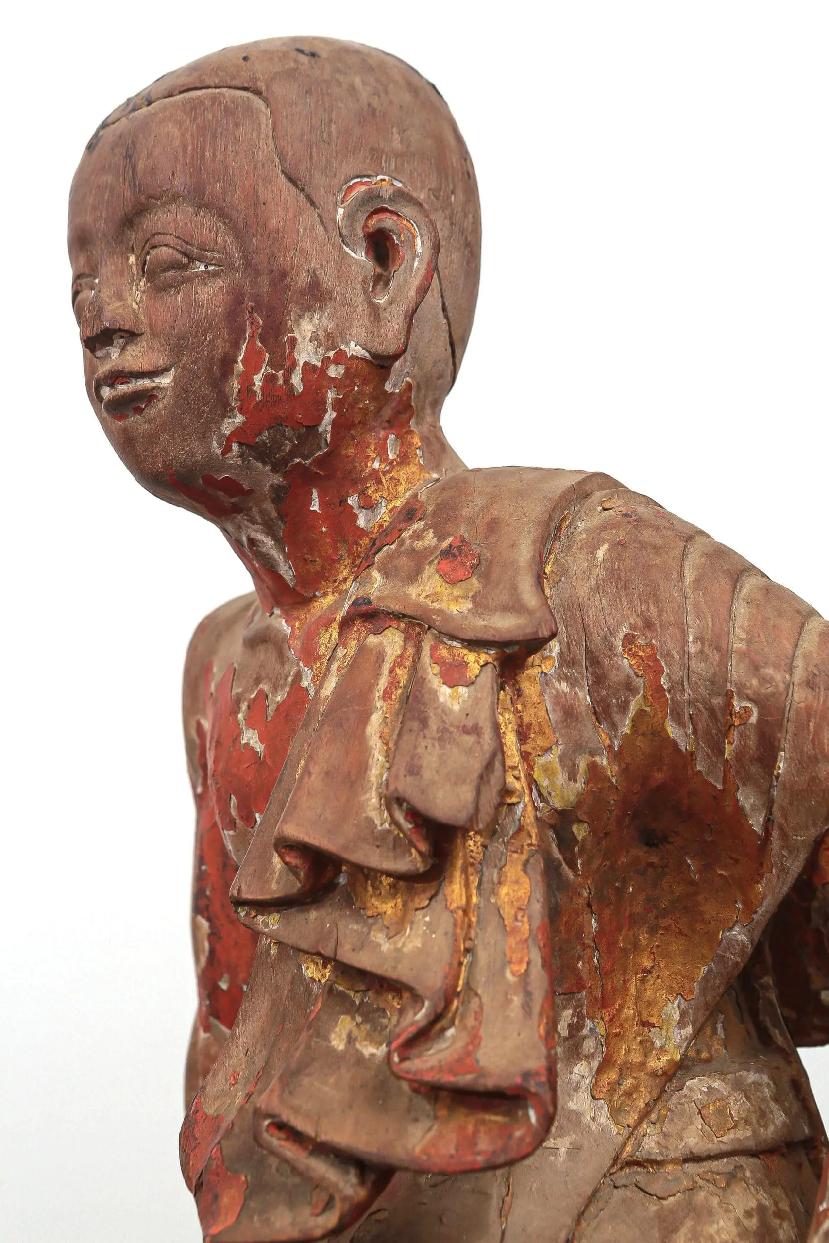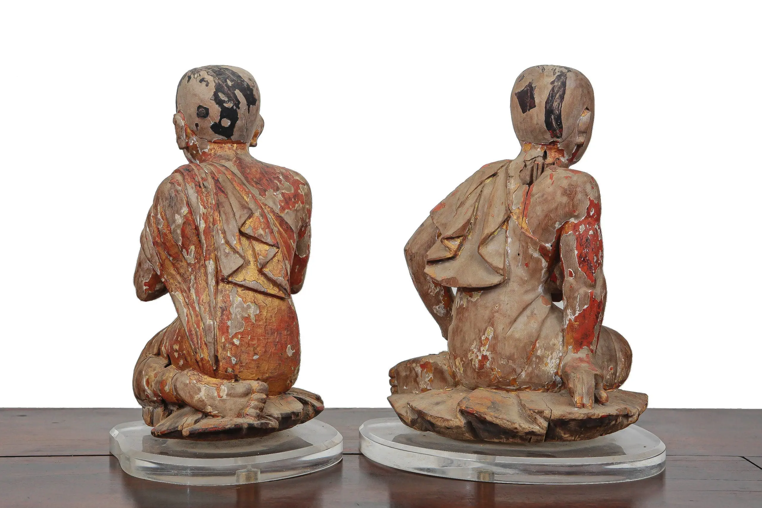 | Description | A charming pair of Mandalay-period teak monks kneeling in devotional attitudes, with traces of their original red lacquer and gilding. Their youthful faces, lotus-pad bases, and softly cascading robes reflect Burmese Buddhist sculpture of the mid–late 1800s. |