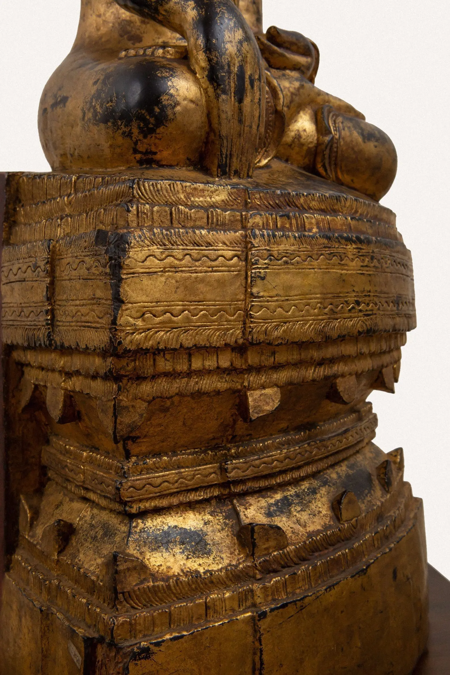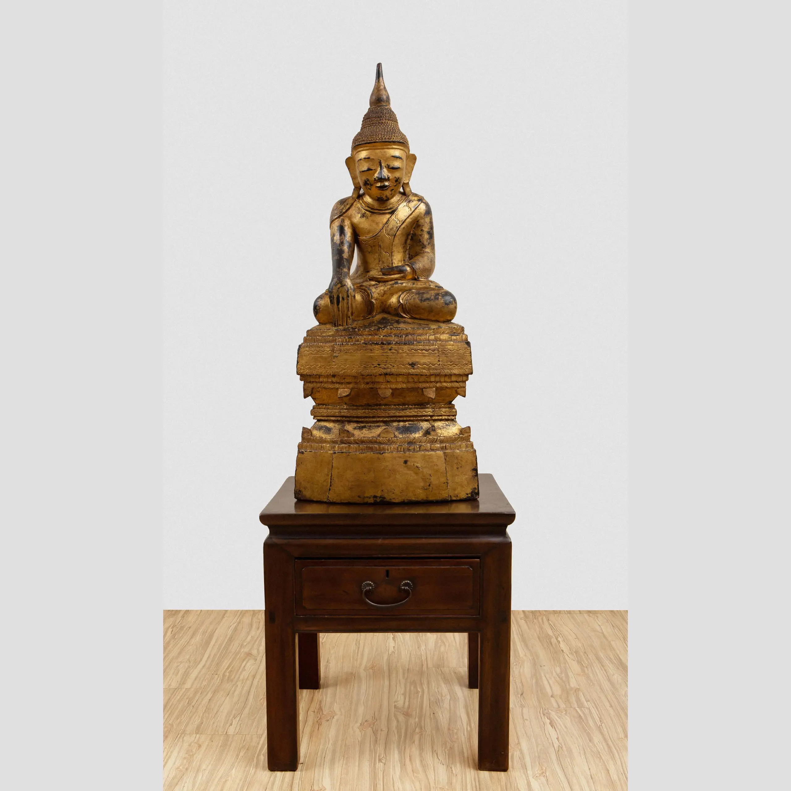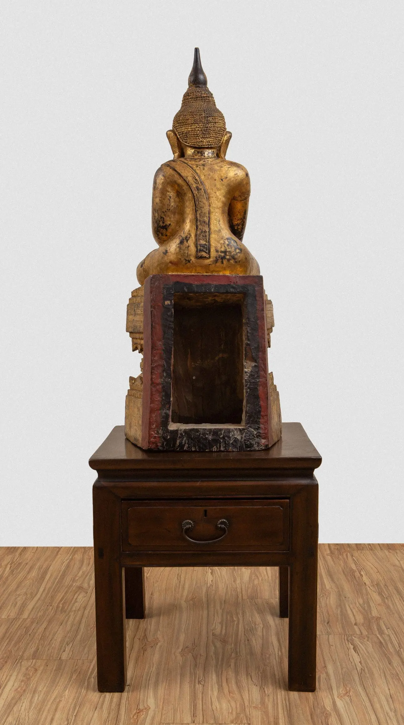 | Description | Large Buddha seated on high throne, with gilding on black lacquer. His hands are in a Subduing Mara Mudra, also know as the "conquering evil " mudra, the "calling the earth to witness" mudra, or the "touch the earth" mudra. |