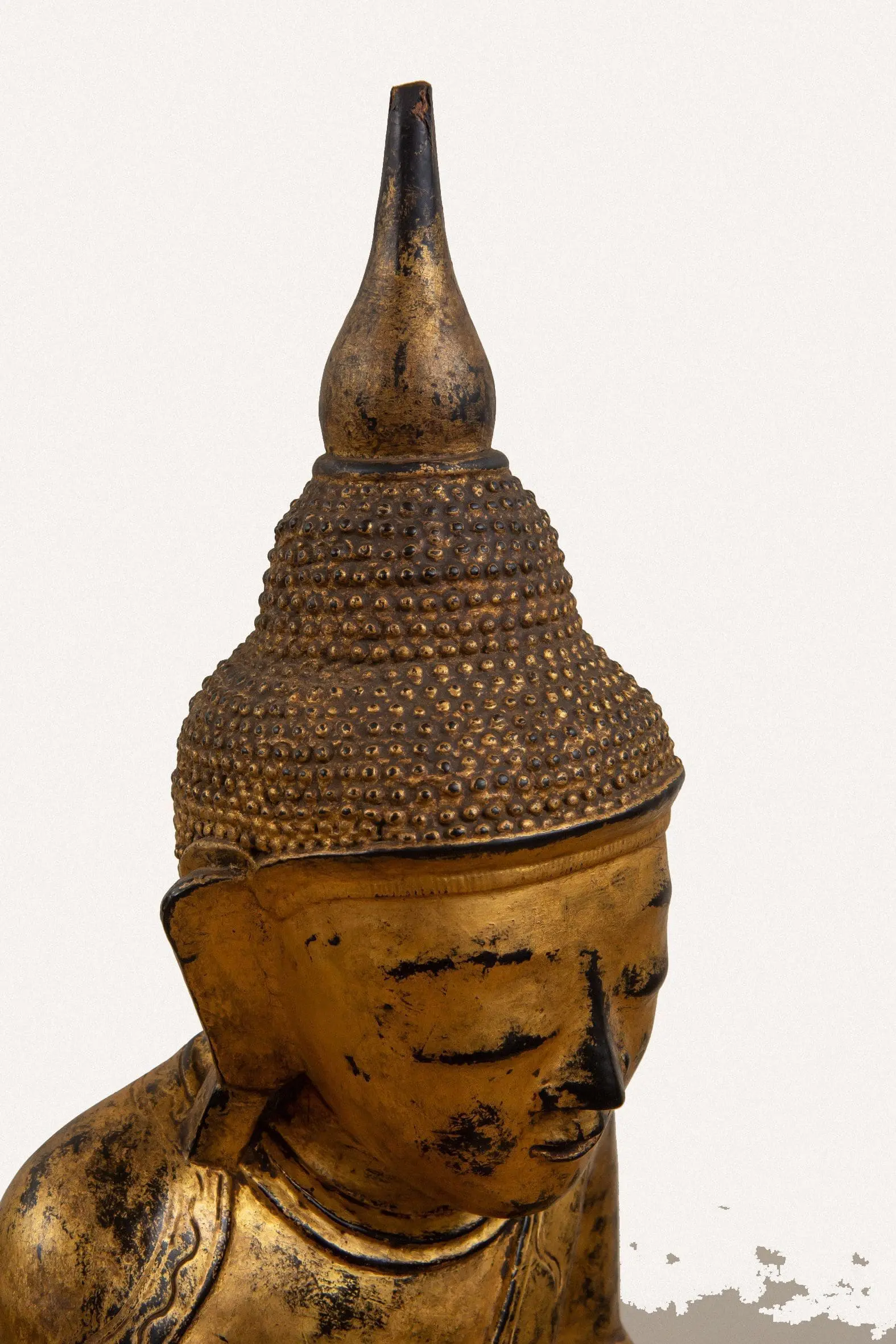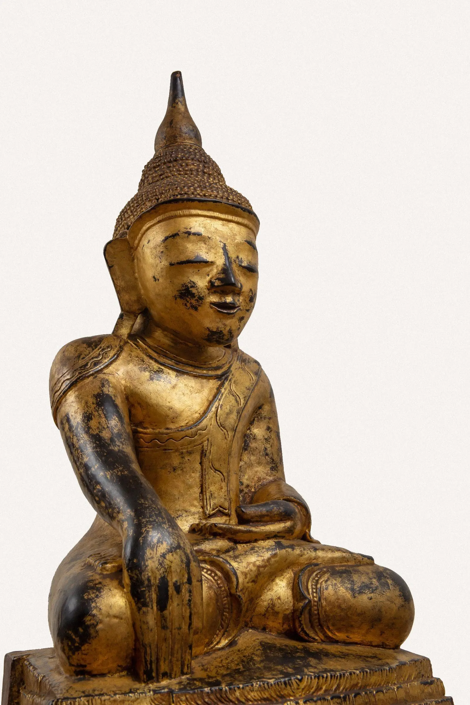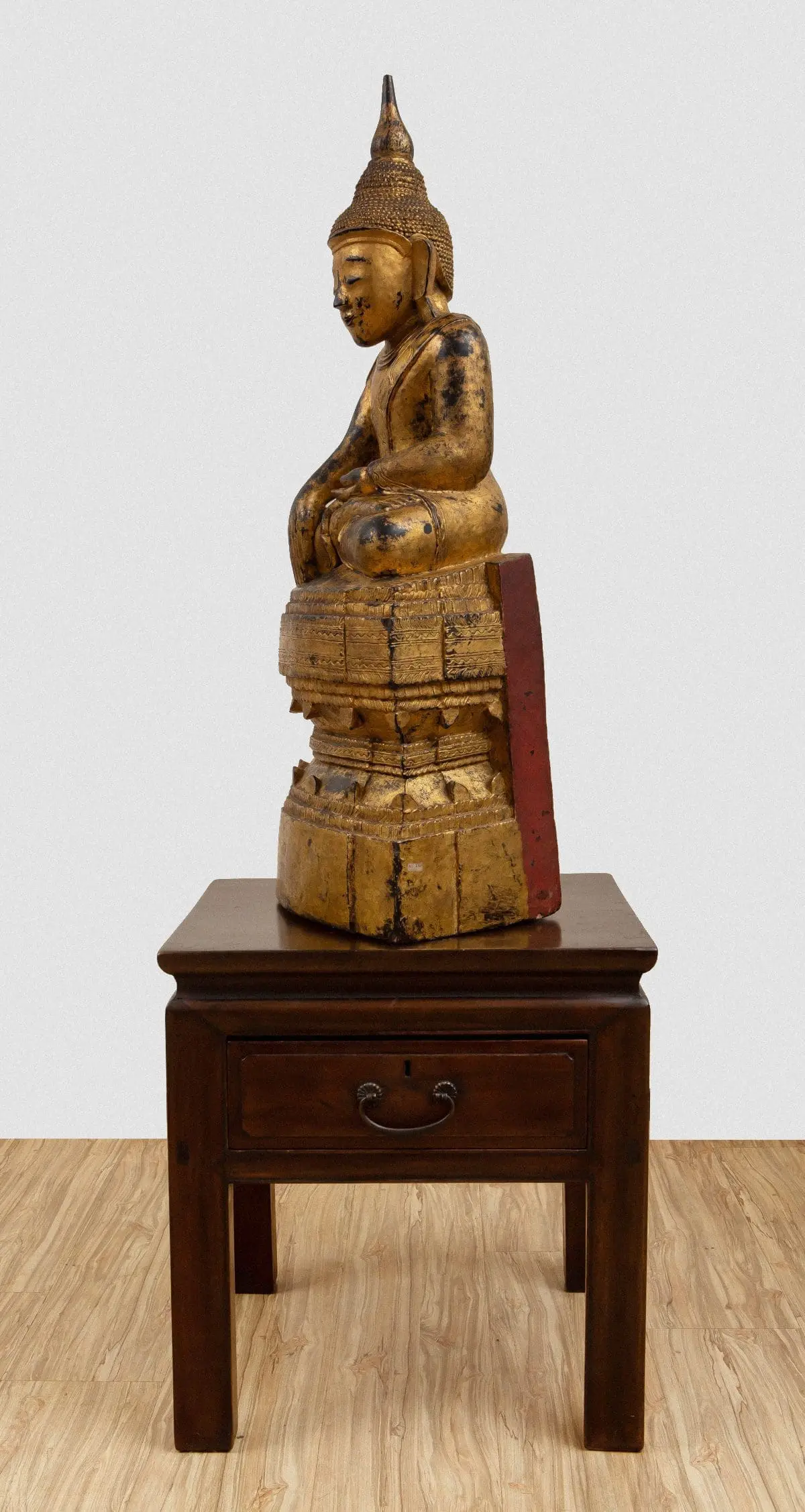 | Description | Large Buddha seated on high throne, with gilding on black lacquer. His hands are in a Subduing Mara Mudra, also know as the "conquering evil " mudra, the "calling the earth to witness" mudra, or the "touch the earth" mudra. |