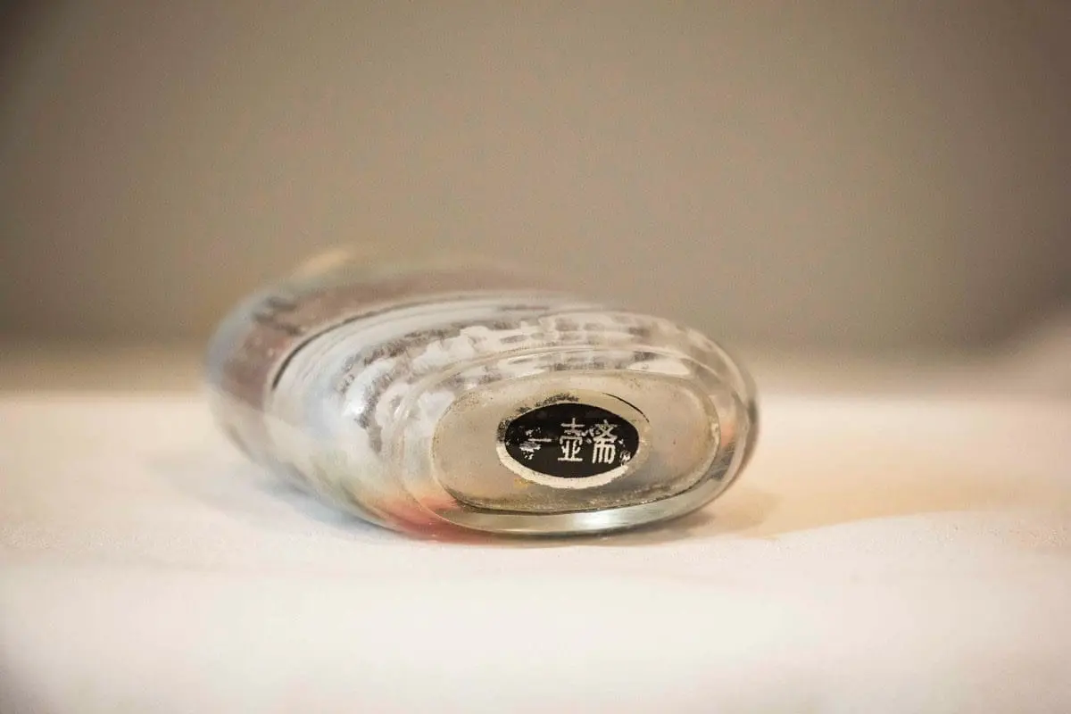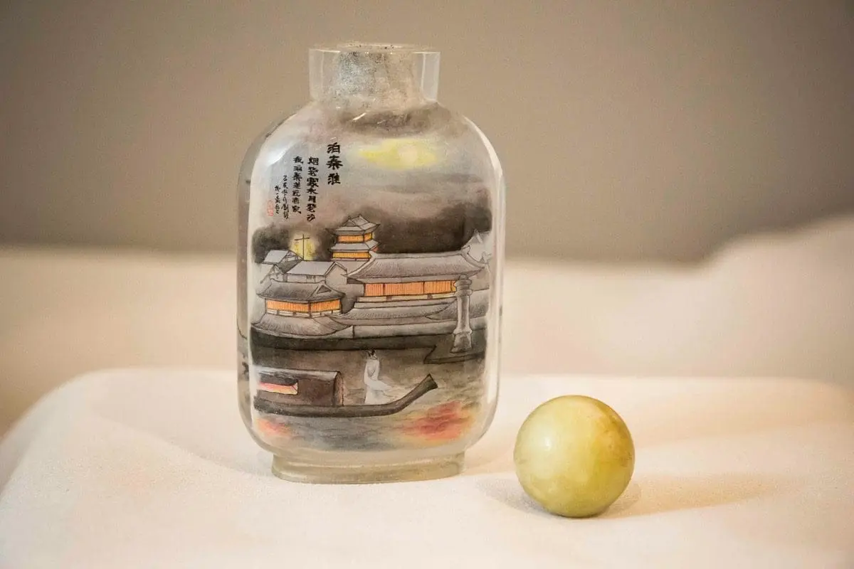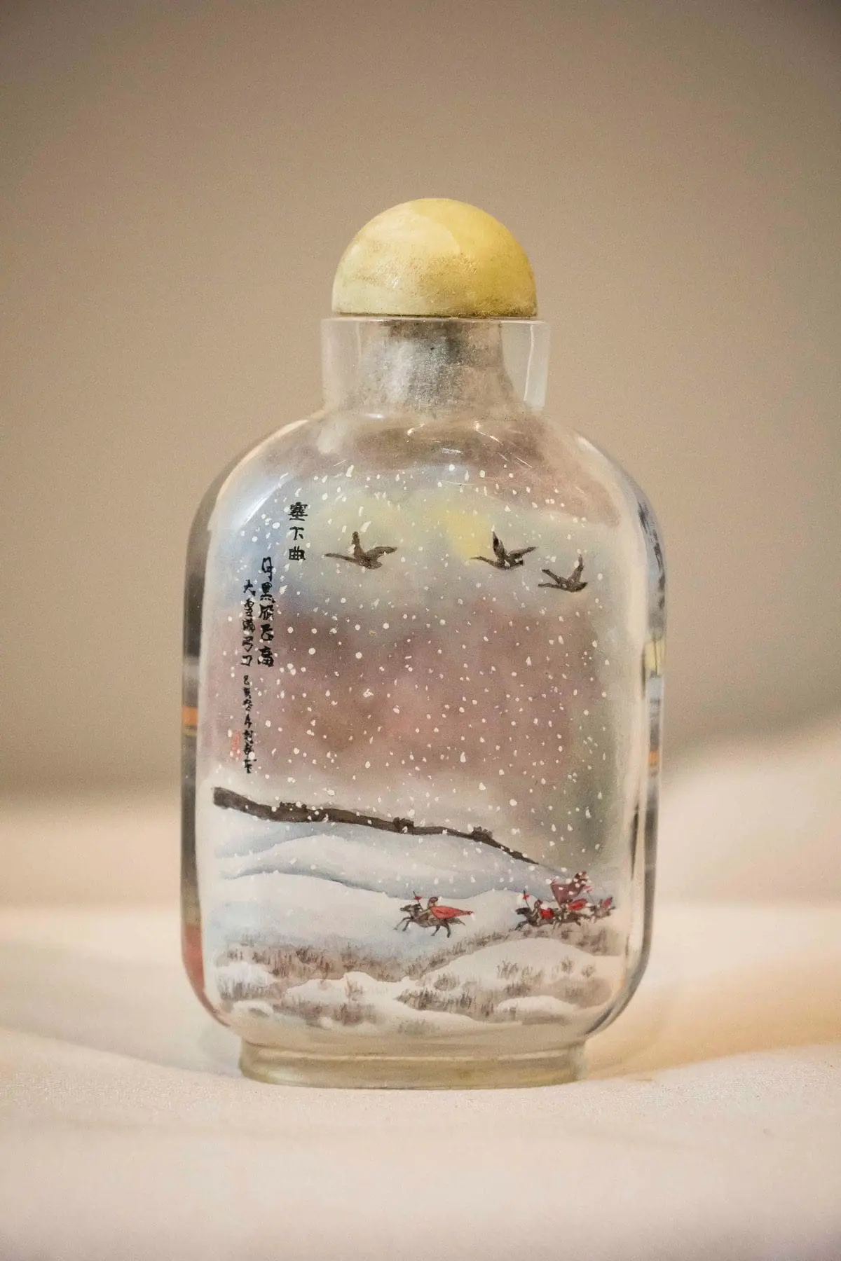 | Description | A glass snuff bottle with interior paintings of horseback riders in the snow on one side, a man in a boat passing by a palace on the other. |