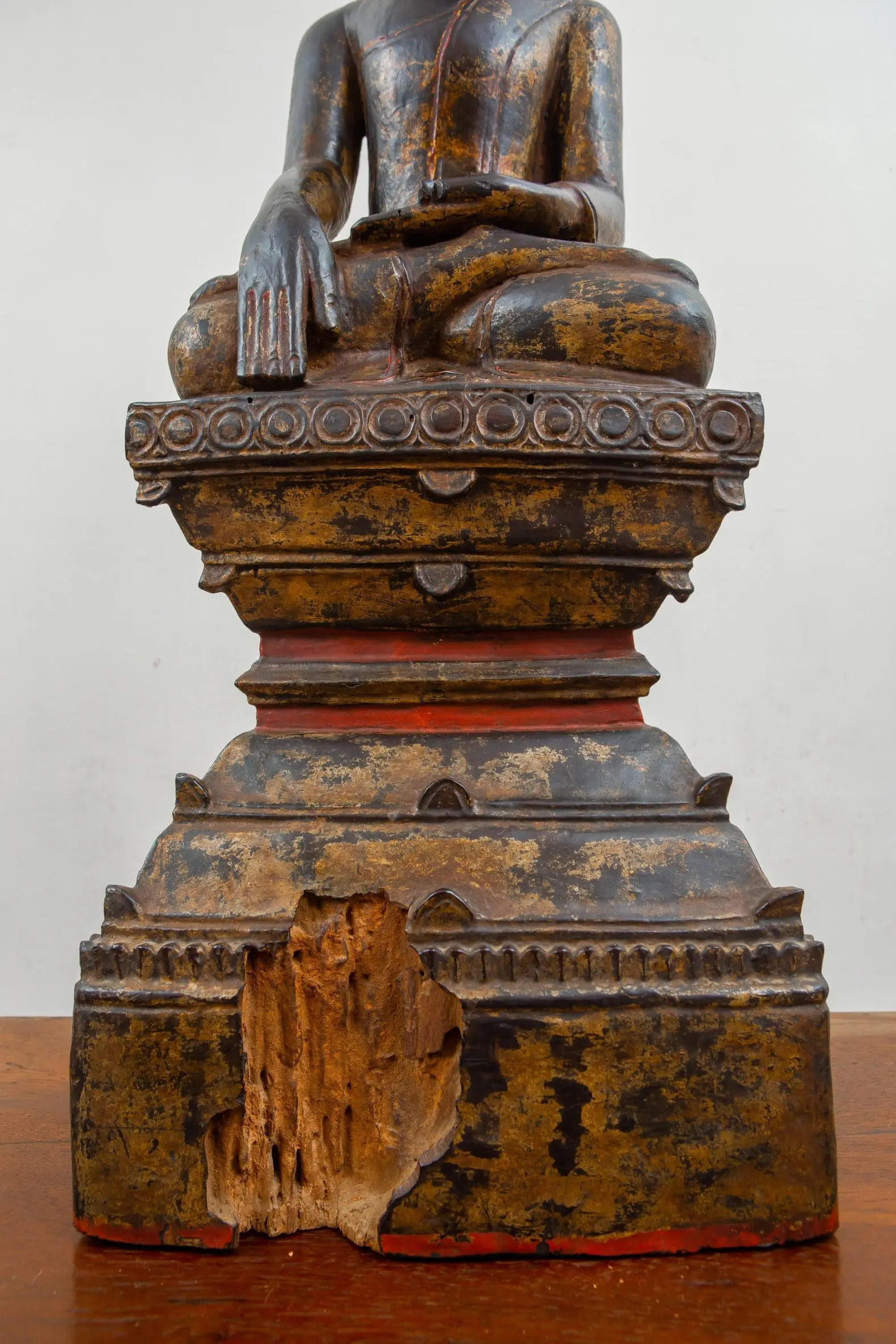 | Description | A large gilded seated crown Buddha on high step throne, his hands in a Subduing Mara Mudra, also known as the "conquering evil " mudra, the "calling he earth to witness" mudra, or the "touch the earth" mudra.. |