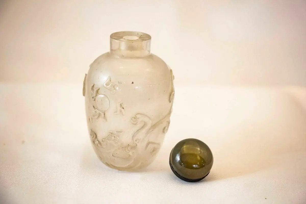 | Description | Quartz snuff bottle with a repousse carving of dragons chasing a pearl. Silver band around the neck and a silver and agate stopper. |