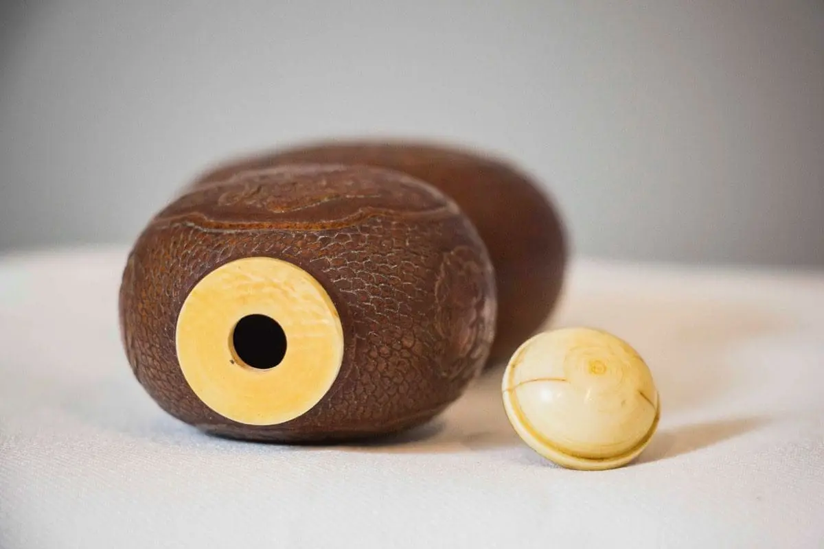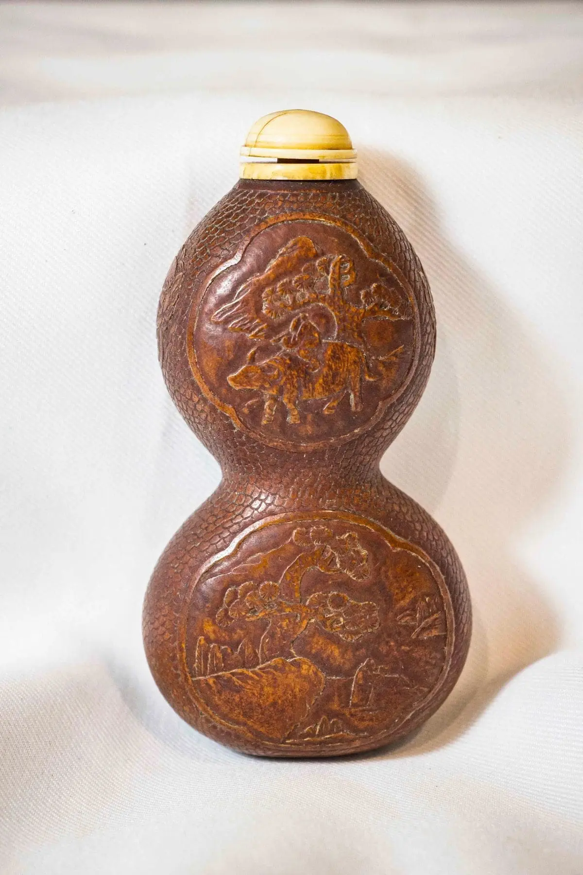 | Description | A gourd snuff bottle with carved medallions of riders and animals, forest scenes, men at work, on the front and back, fou dogs and snake skin designs on the sides, ivory stopper. |
