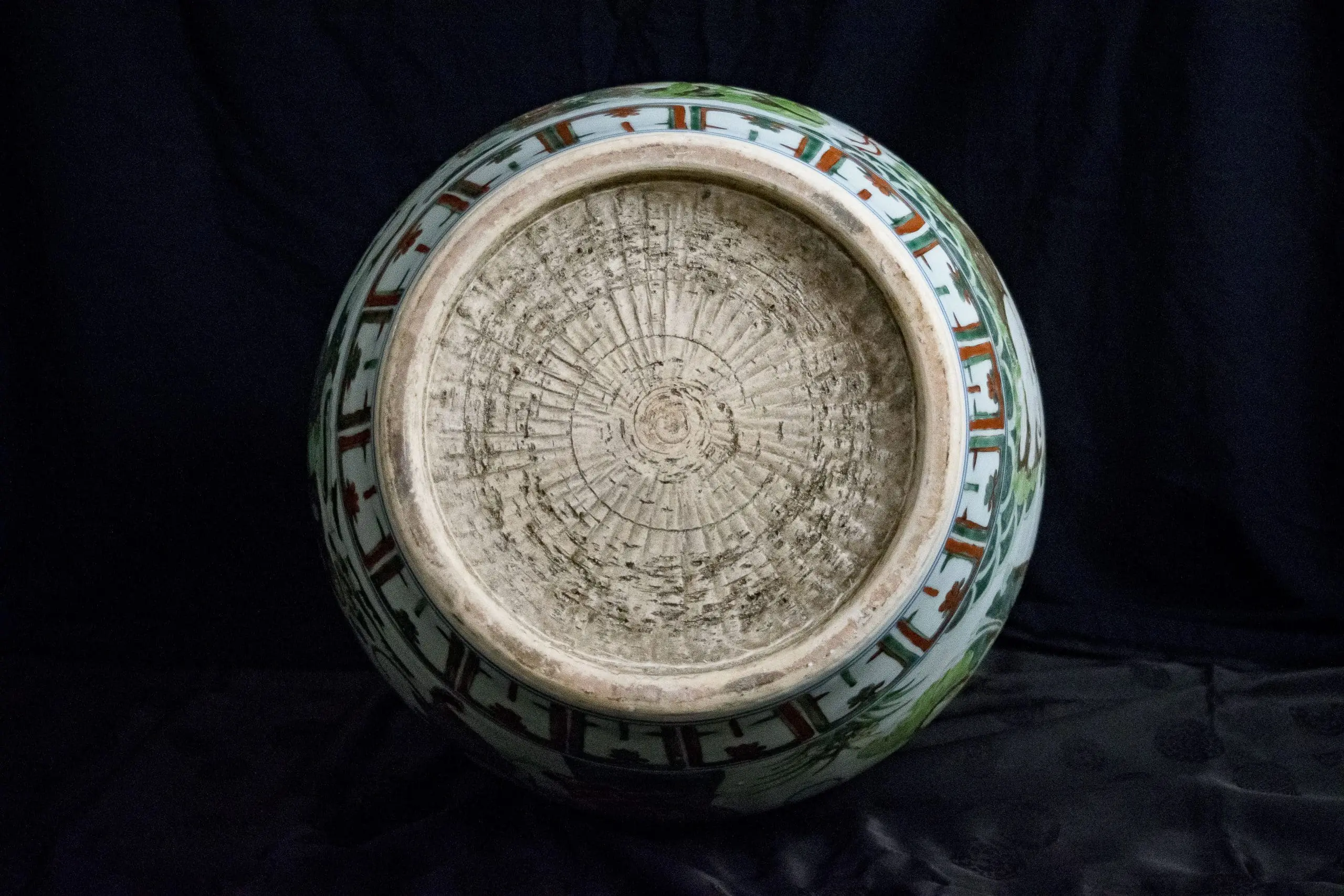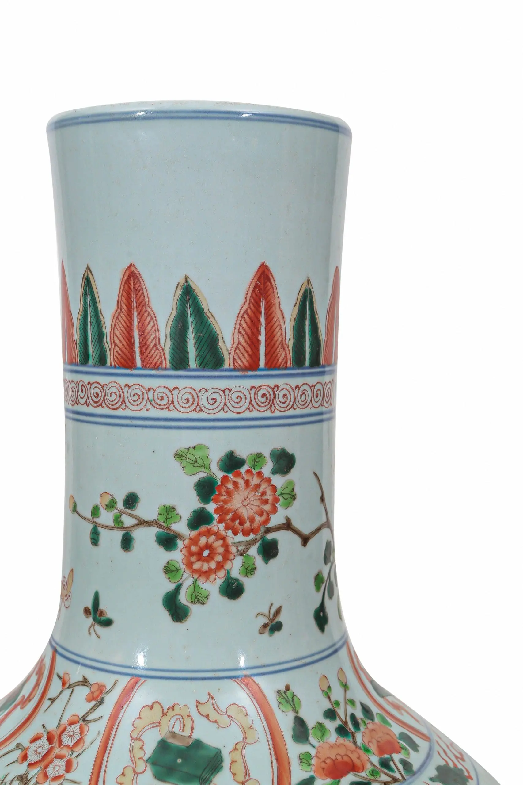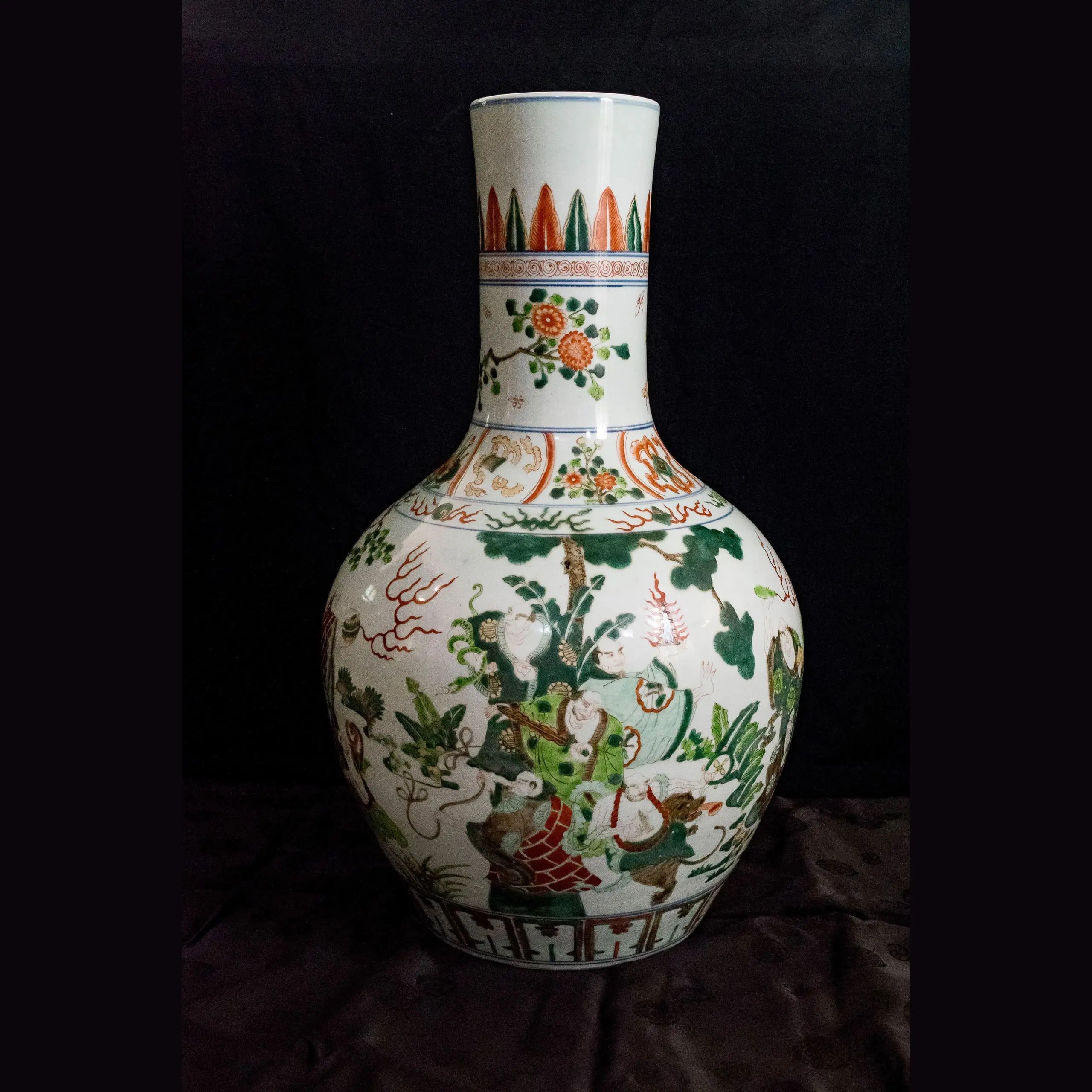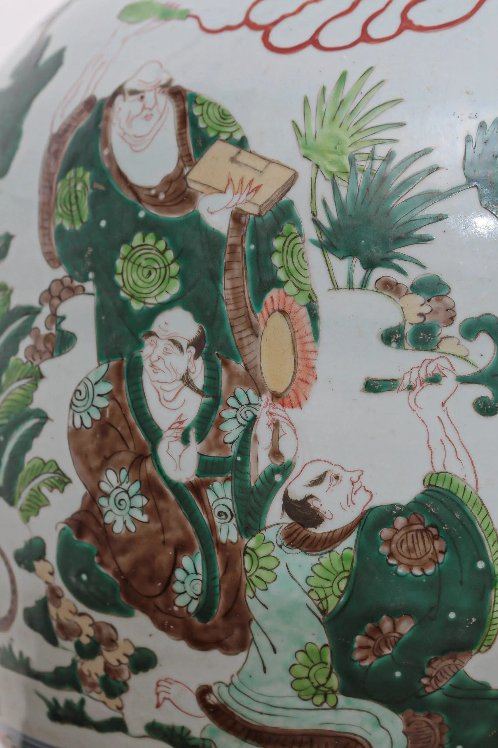 | Description | A large famille verte ball vase, mid Qing period, finely enameled with 18 LOHAN's in a landscape setting beneath blossoming trees, bordered with floral and geometric panels at the shoulder and neck. The vivid palette of iron-red, green, and yellow enamels highlights its refined decorative elegance and balance. |