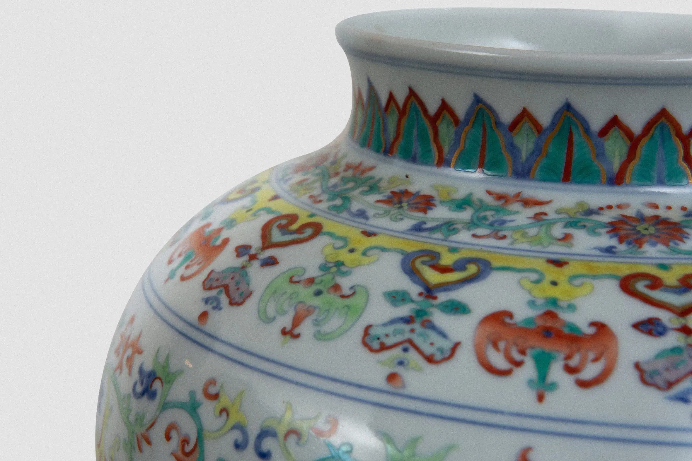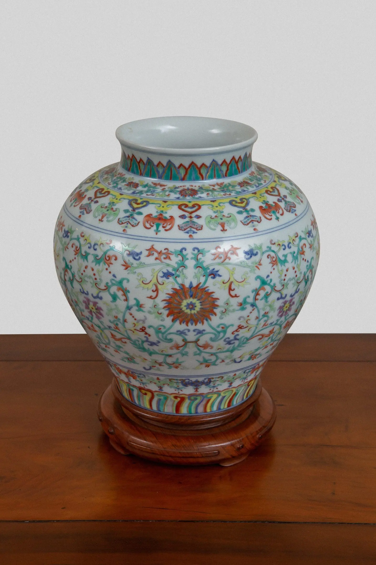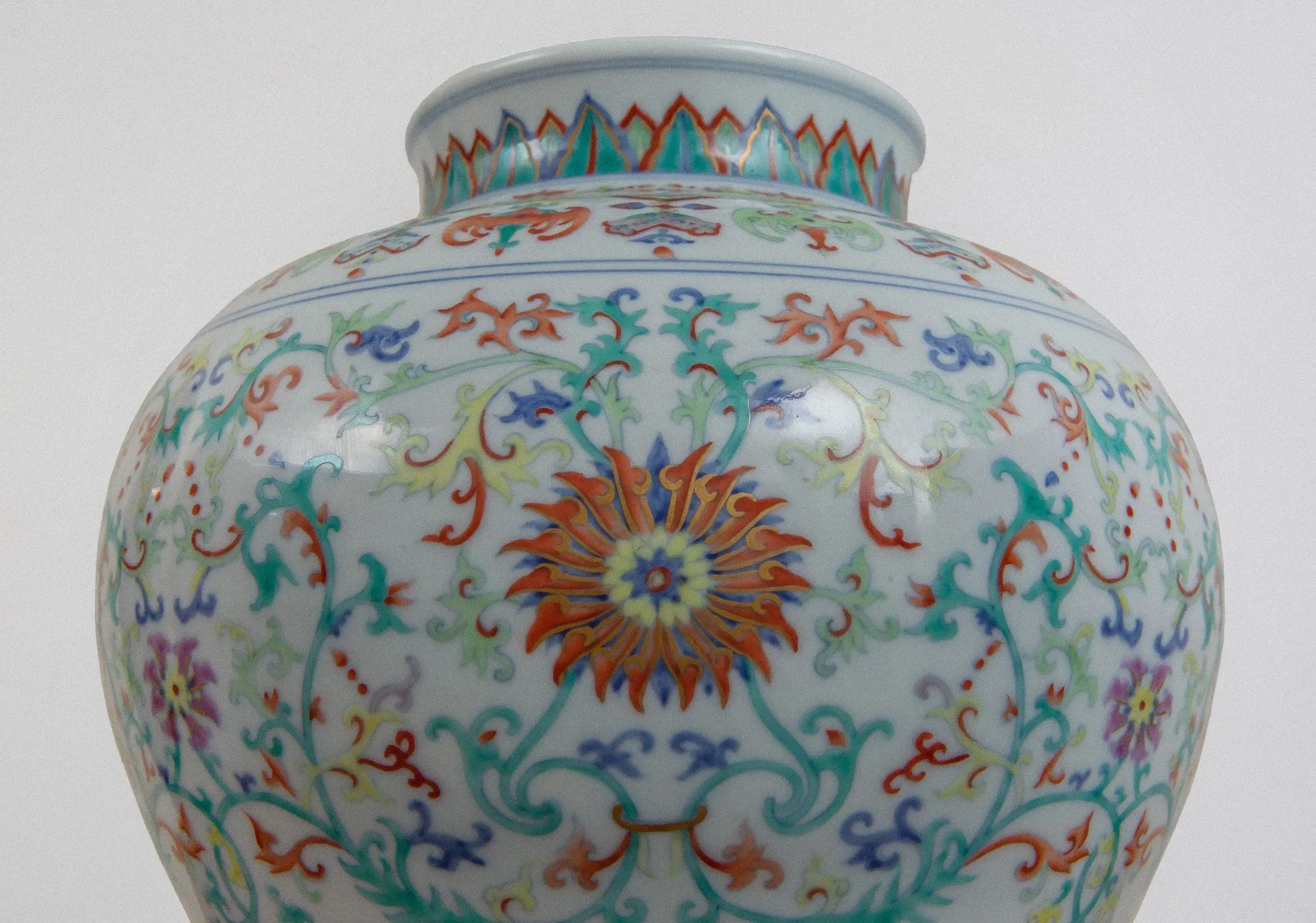 | Description | Large tou t'sai jarlet. An unusual, large jarlet with globular body, straight lip, and tou t'sai paintings of chrysanthemums among vines on the sides, banana leaf design on the neck, colorful abstract design on the neck, colorful abstract design at the base. |