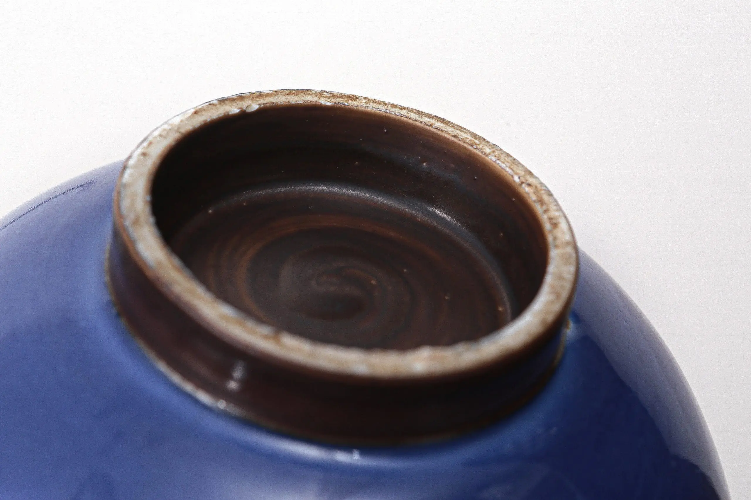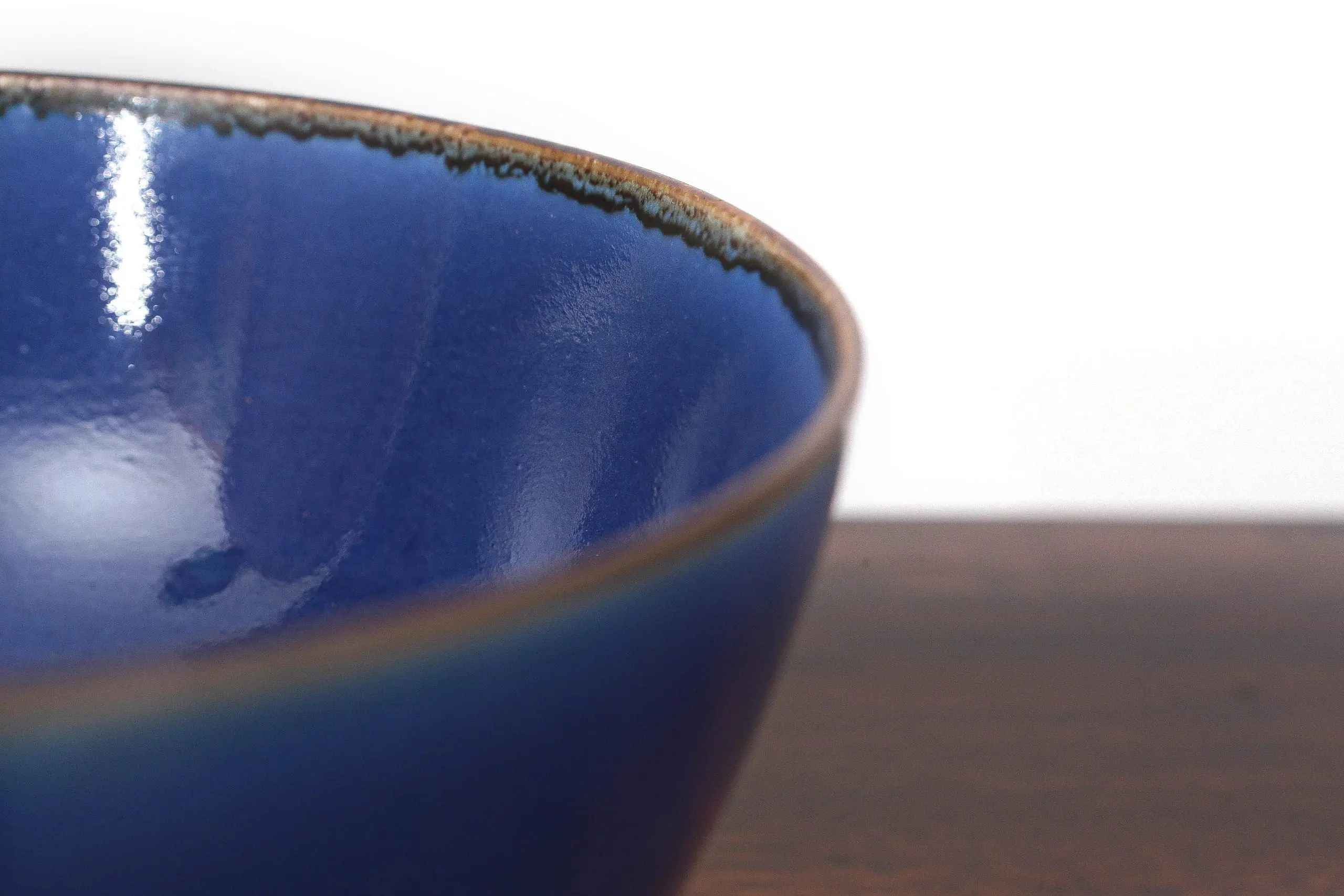 | Description | Large monochrome blue porcelain bowl, its wide mouth tapering gracefully to a narrow base. The vessel rests on a tall foot glazed in contrasting brown. |