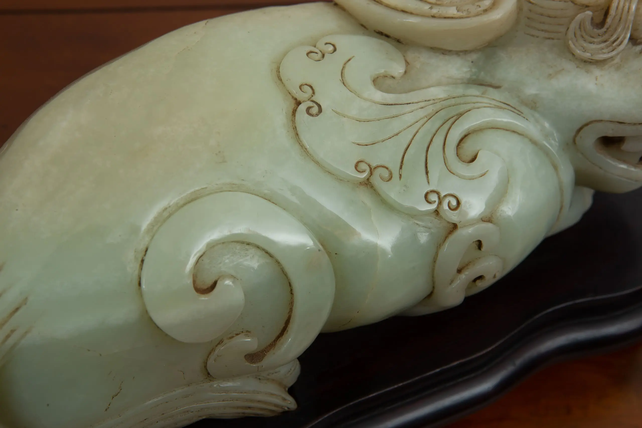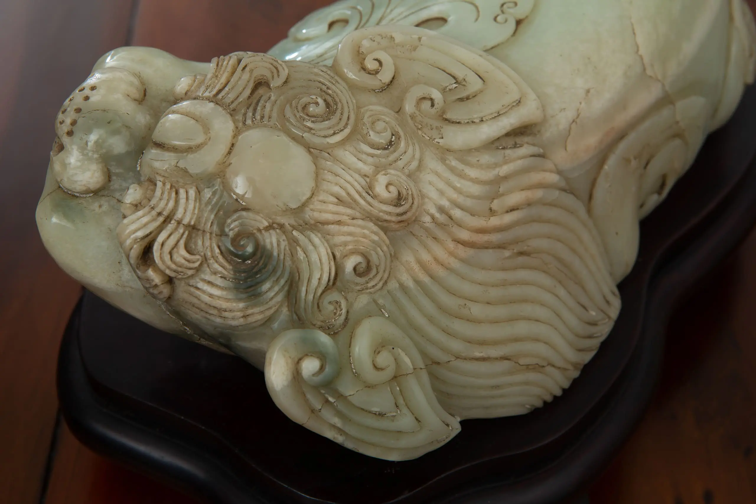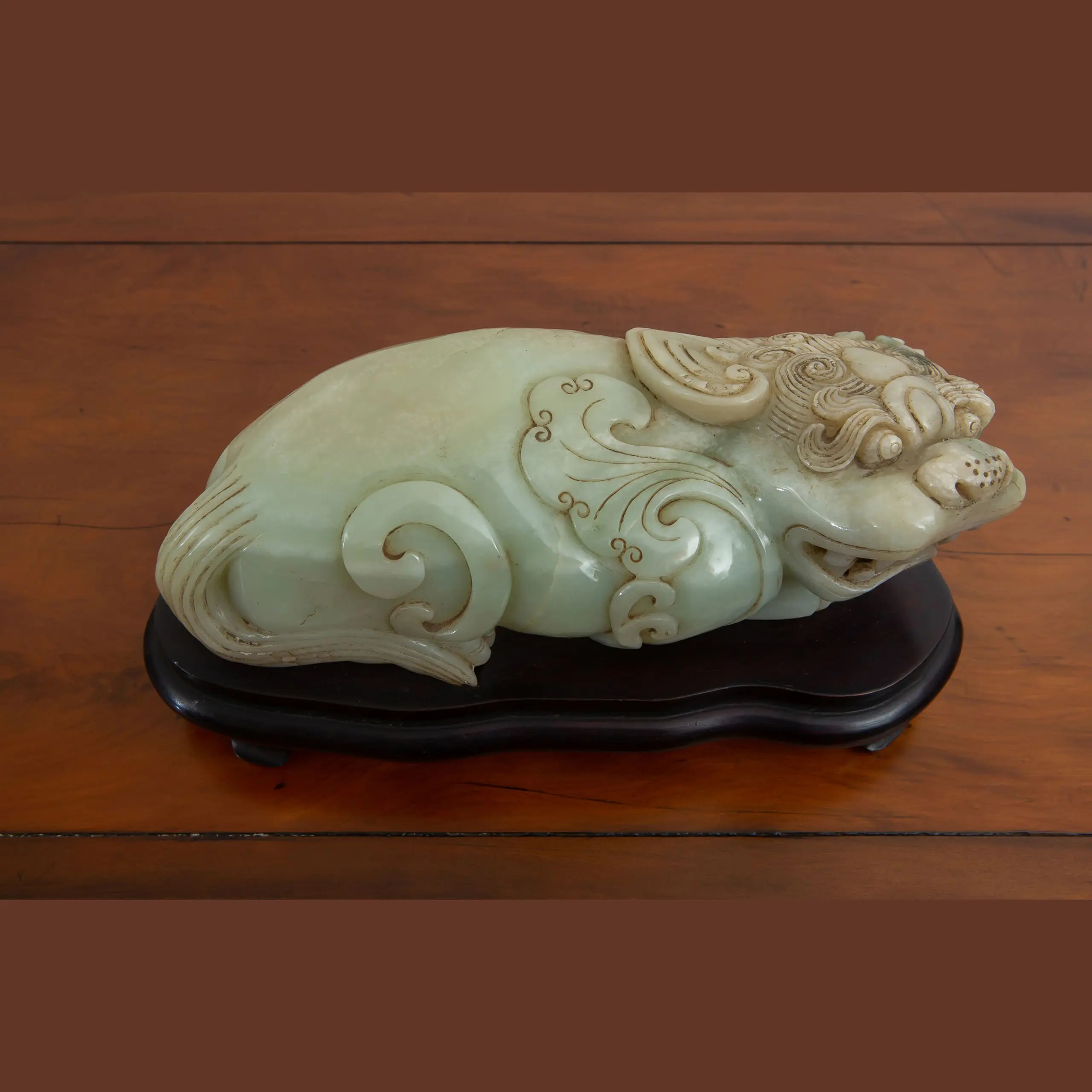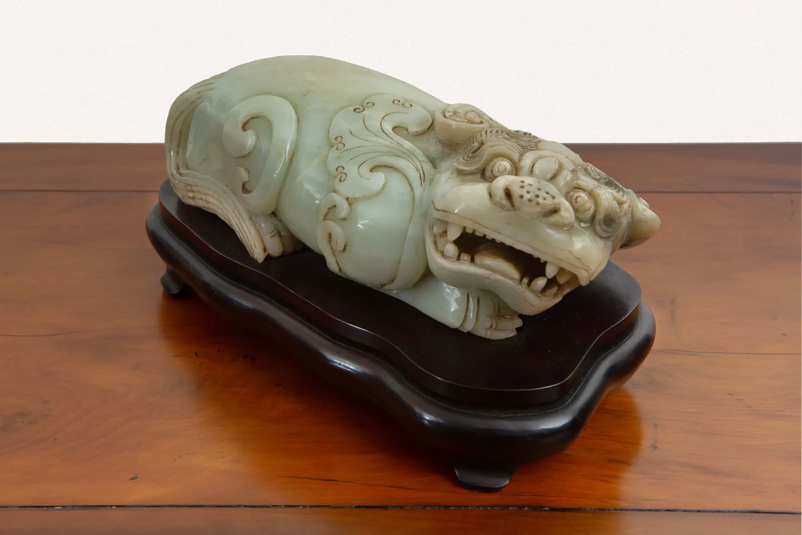 | Description | Taiwanese carving of a crouching fu dog, rendered in pale green nephrite. The muscular body coils with energy, tail wrapped tightly along the flank, while a fierce yet playful grin animates the face. Finely incised scrolls emphasize movement, conveying vigilance, protection, and readiness to pounce. |