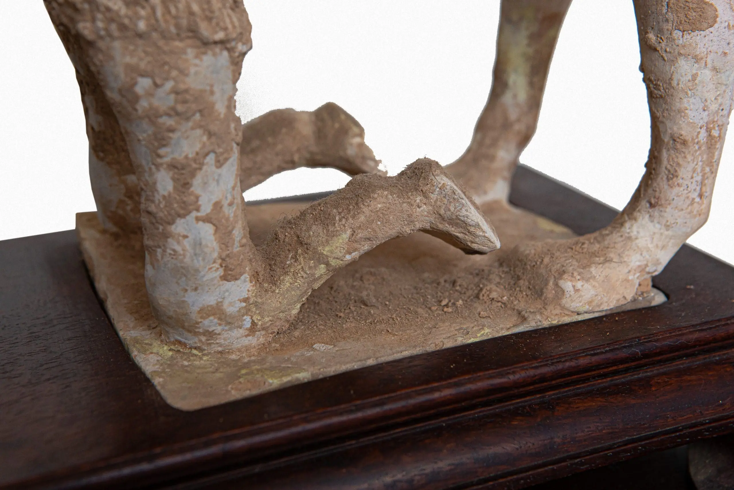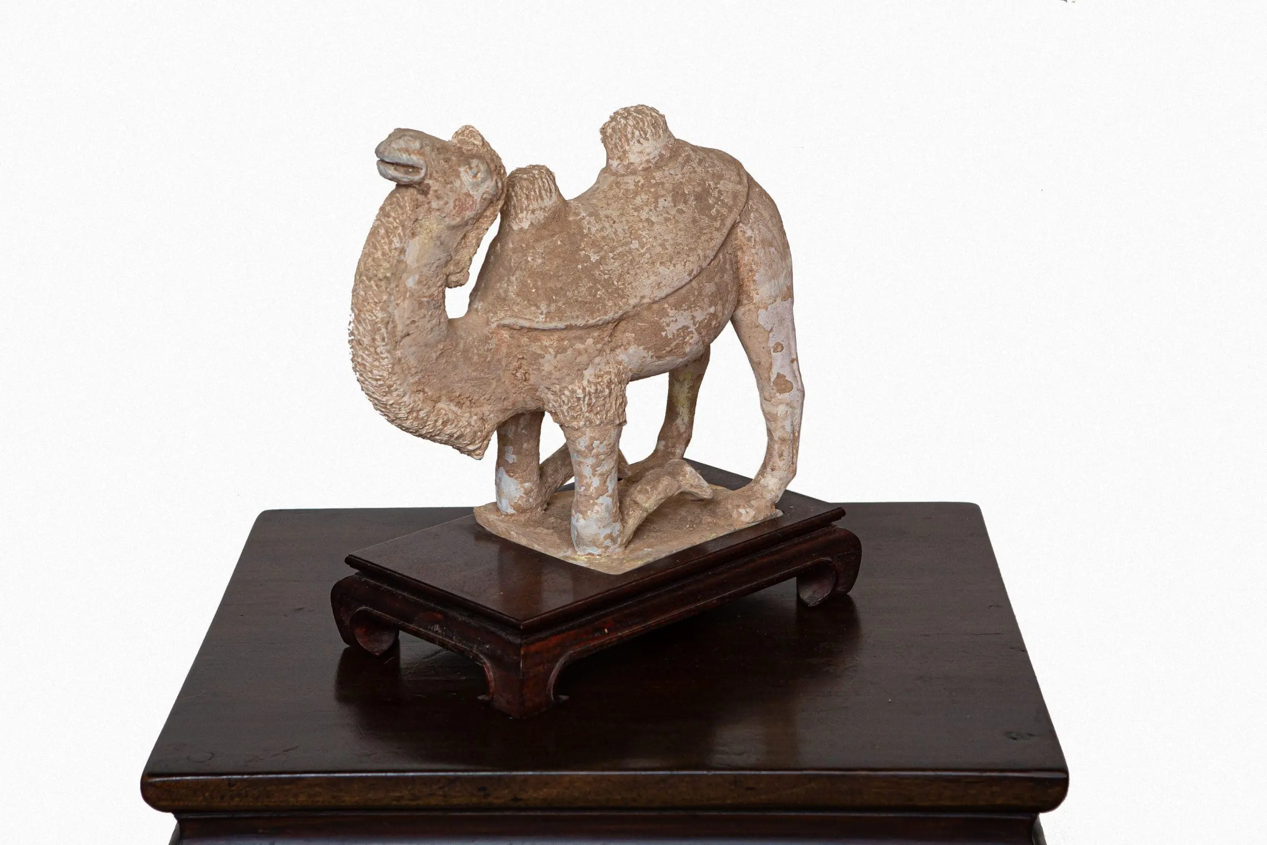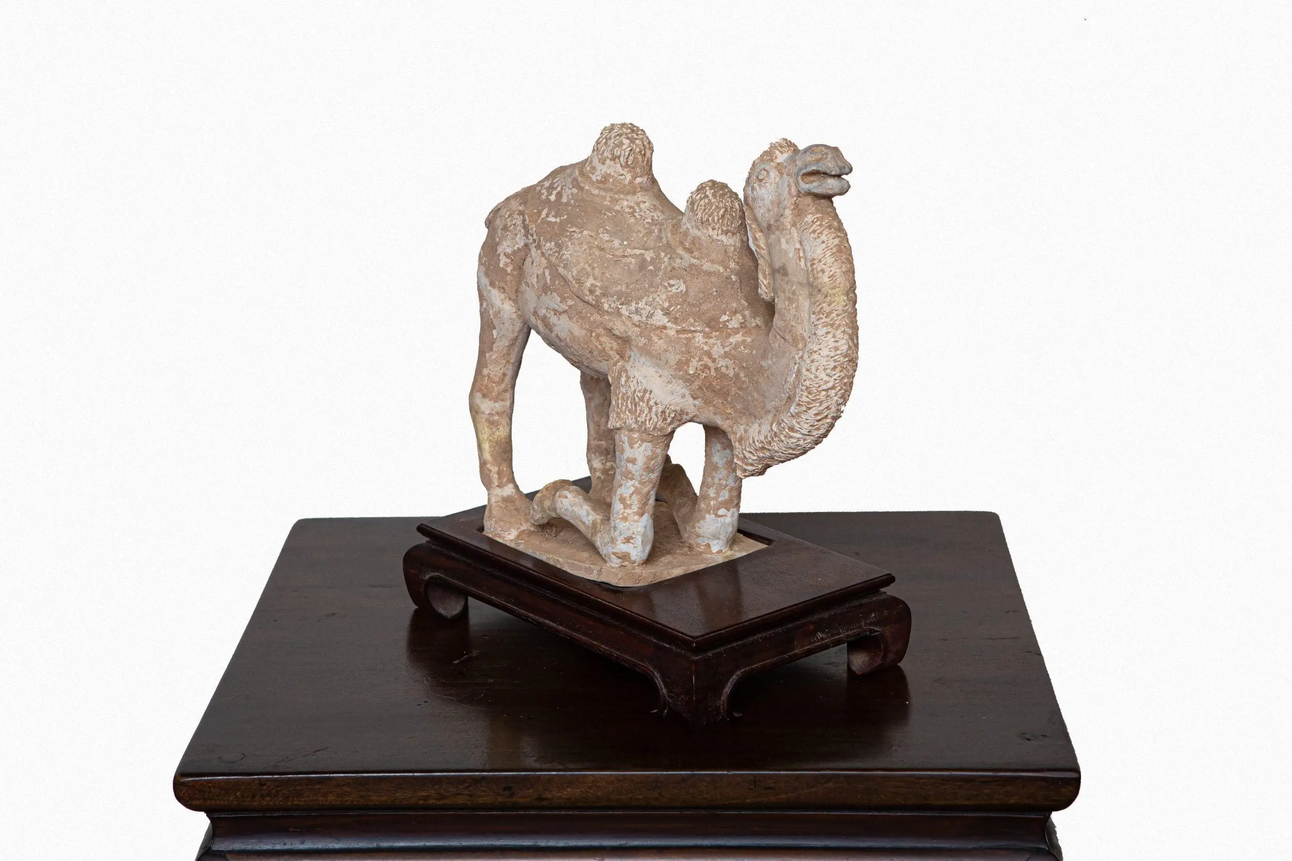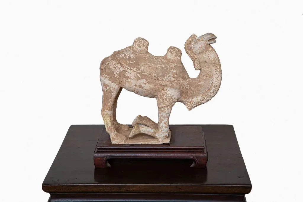 | Description | Tang dynasty ceramic camel depicted kneeling, its body modeled with naturalistic detail. Finished in a biscuit glaze with areas of earthy encrustation from long burial, the figure reflects the importance of camels in Silk Road trade. |