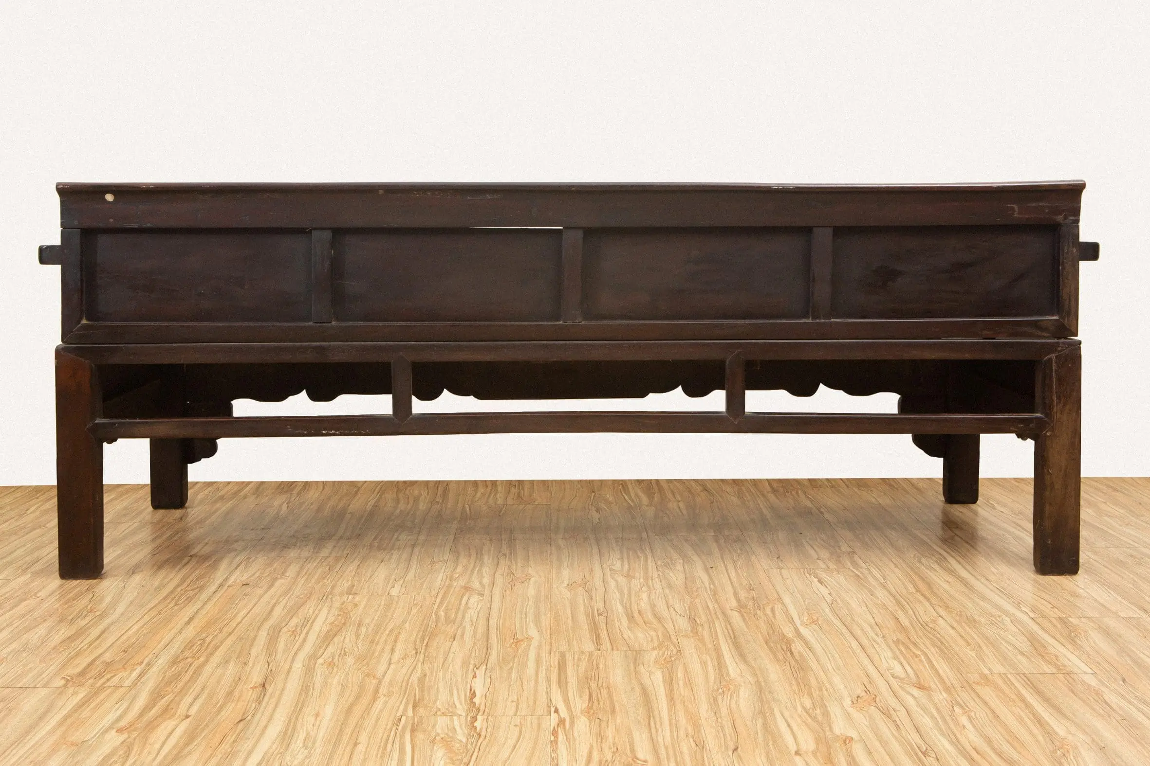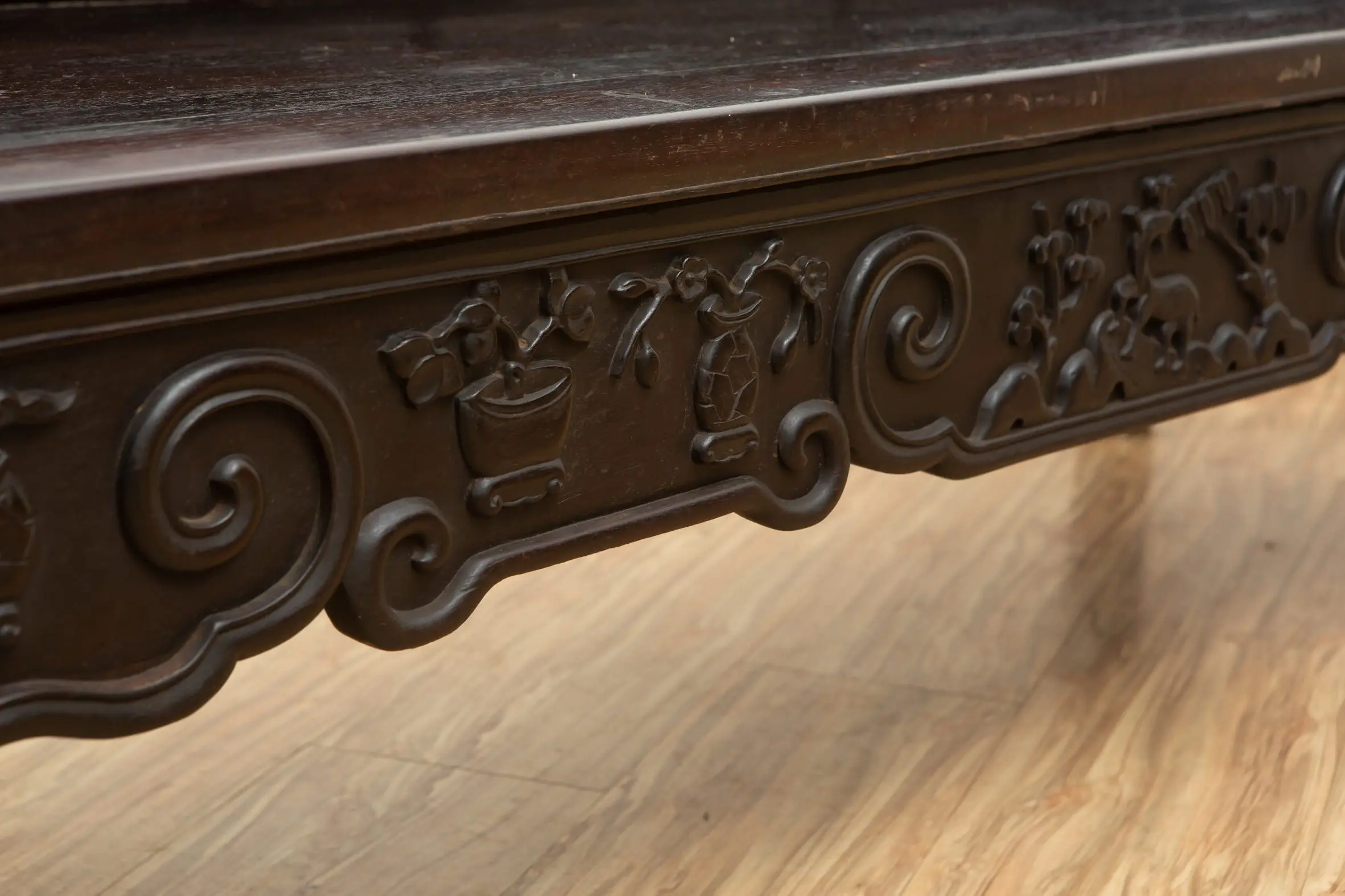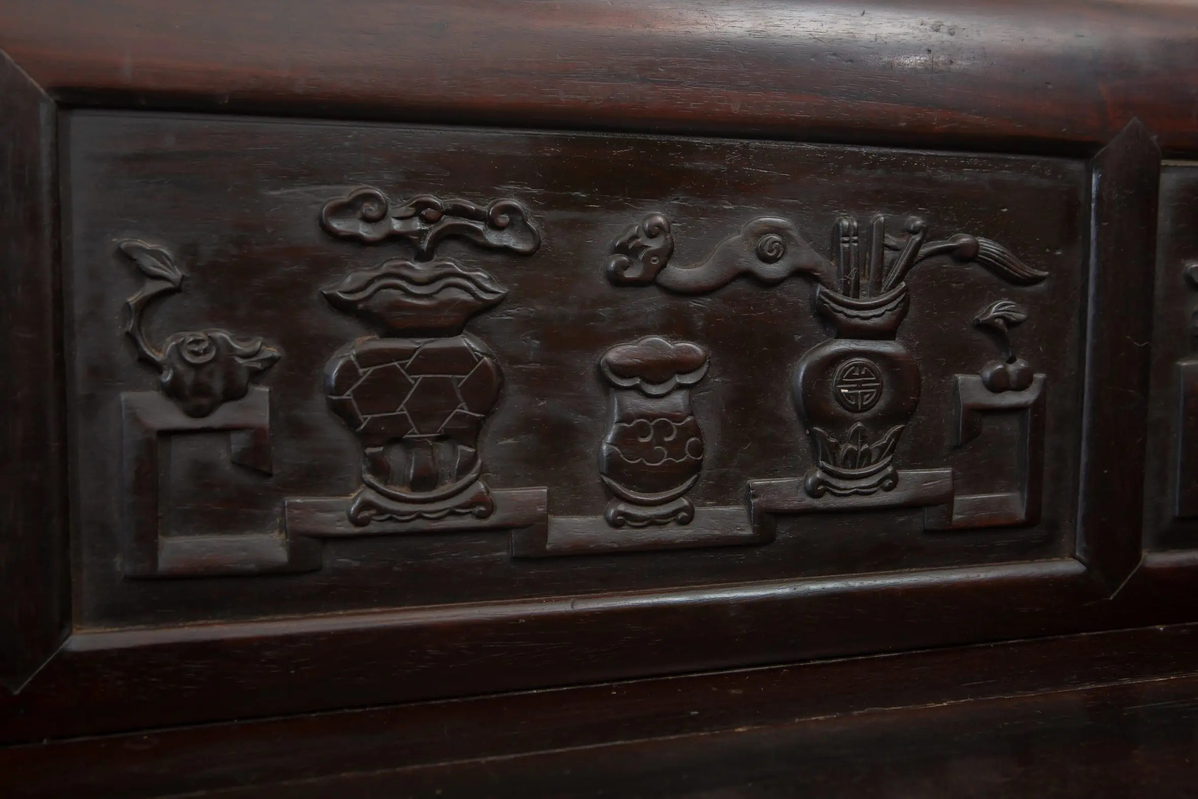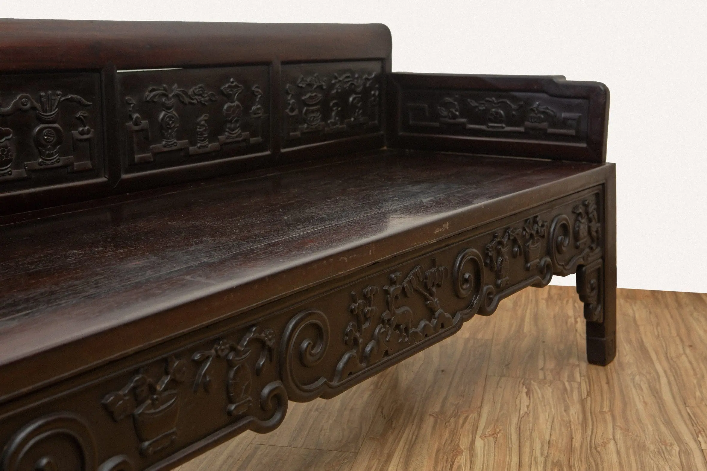 | Description | Opium Bench: An opium bench with repousse carvings of vases and flowers on the side and back panels as well as the apron. |
