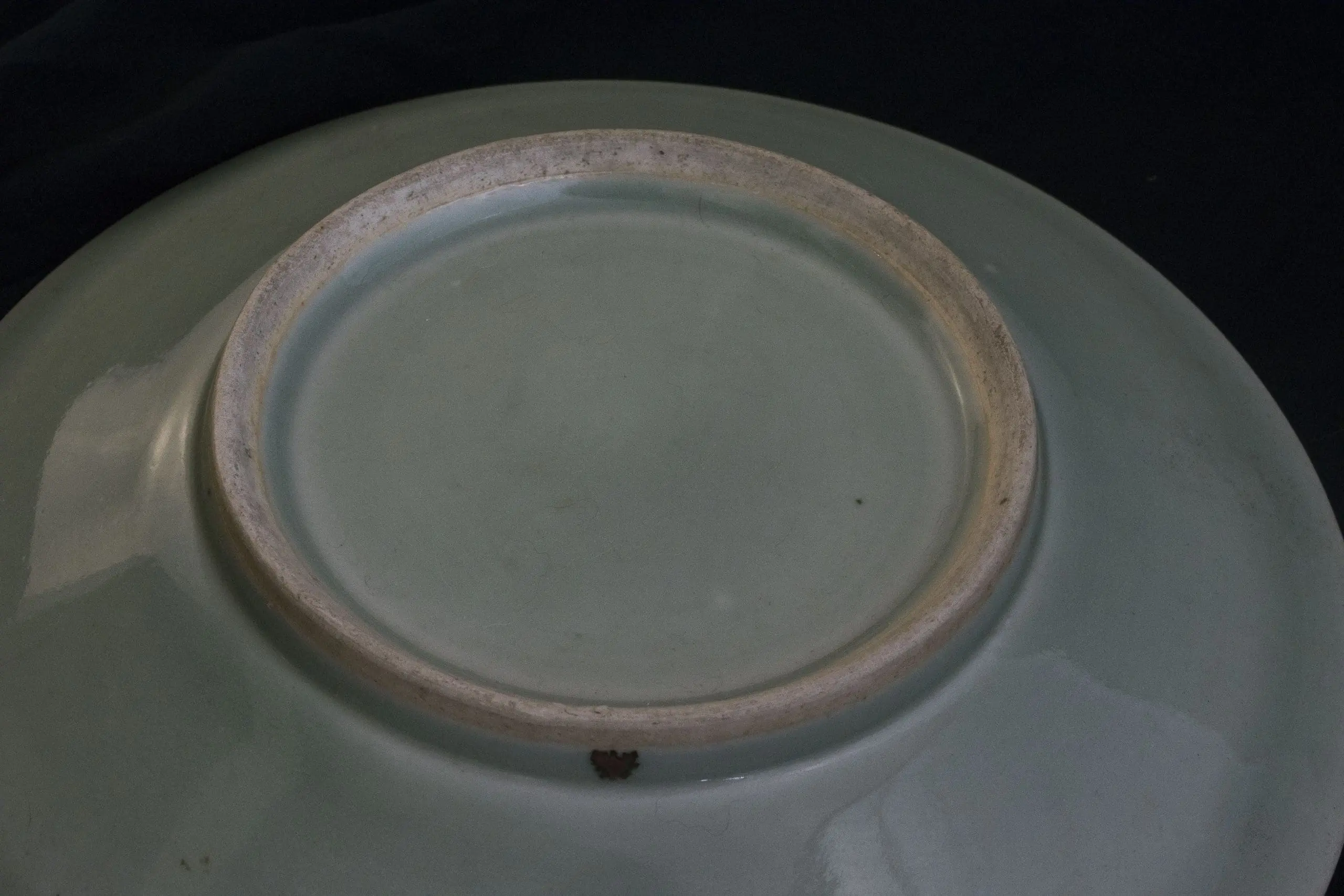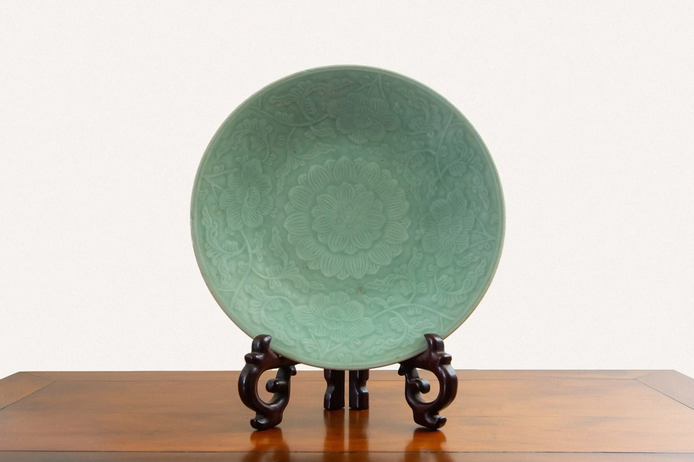 | Description | Large late Qing celadon plate with finely carved floral designs adorning the front. The central blossom radiates outward into scrolling foliage, all beneath a soft green glaze with subtle crackle. |