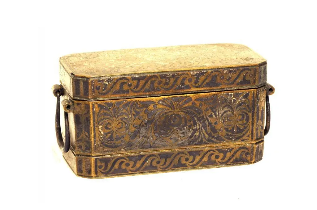 | Description | Silver and brass betel nut box with carved geometric designs, lidded partitions inside |