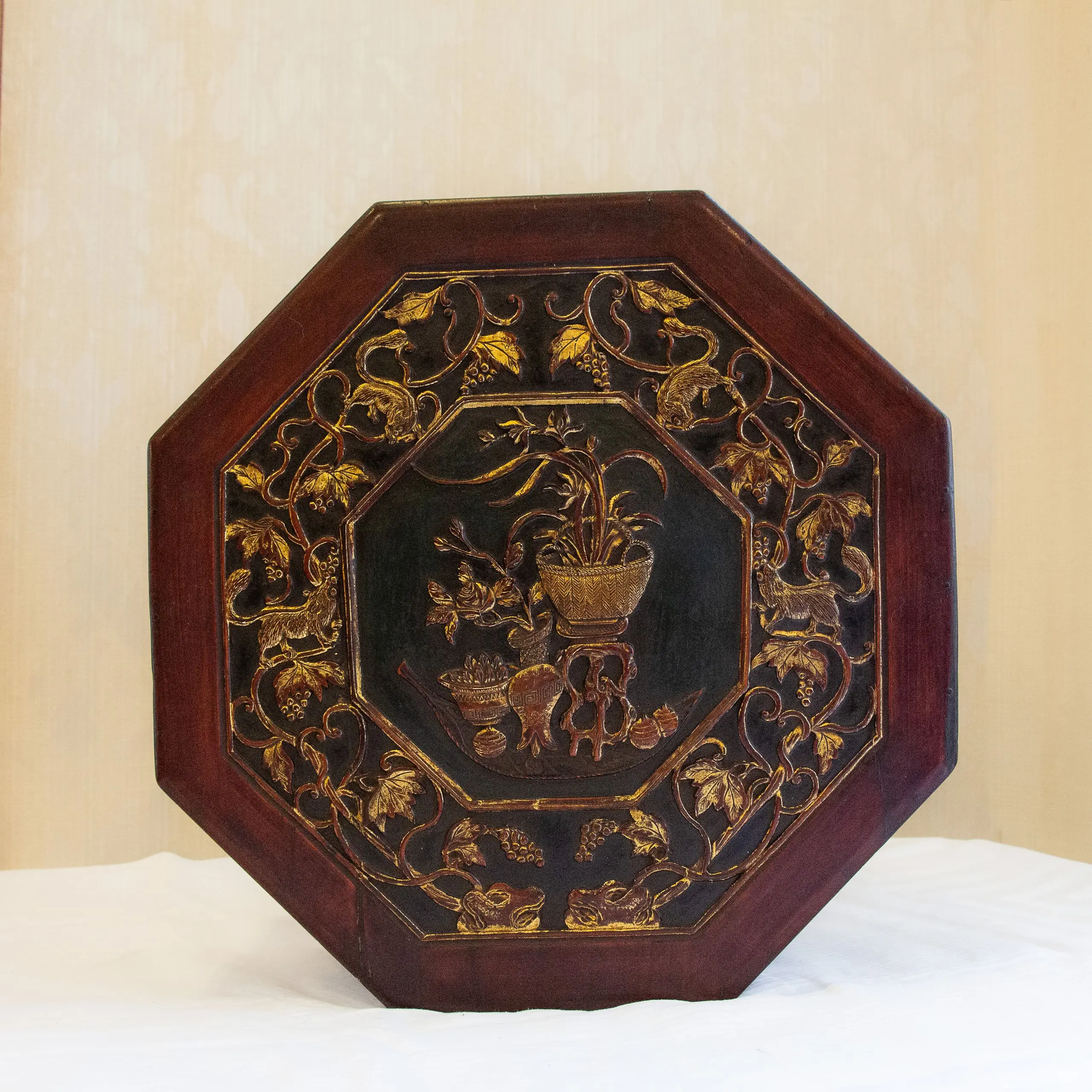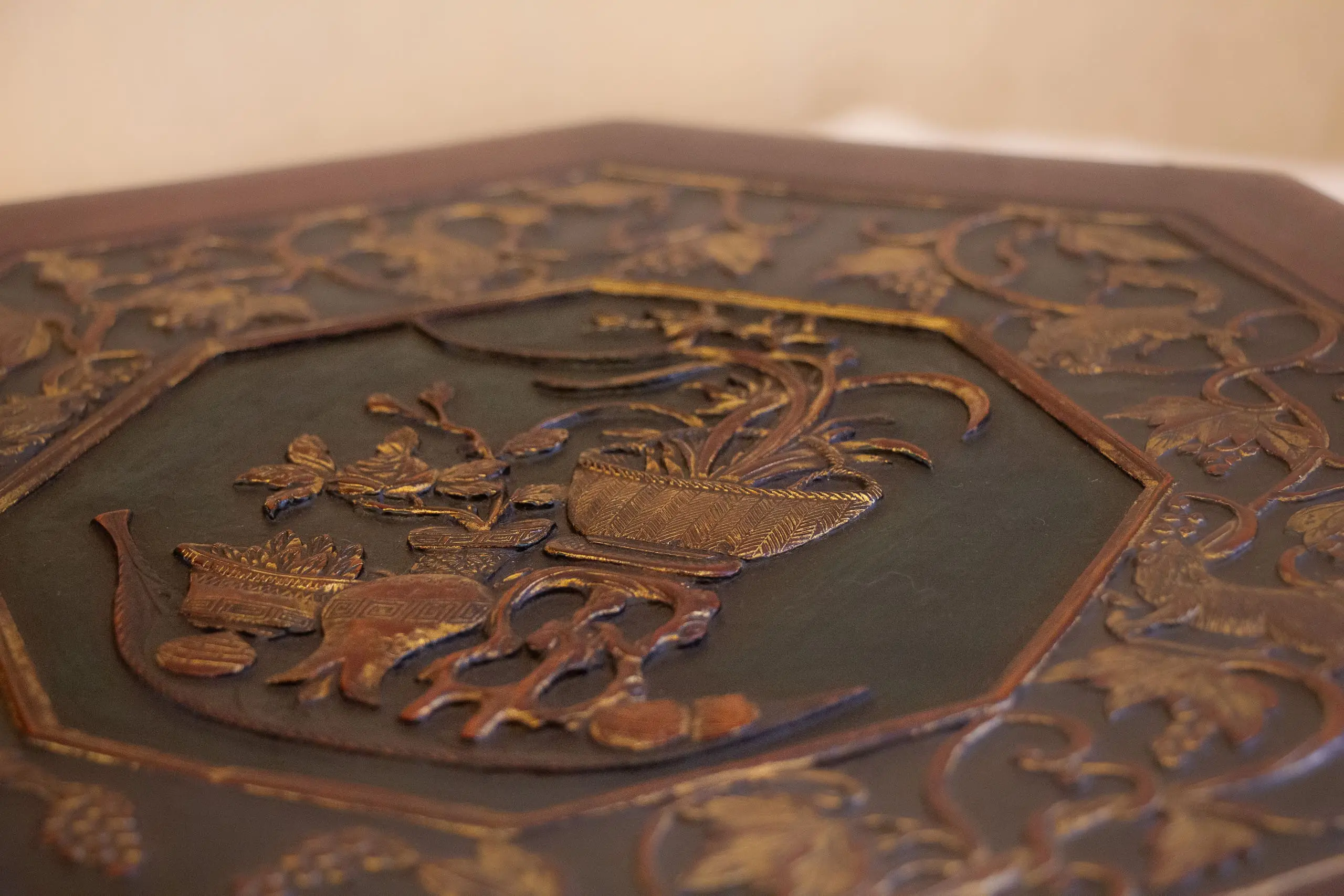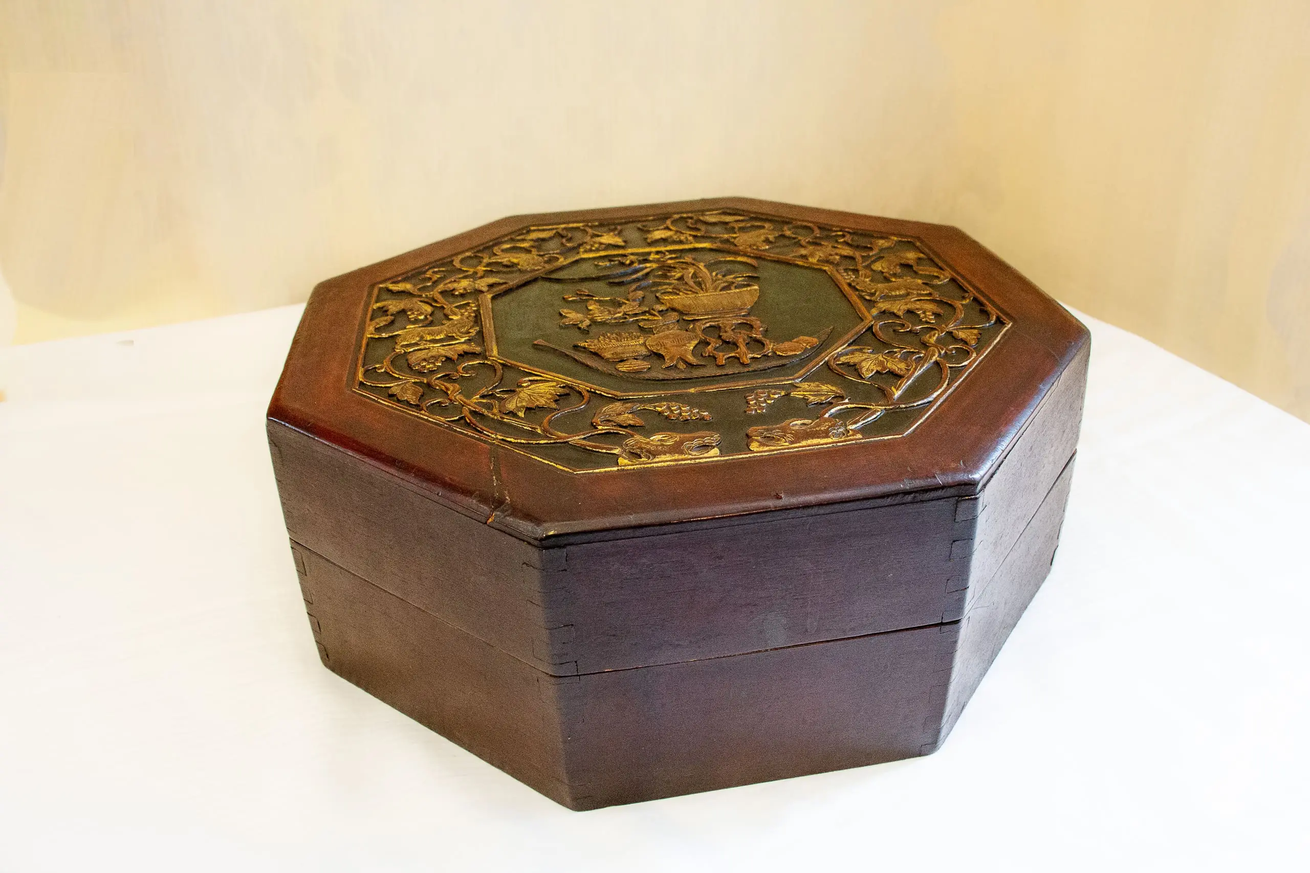 | Description | Lacquered hexagonal offering box, with gilded repoussé carvings of grape vines, vases, and flowers on a green lacquer ground on the lid, brown lacquer sides.. |
