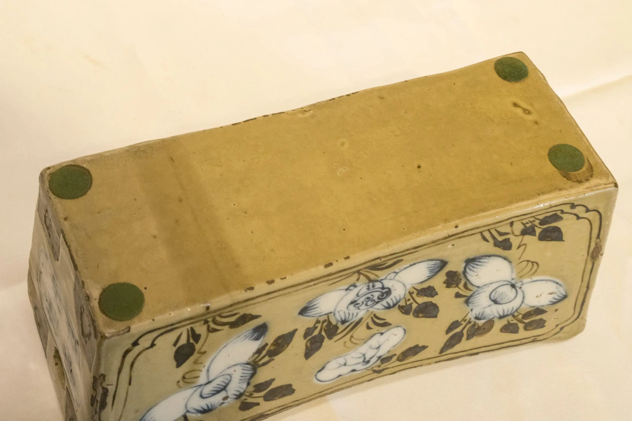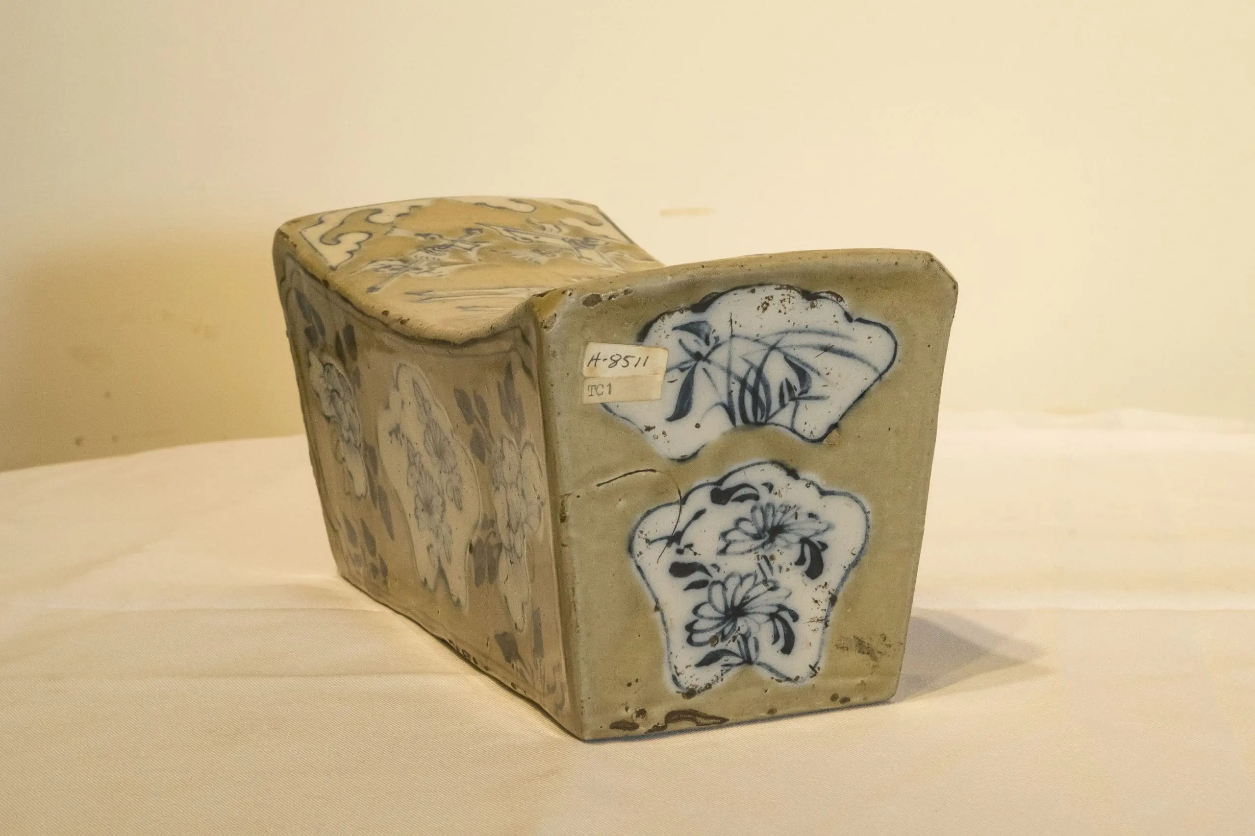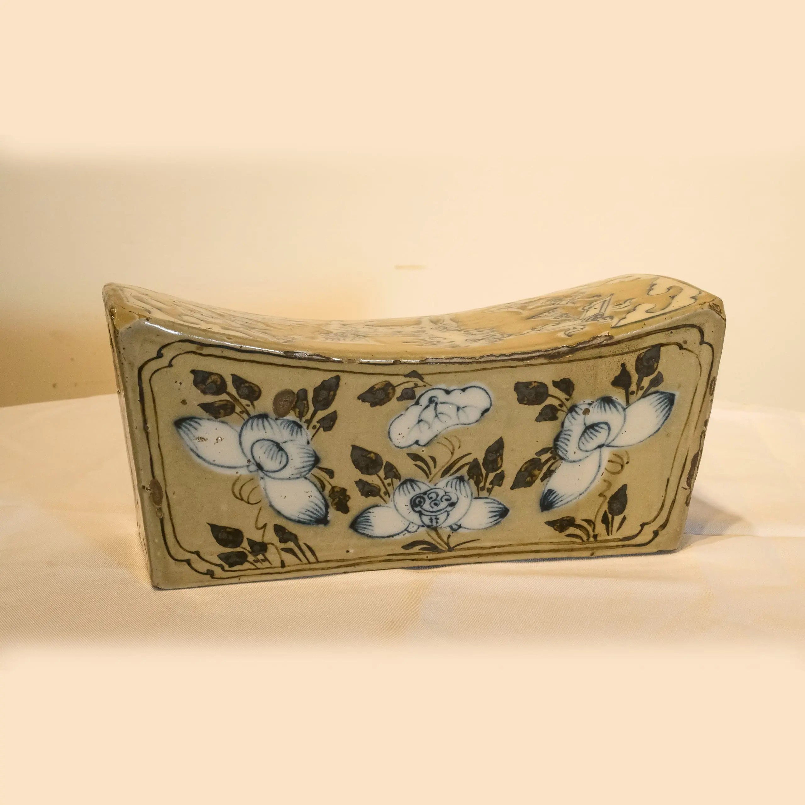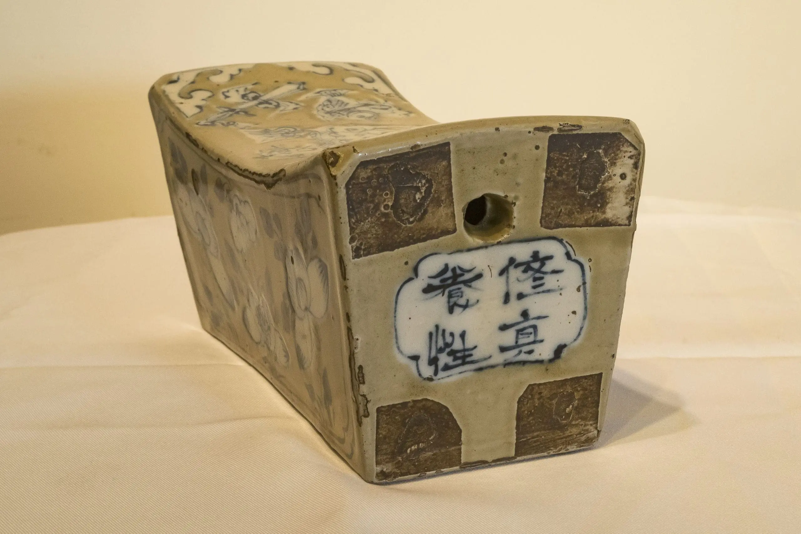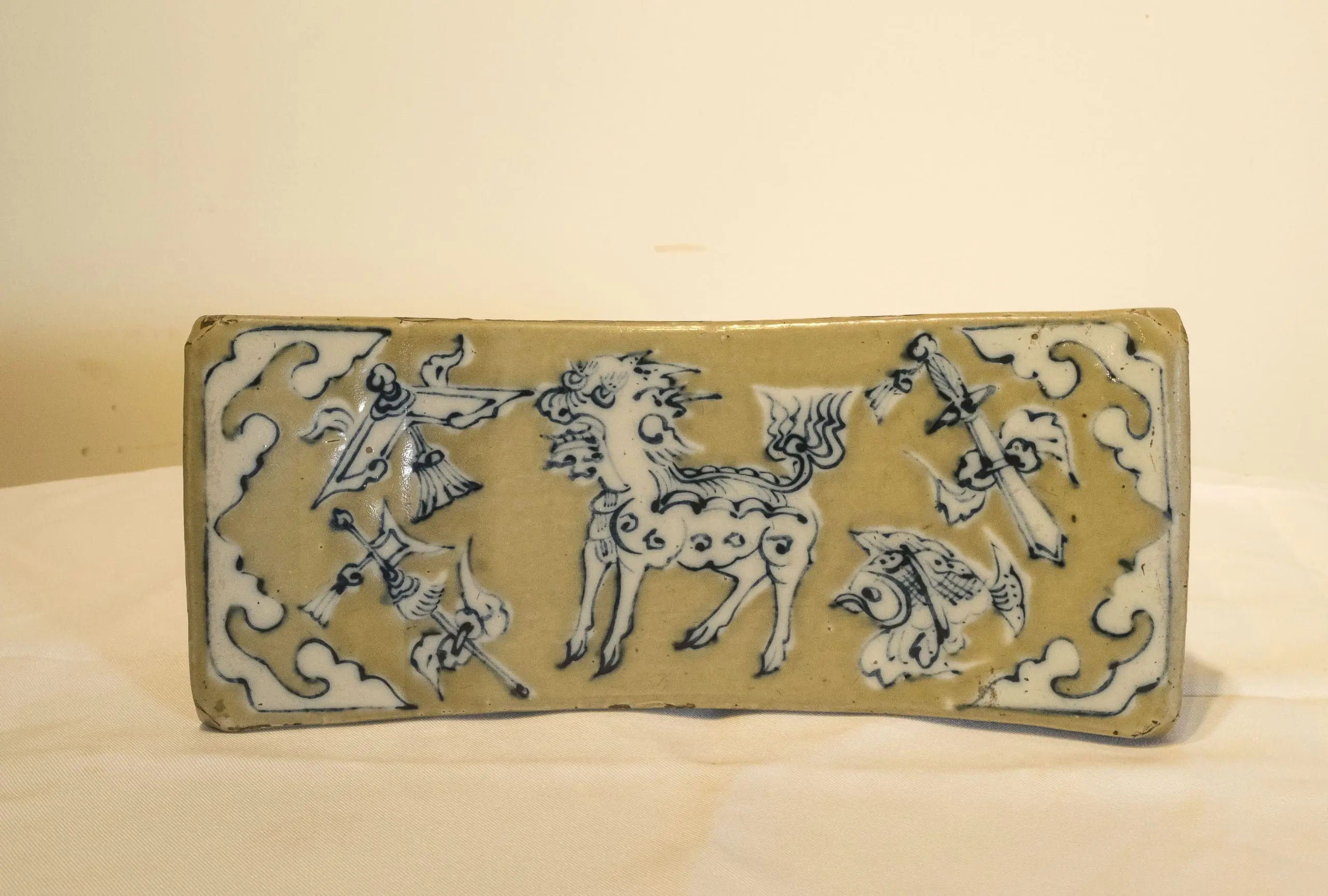 | Description | Cizhou pillow. Oblong, concave top with chamfered corners, decorated with overglaze cobalt blue, iron brown and white slip, all against a pale brown ground, top in design of a central Chiling, corners with auspicious emblems and cloud designs. |