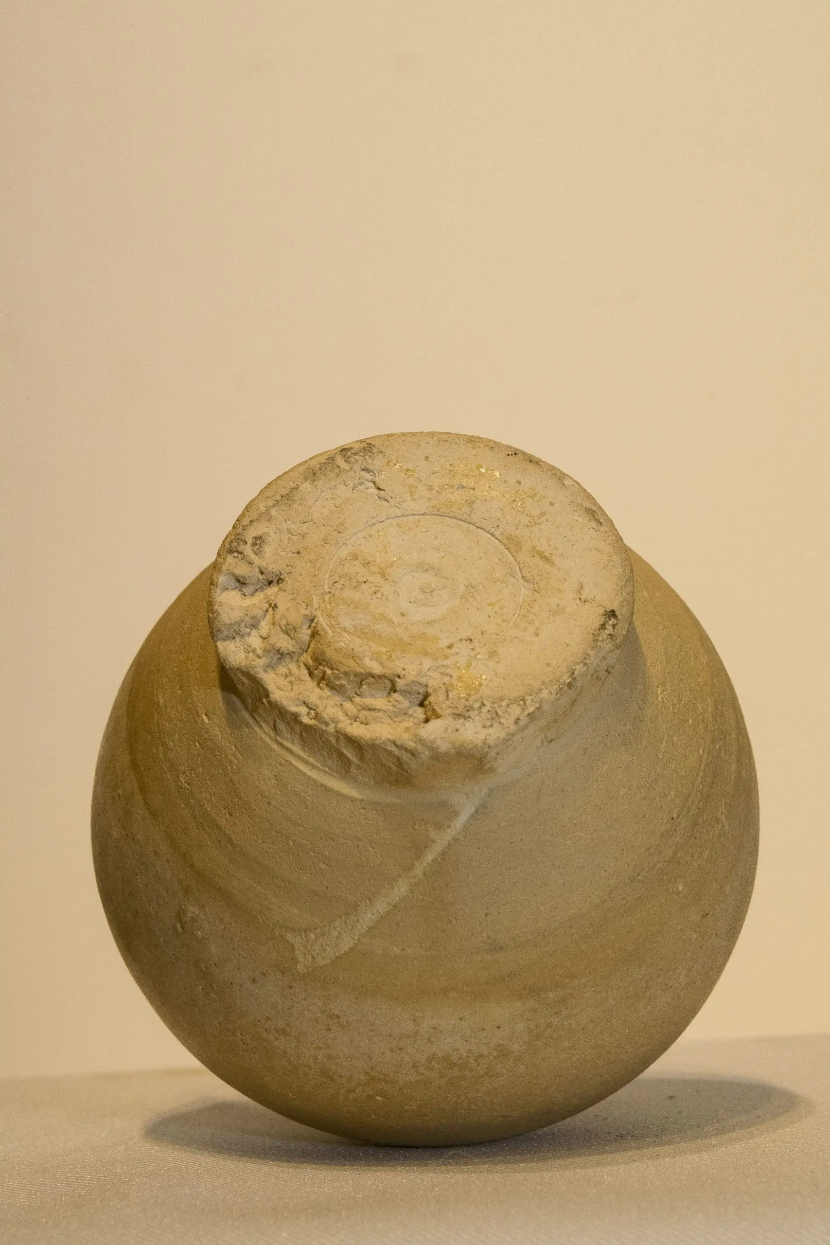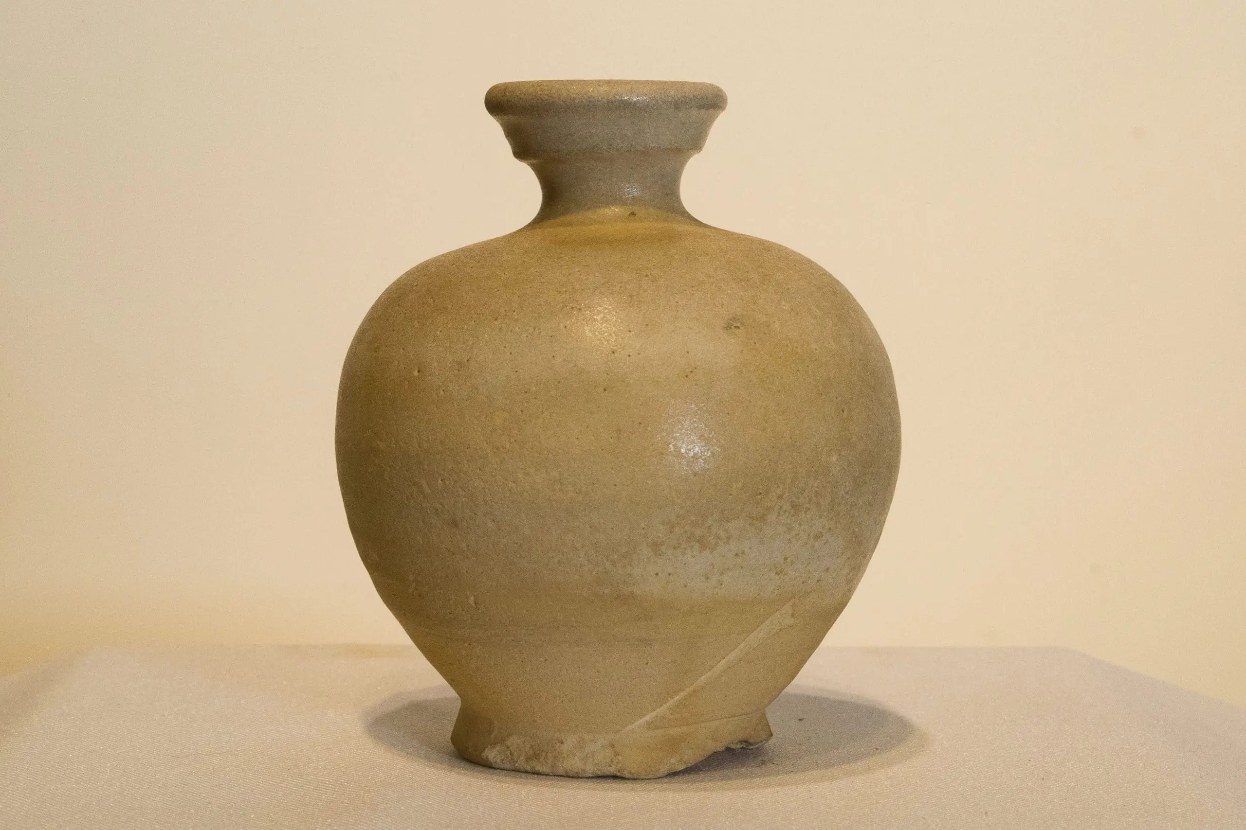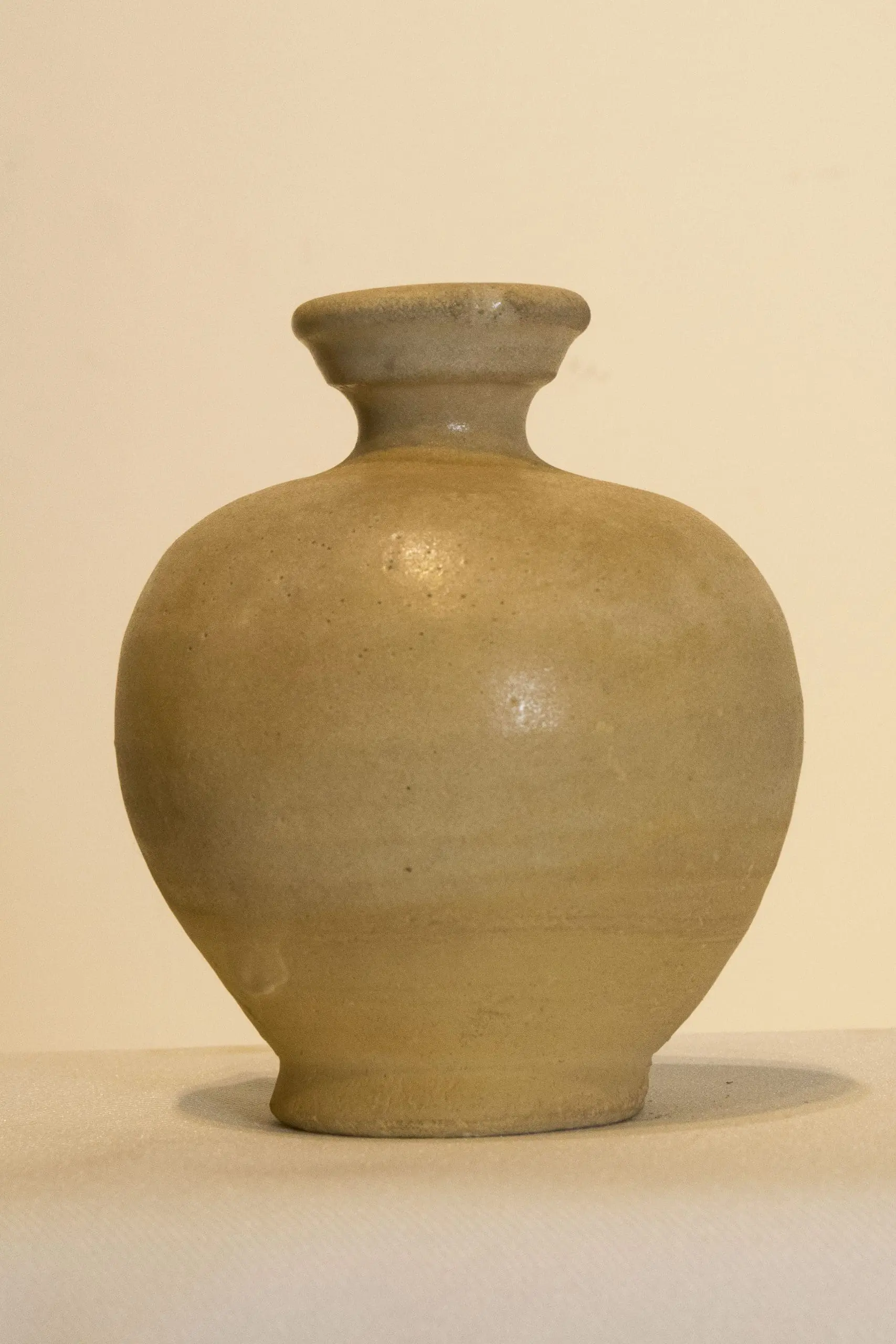 | Description | Bulbous‐bodied white ware jarlet with short neck, cup-form mouth and softly rolled lip, resting on an everted foot above an unglazed flat base. The warm off-white glaze exhibits subtle variation and fine surface texture. |