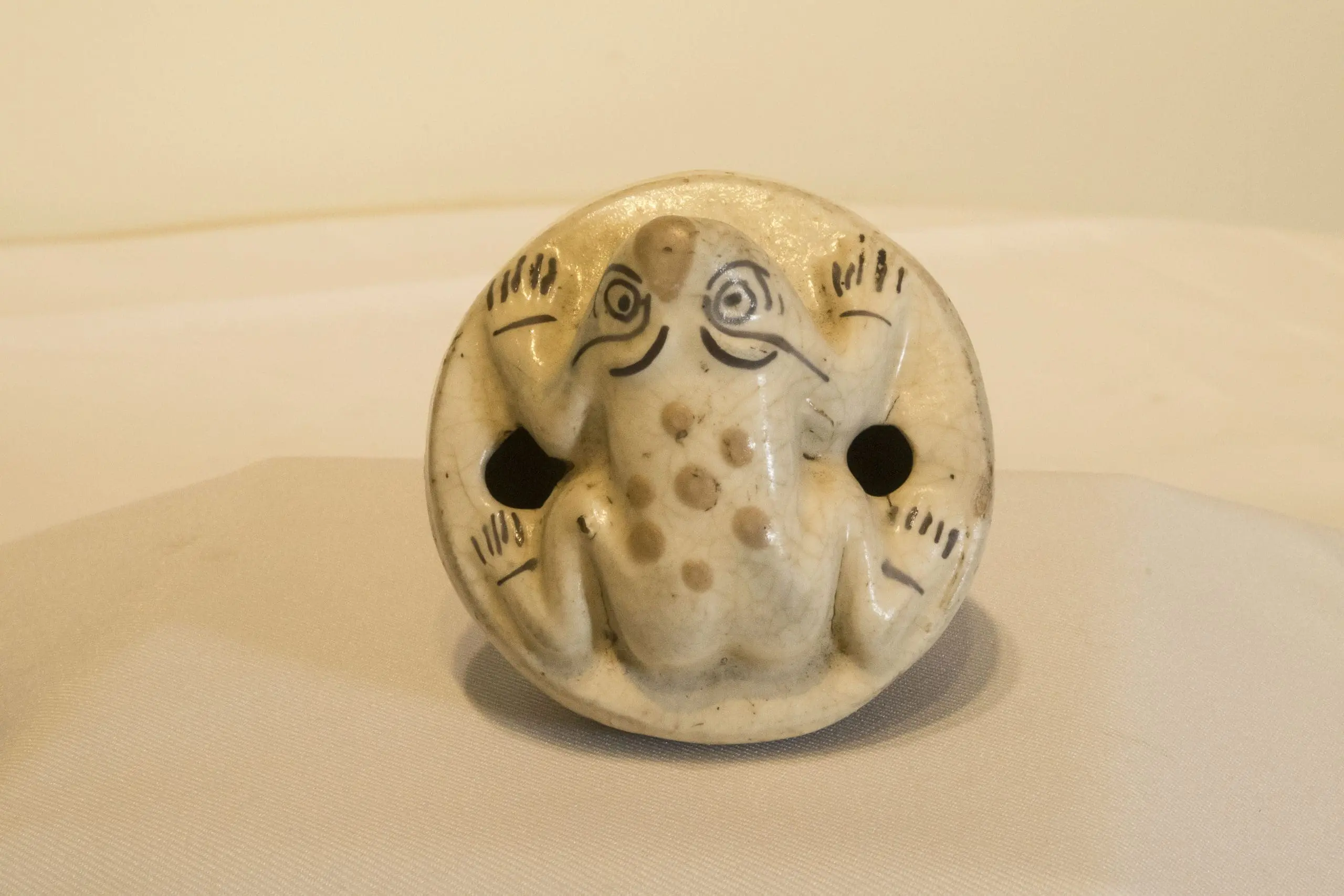| Description | Cizhou water dripper in the form of a frog seated on a lotus pod. Vertically ribbed lower body terminating in a short slightly inverted foot, all washed in brown. Upper body with thick cream ground, underglaze brown detailing. |